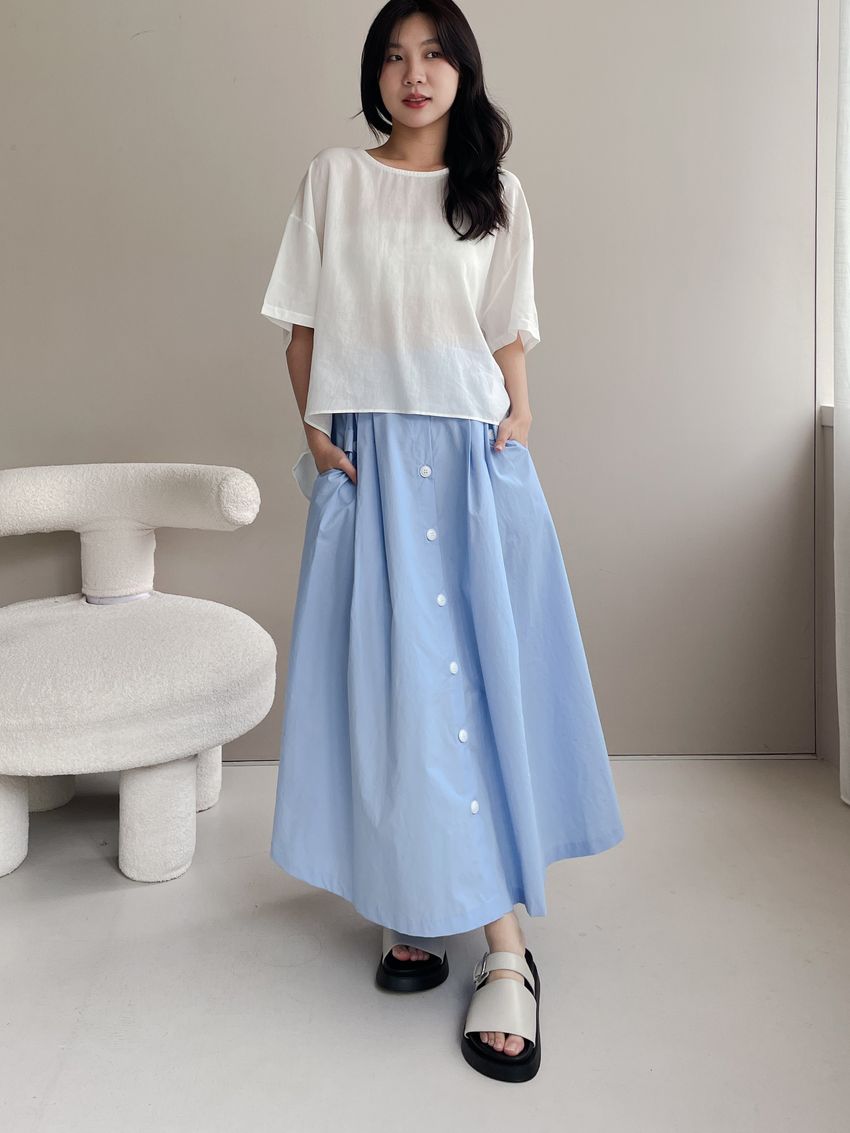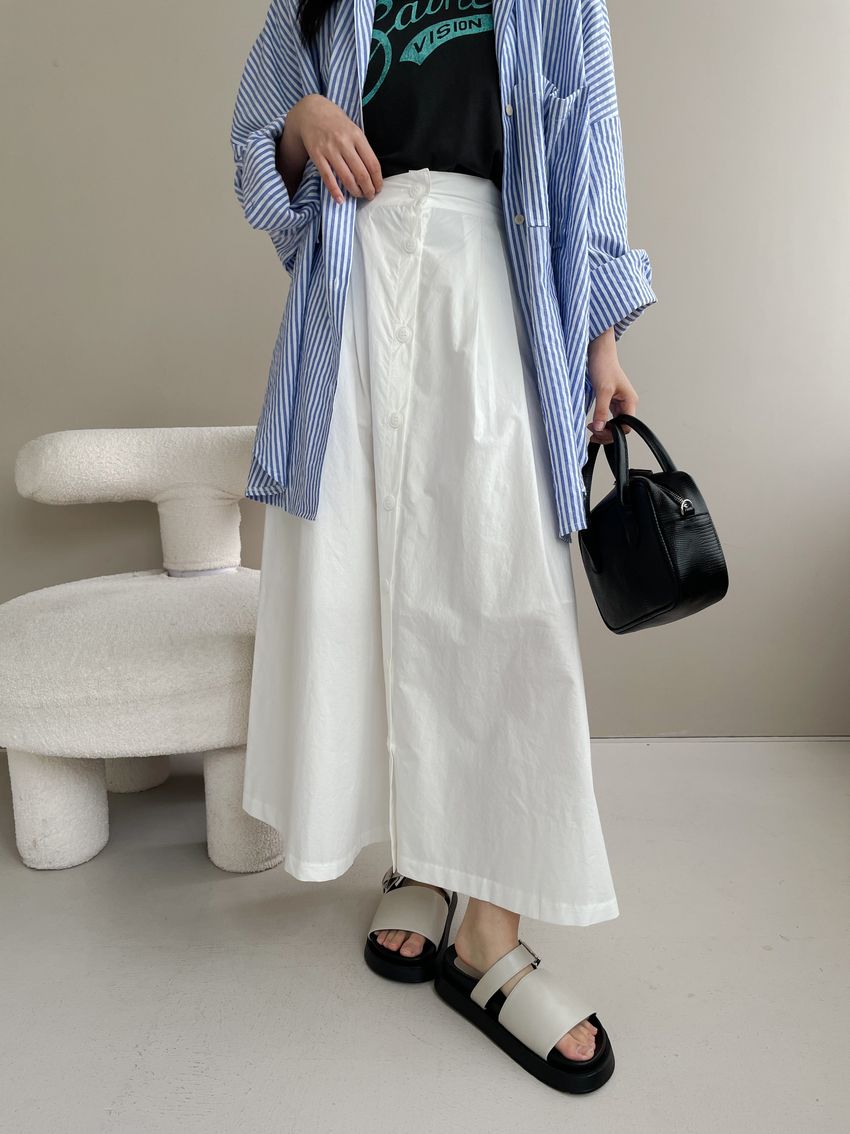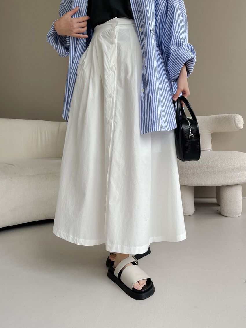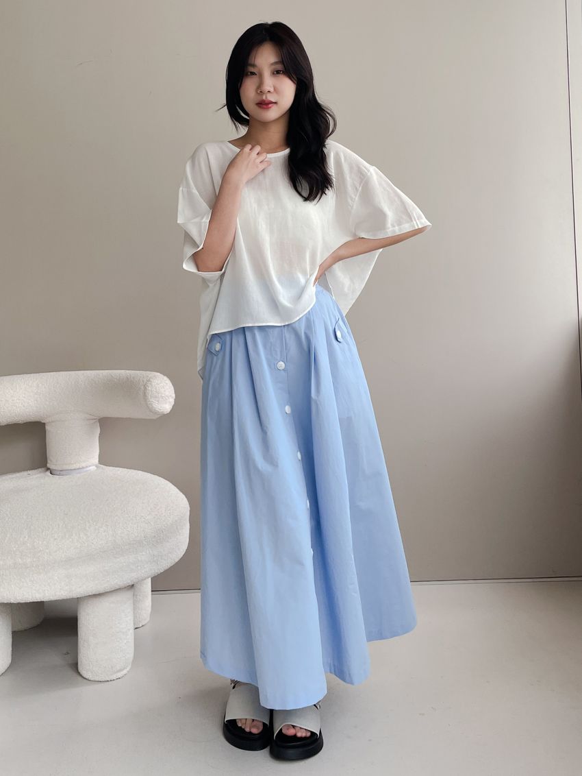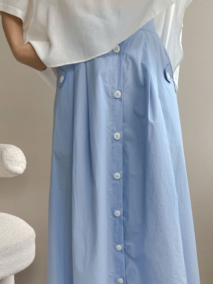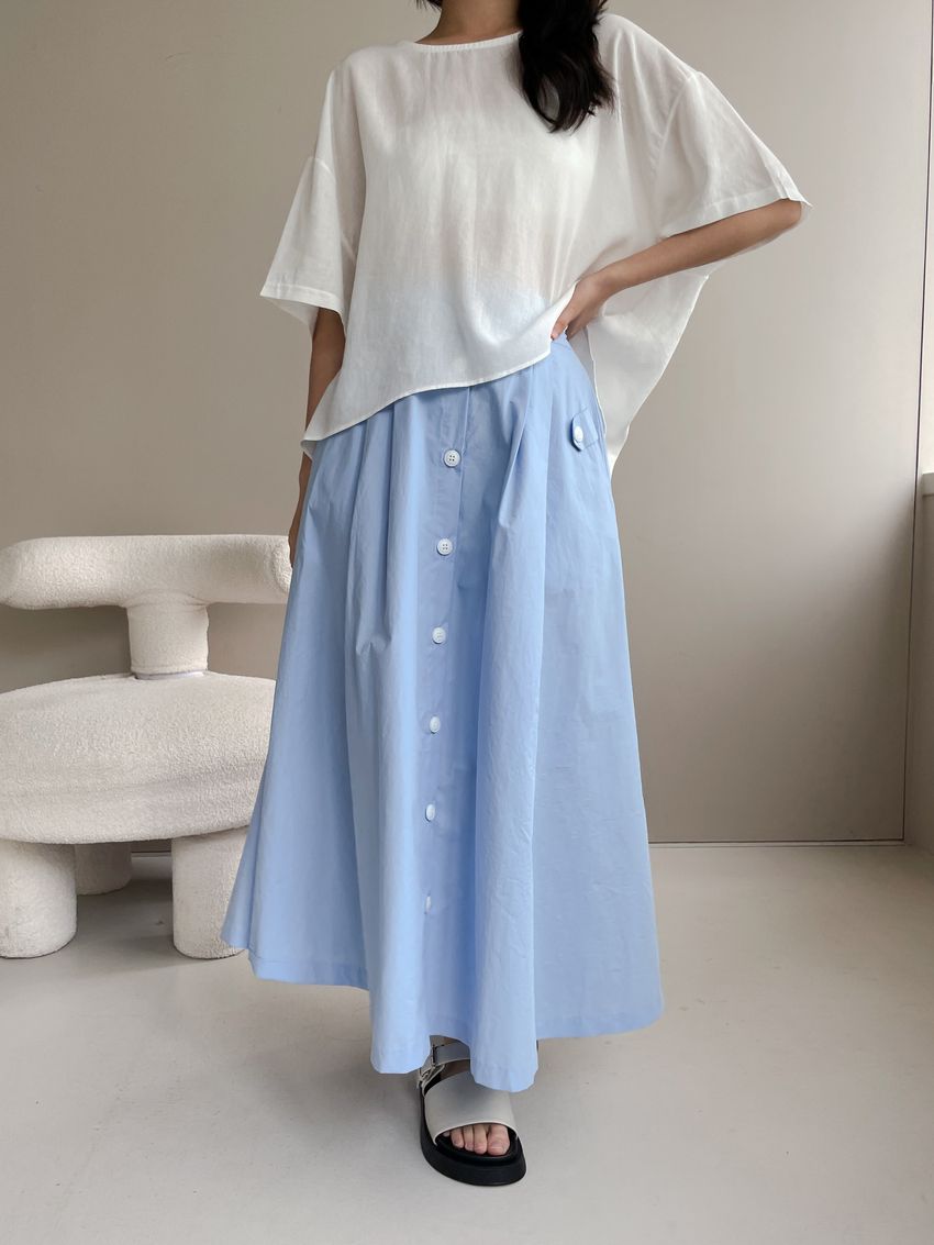 100%cotton裙襬夠圓帶點澎澎感的圓長裙搭配白釦帶出夏天的清爽感薄料棉質 帶有挺度兩側口袋 後腰鬆緊有內裡 前排釦穿脫白色建議搭配淺色或膚色內褲白色 / 水藍色單一尺寸適合S~L號 腰圍29吋以內身形model / Yen - 159cm / 44kg 腰24 臀34