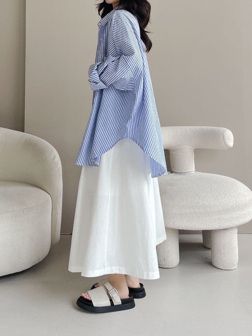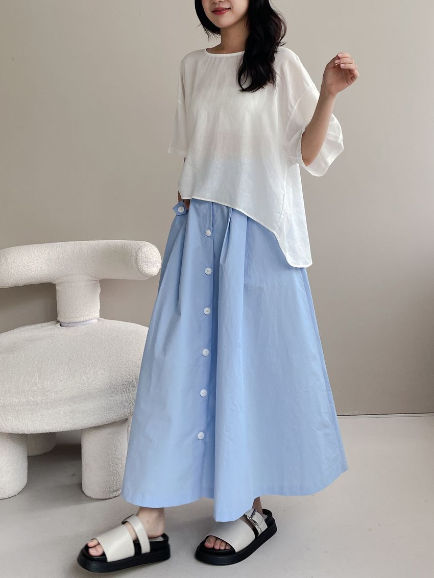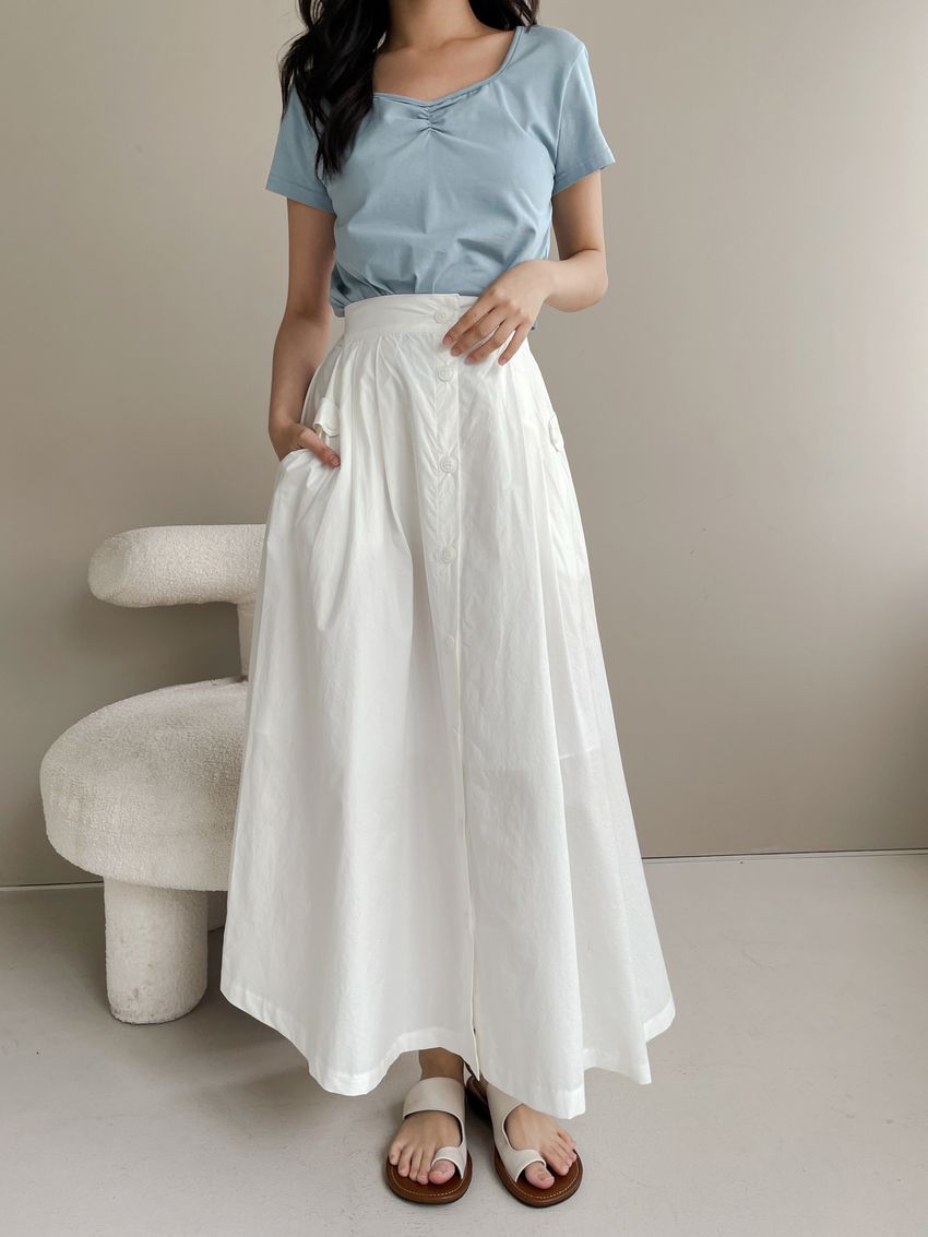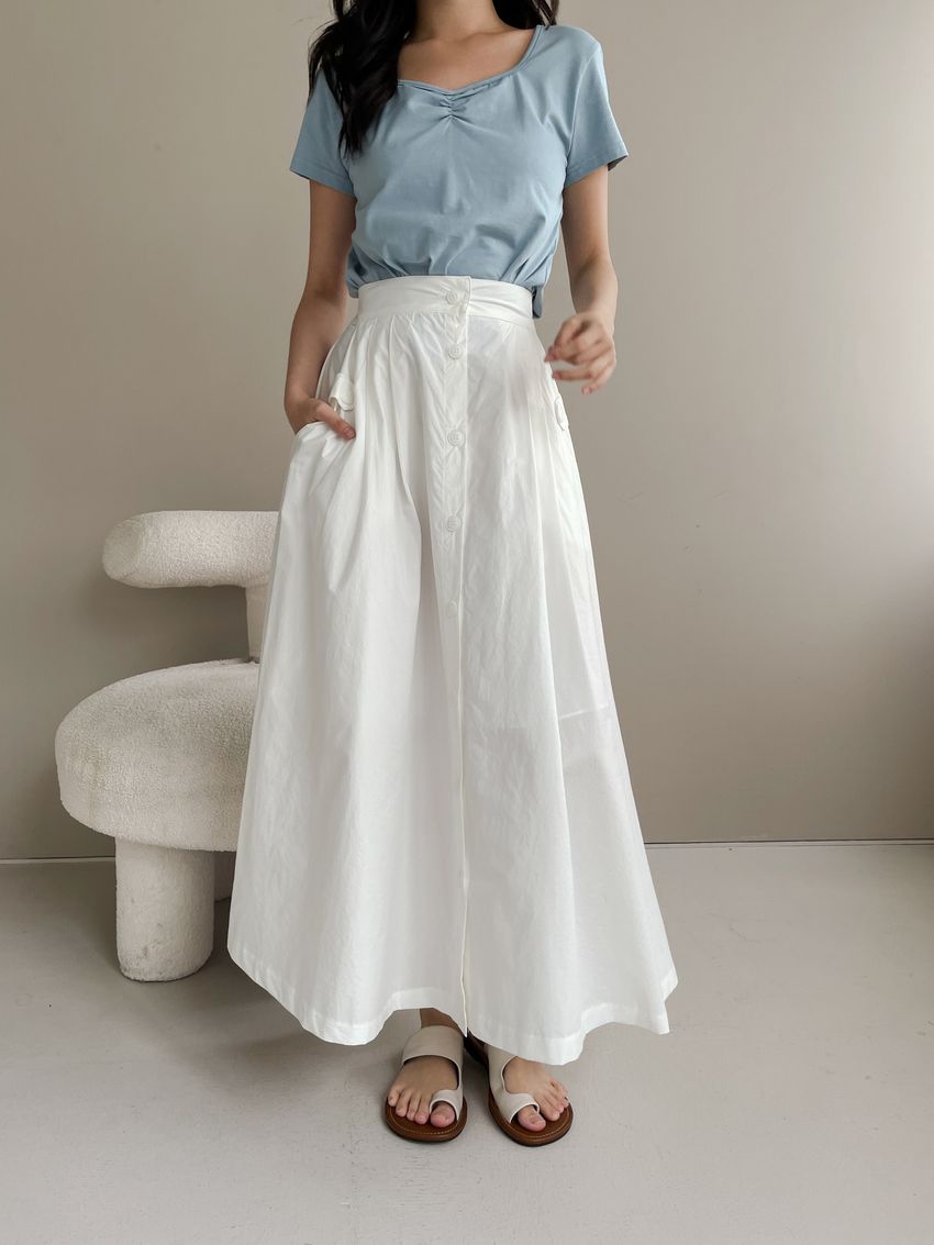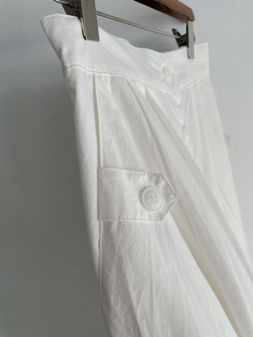 100%cotton裙襬夠圓帶點澎澎感的圓長裙搭配白釦帶出夏天的清爽感薄料棉質 帶有挺度兩側口袋 後腰鬆緊有內裡 前排釦穿脫白色建議搭配淺色或膚色內褲白色 / 水藍色單一尺寸適合S~L號 腰圍29吋以內身形model / Yen - 159cm / 44kg 腰24 臀34