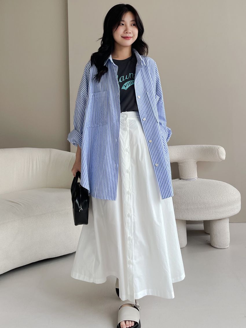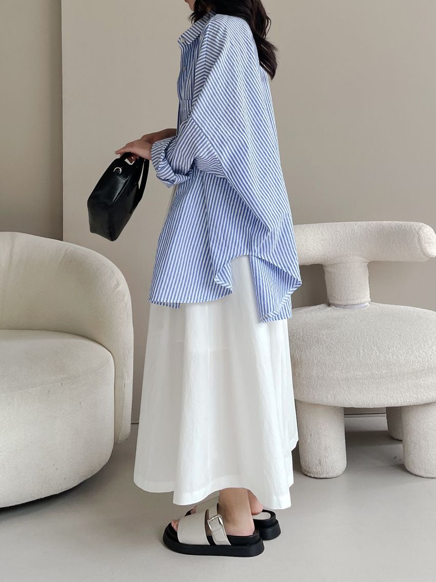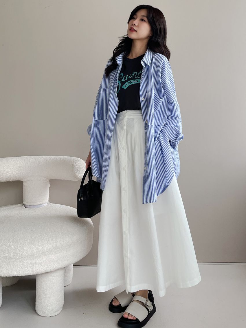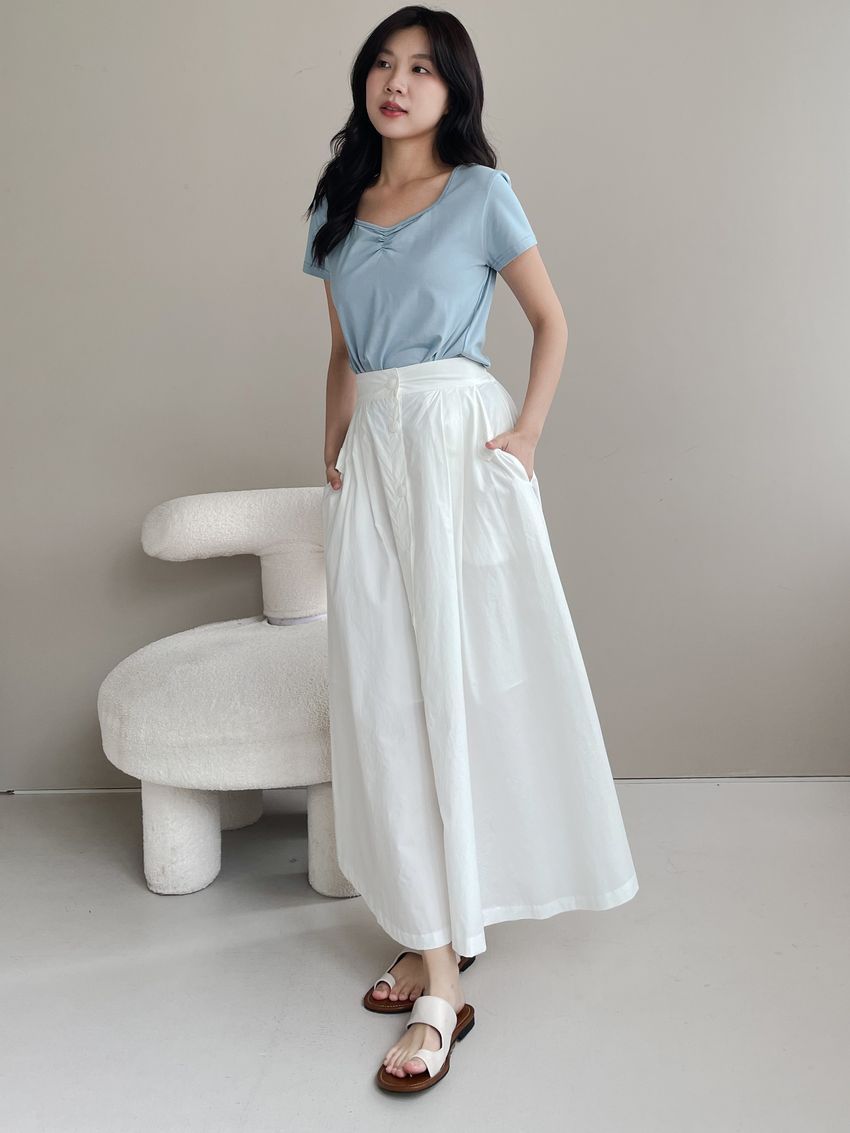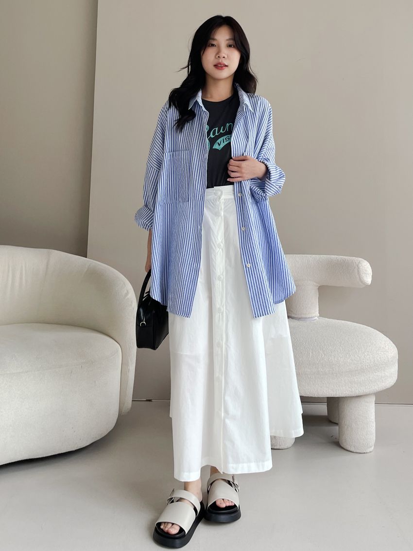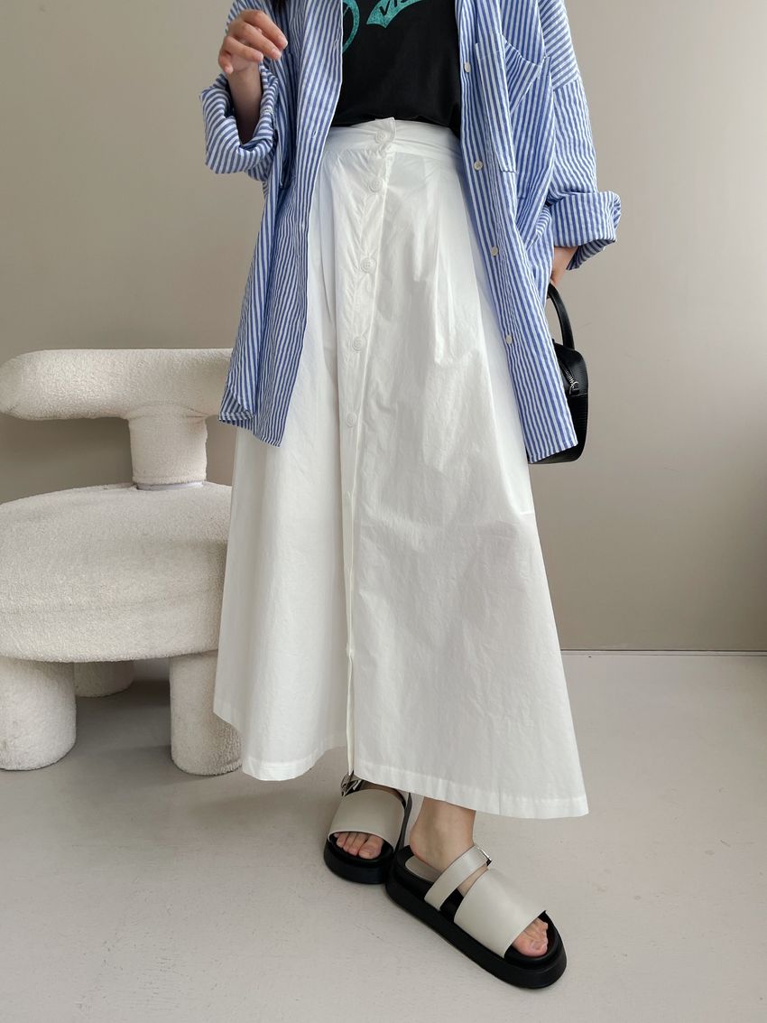 100%cotton裙襬夠圓帶點澎澎感的圓長裙搭配白釦帶出夏天的清爽感薄料棉質 帶有挺度兩側口袋 後腰鬆緊有內裡 前排釦穿脫白色建議搭配淺色或膚色內褲白色 / 水藍色單一尺寸適合S~L號 腰圍29吋以內身形model / Yen - 159cm / 44kg 腰24 臀34