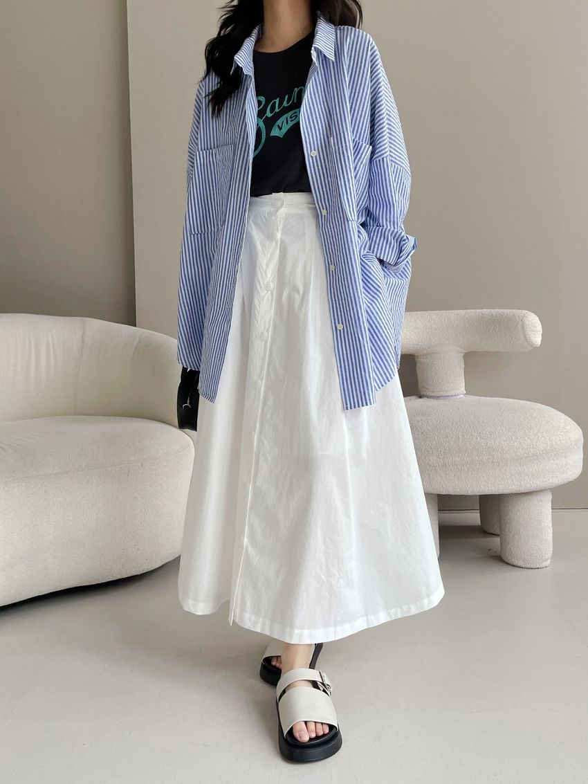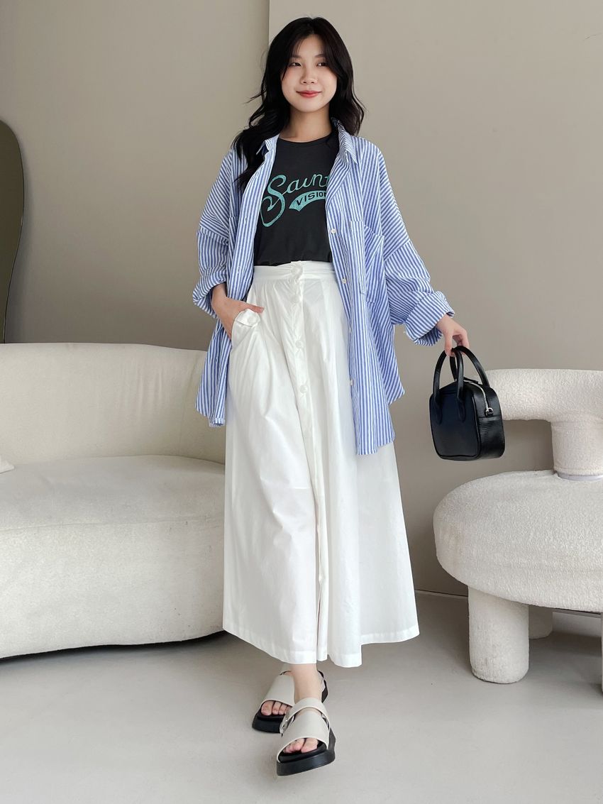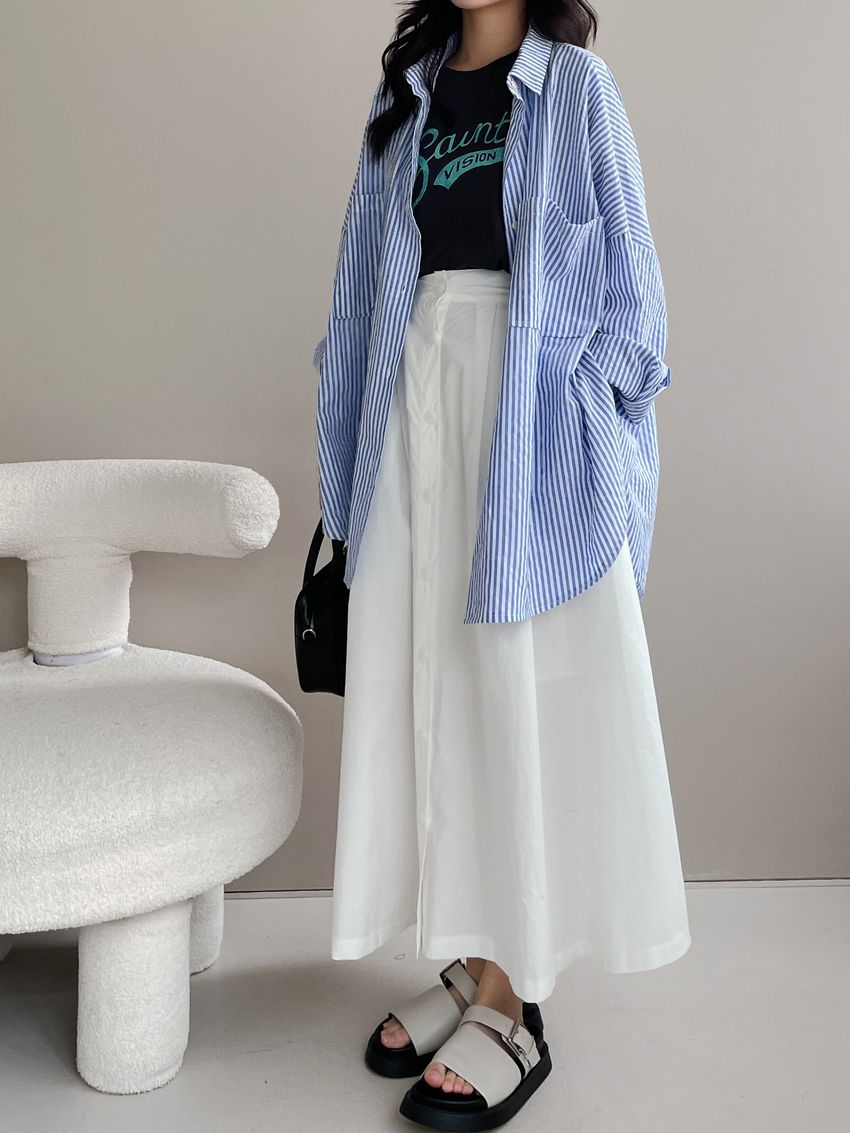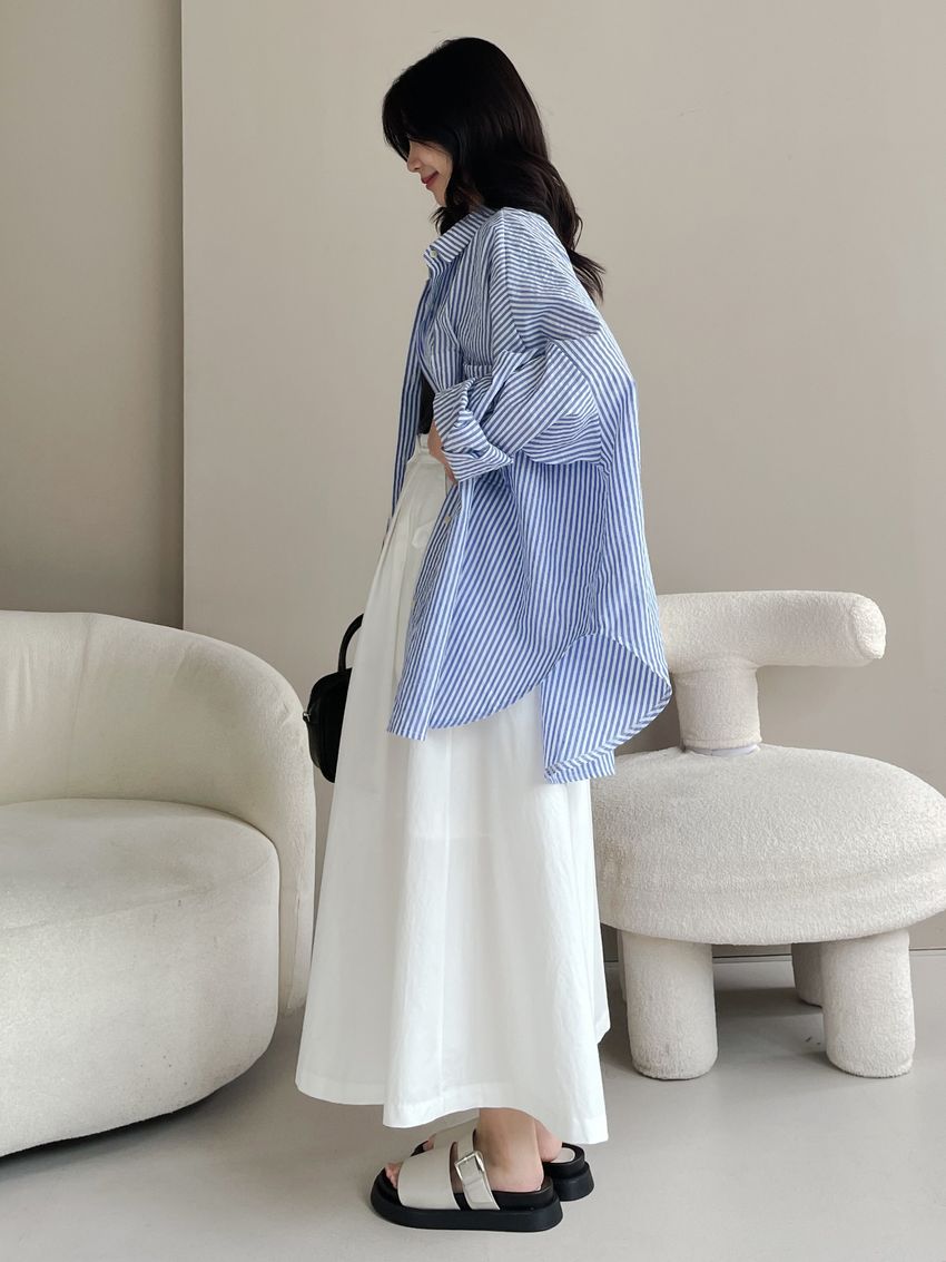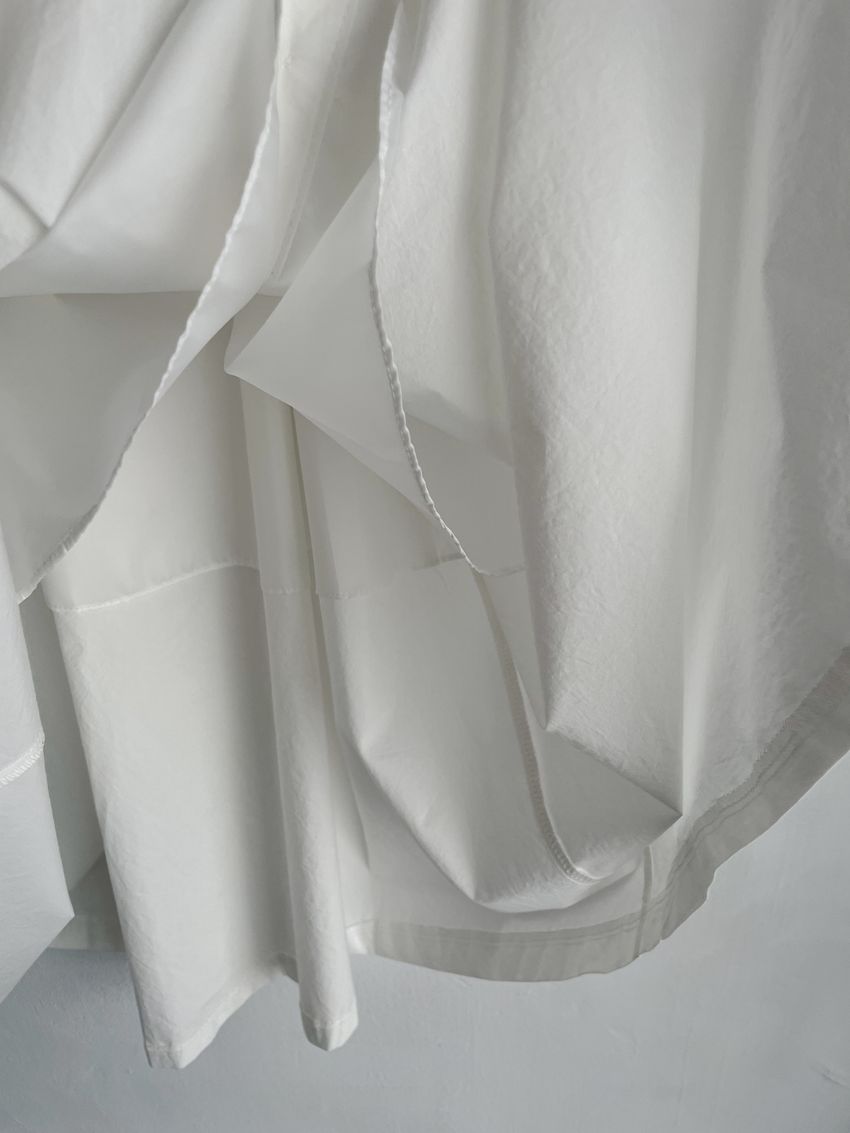 100%cotton裙襬夠圓帶點澎澎感的圓長裙搭配白釦帶出夏天的清爽感薄料棉質 帶有挺度兩側口袋 後腰鬆緊有內裡 前排釦穿脫白色建議搭配淺色或膚色內褲白色 / 水藍色單一尺寸適合S~L號 腰圍29吋以內身形model / Yen - 159cm / 44kg 腰24 臀34