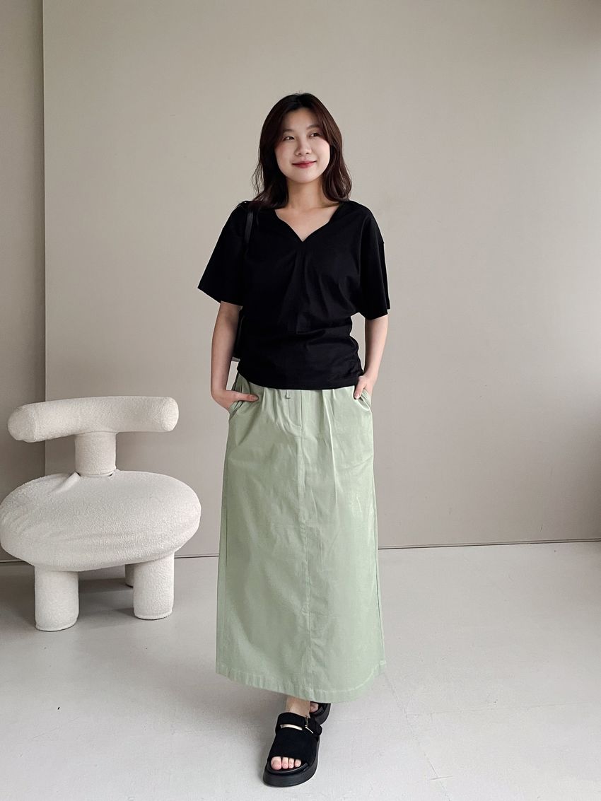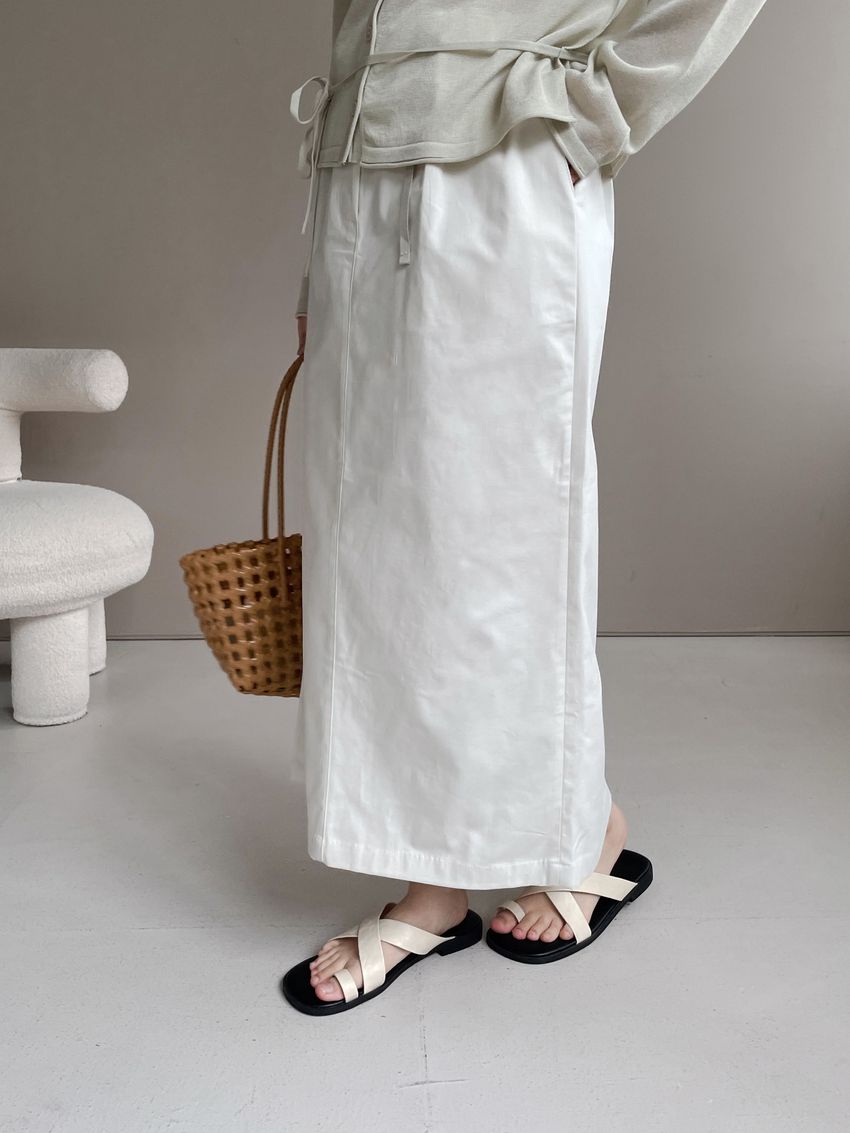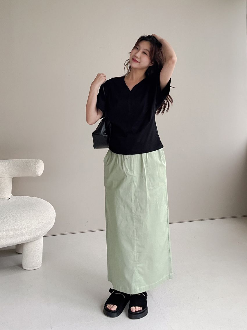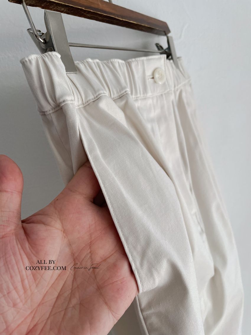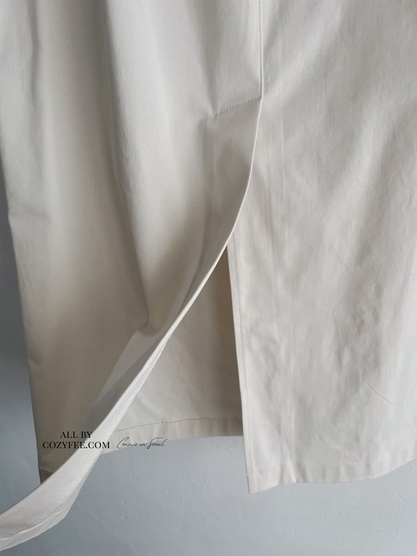 97%cotton 3%span腰部整圈鬆緊彈性 內有抽繩可以再調緊腰圍無內裡 後下擺開岔米杏色 / 湖水綠色單一尺寸 建議S號~L號身型適合model / Yen - 159cm / 44kg 腰24 臀34
