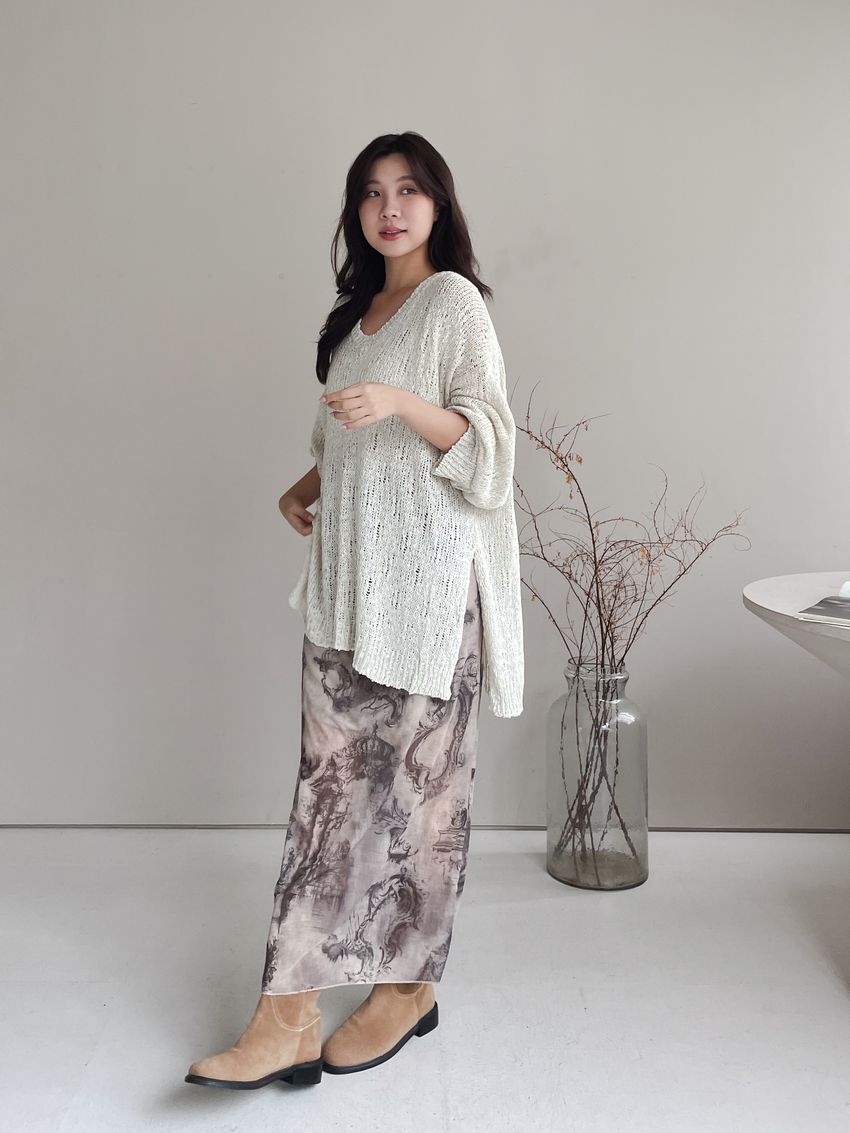 印花透紗直筒裙