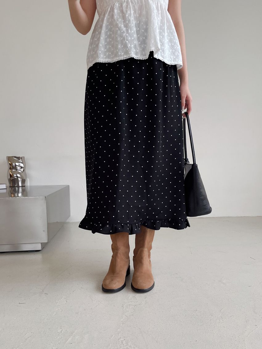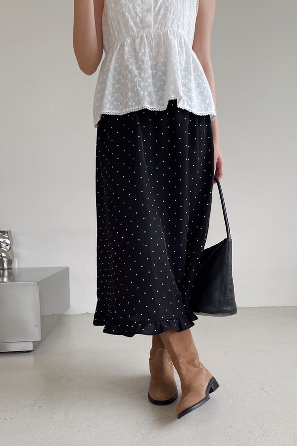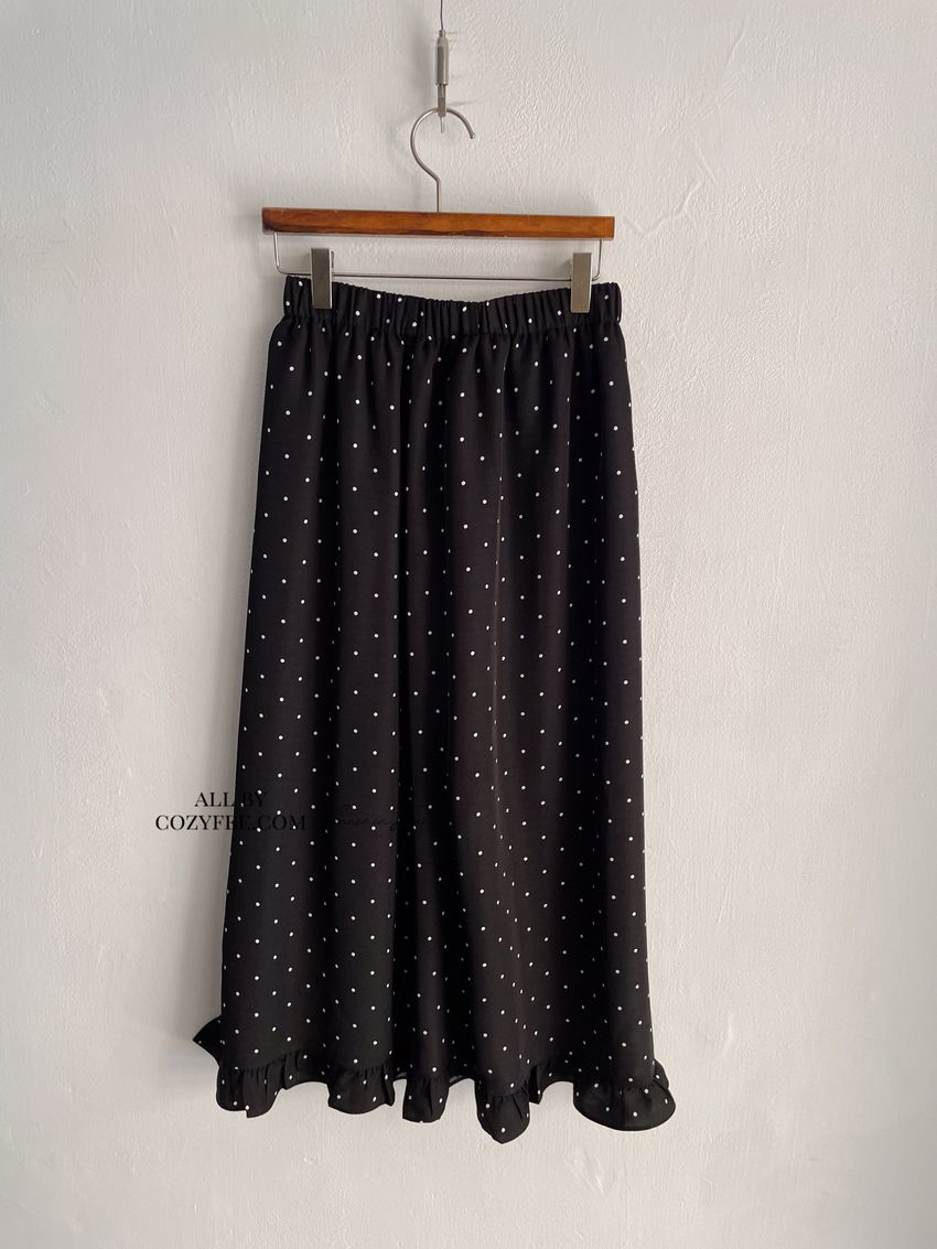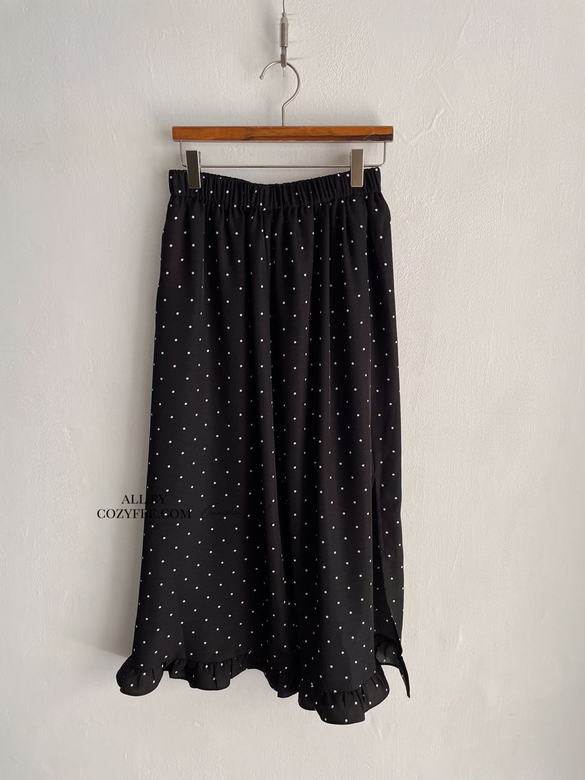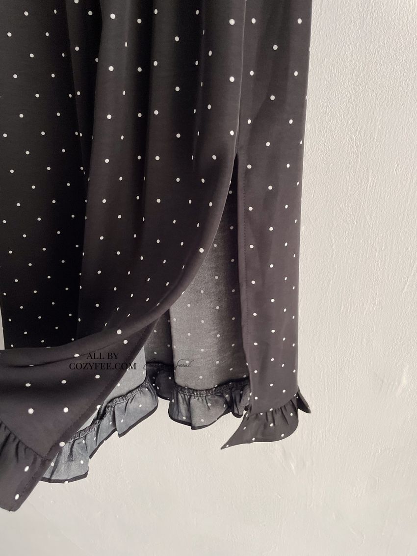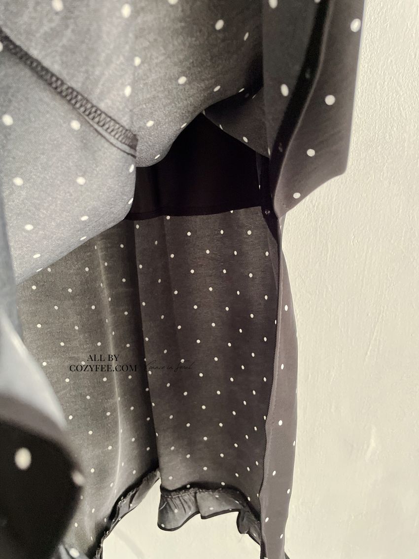 > 黑白波點荷葉裙擺雪紡裙