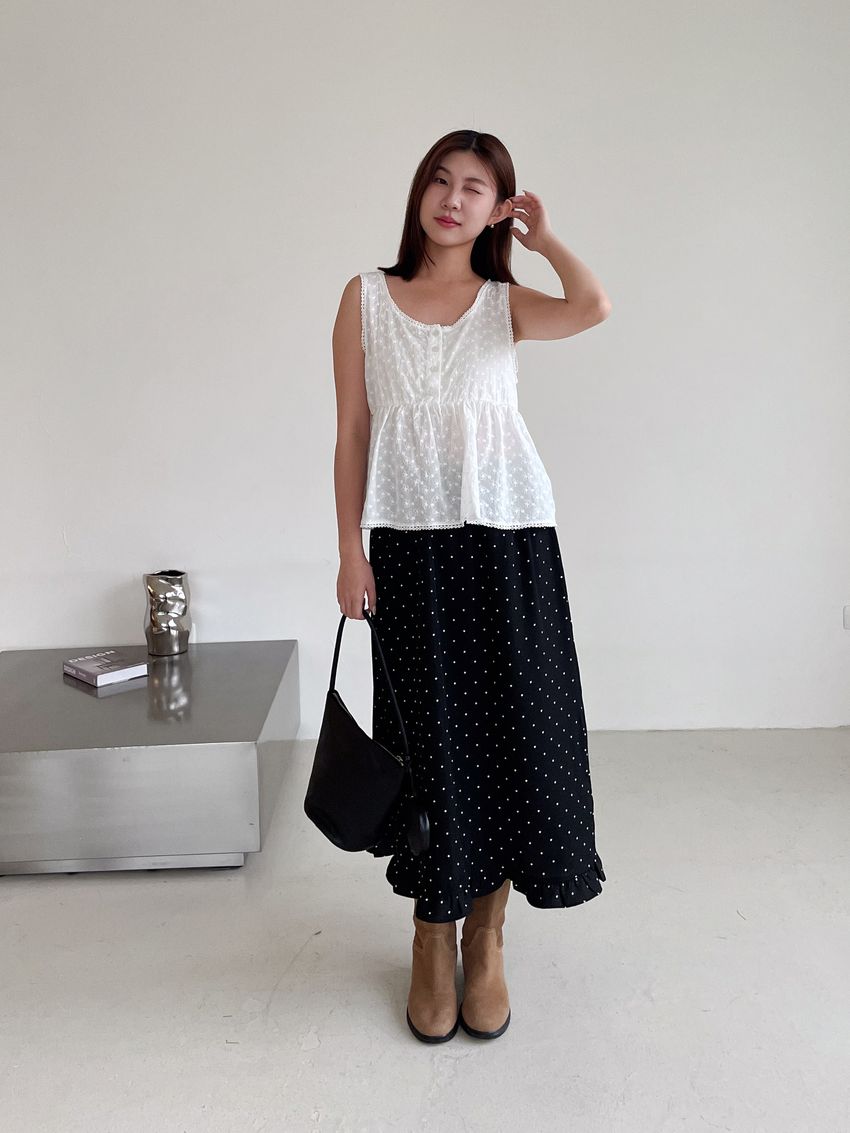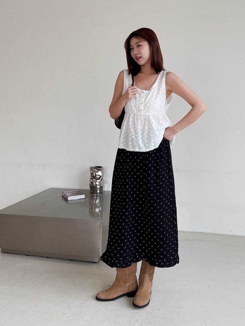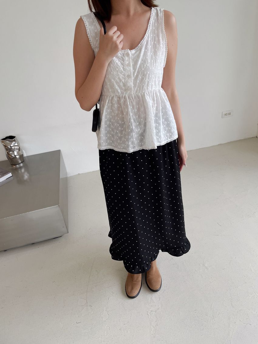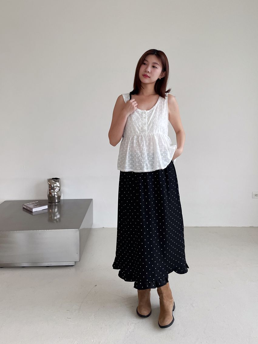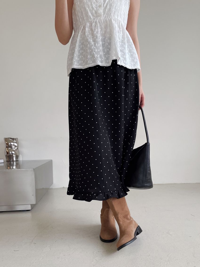 > 黑白波點荷葉裙擺雪紡裙