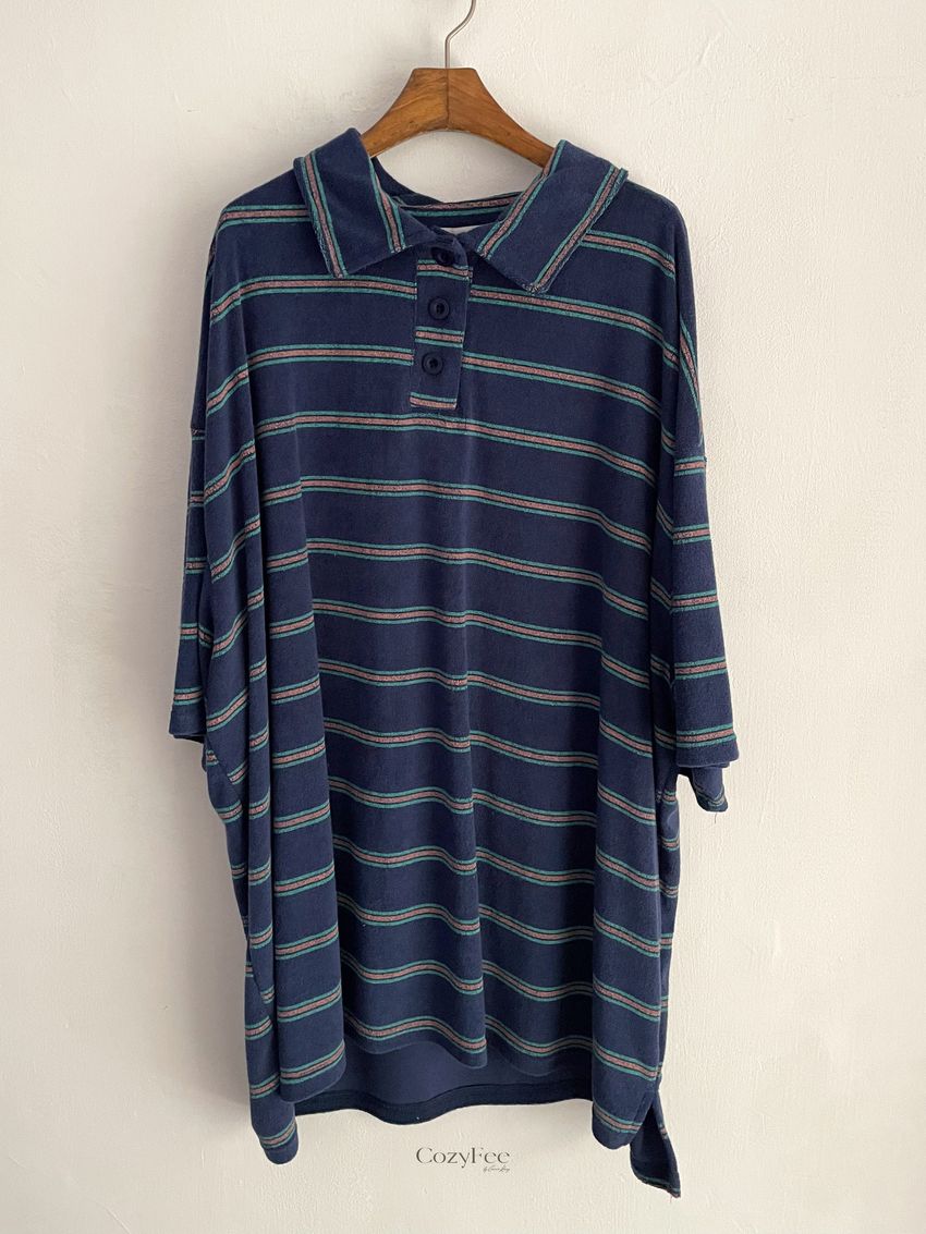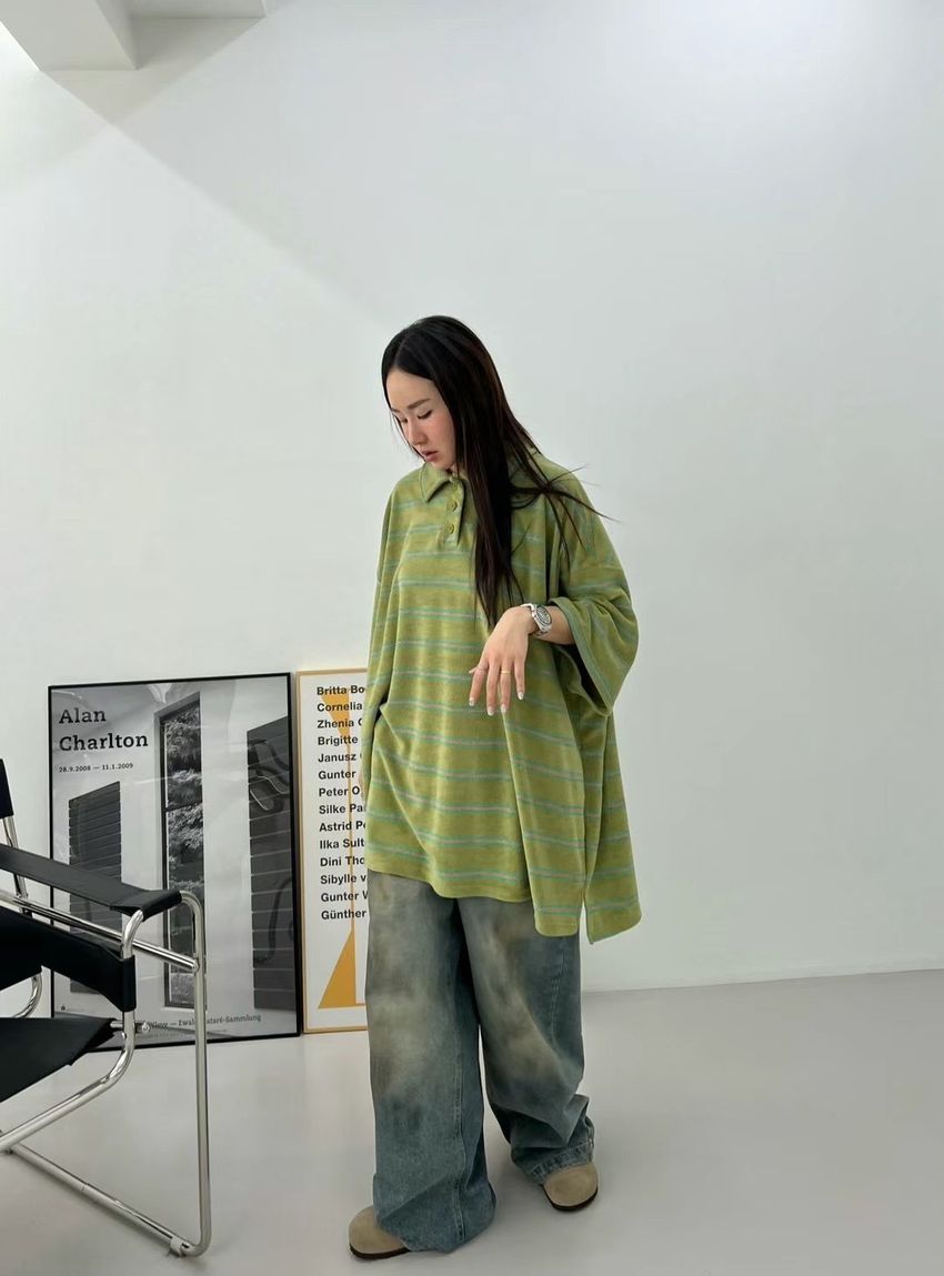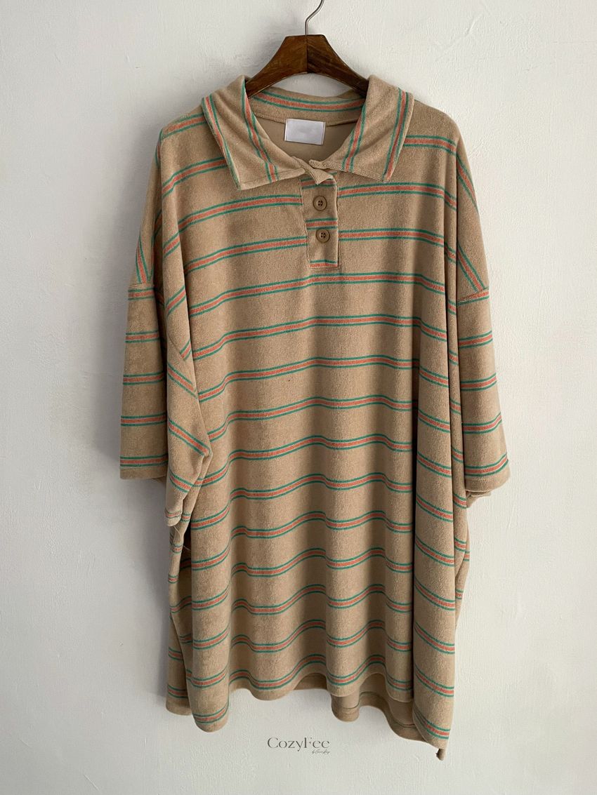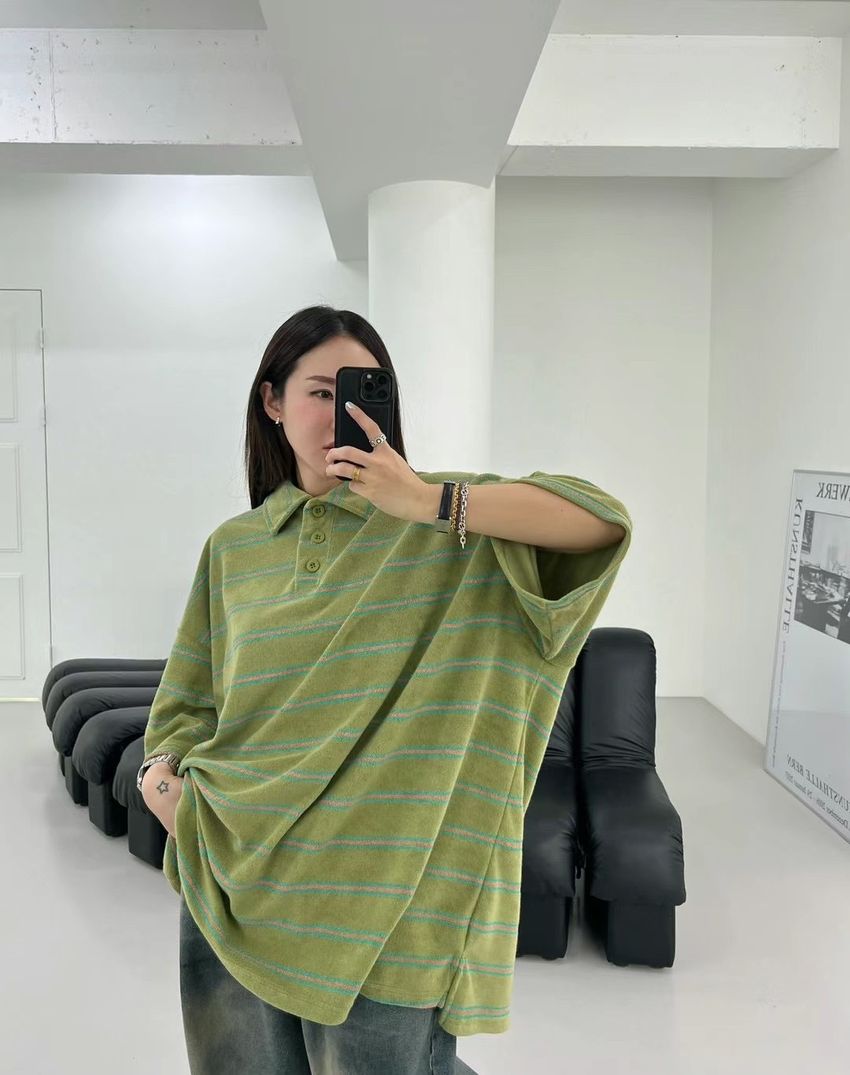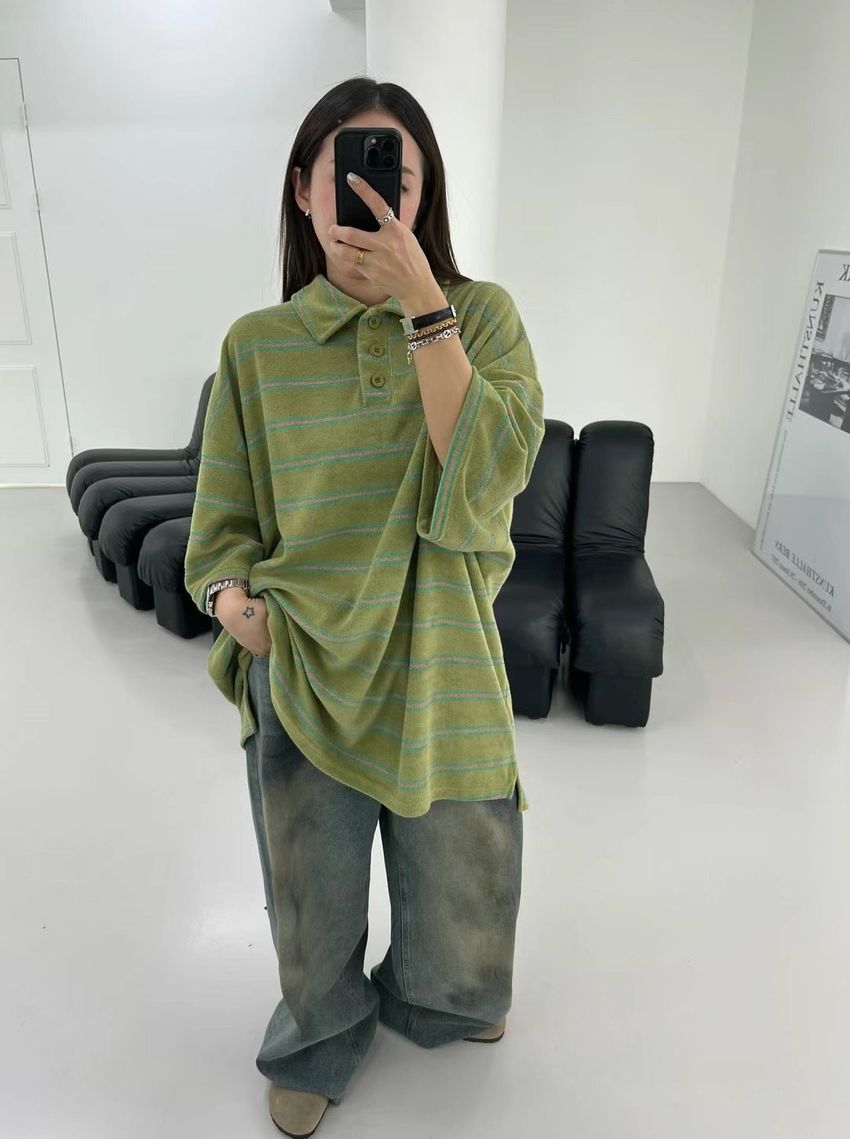寬鬆翻領鈕扣條紋毛巾T(男女共穿)(特)