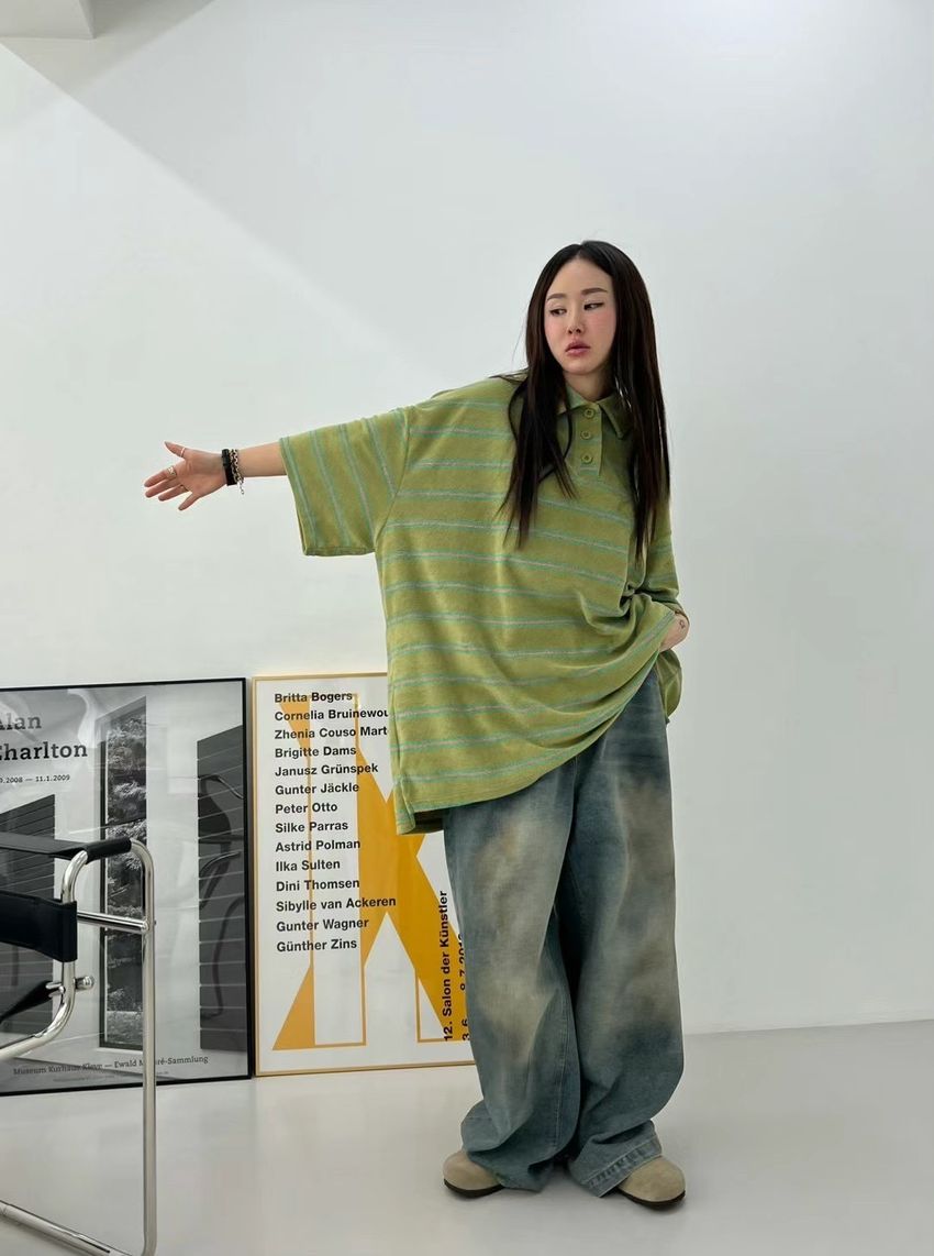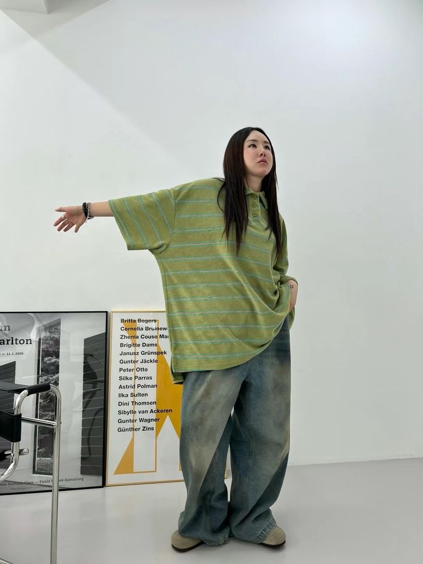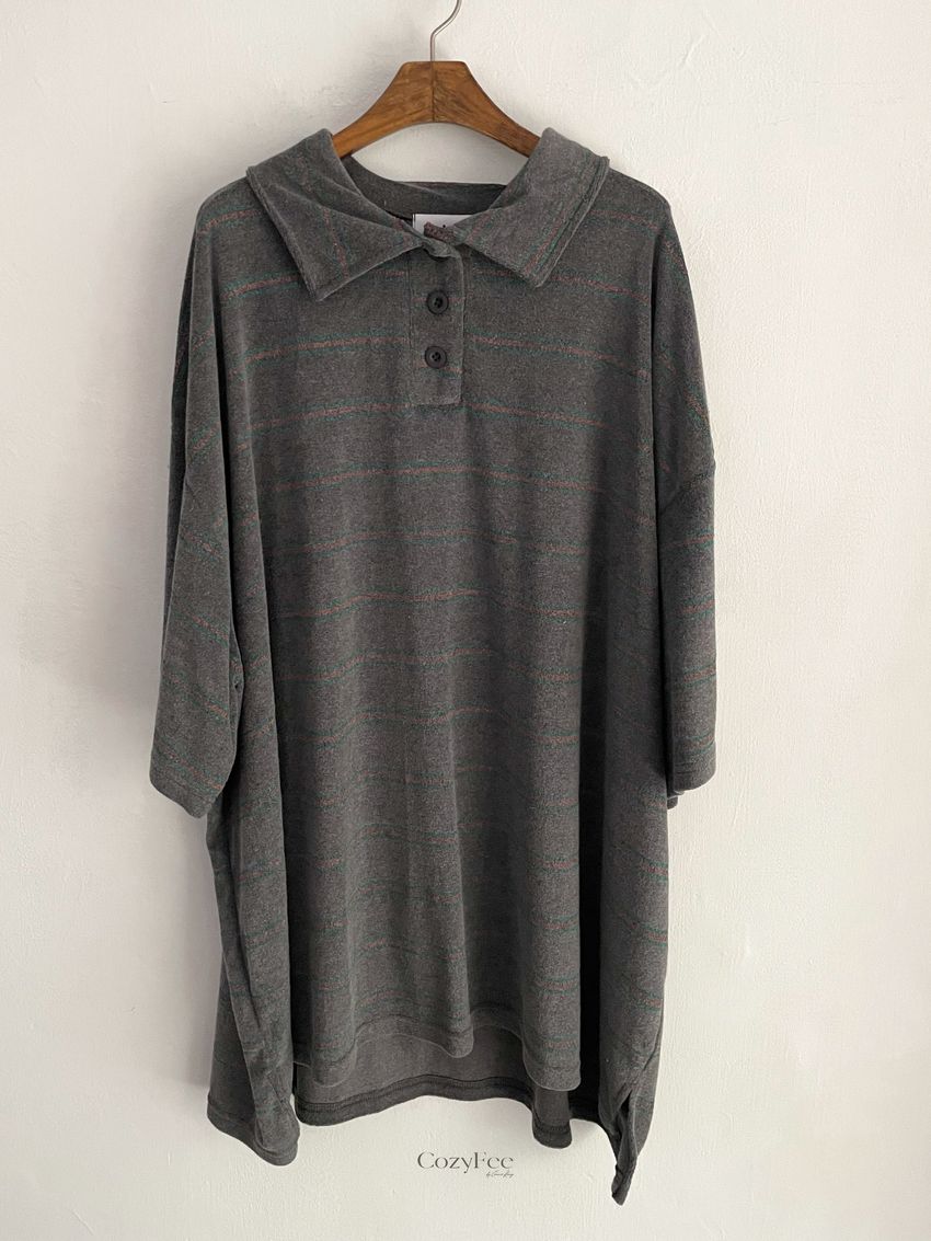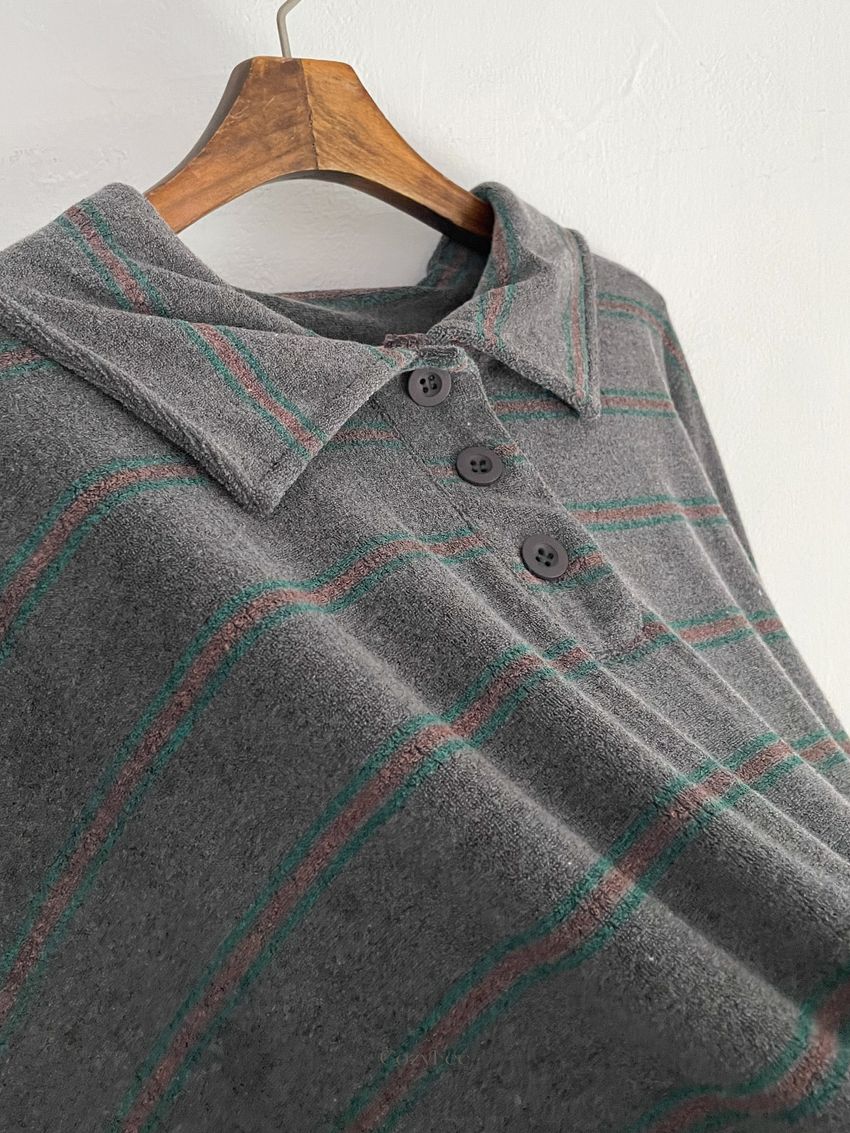 寬鬆翻領鈕扣條紋毛巾T(男女共穿)(特)