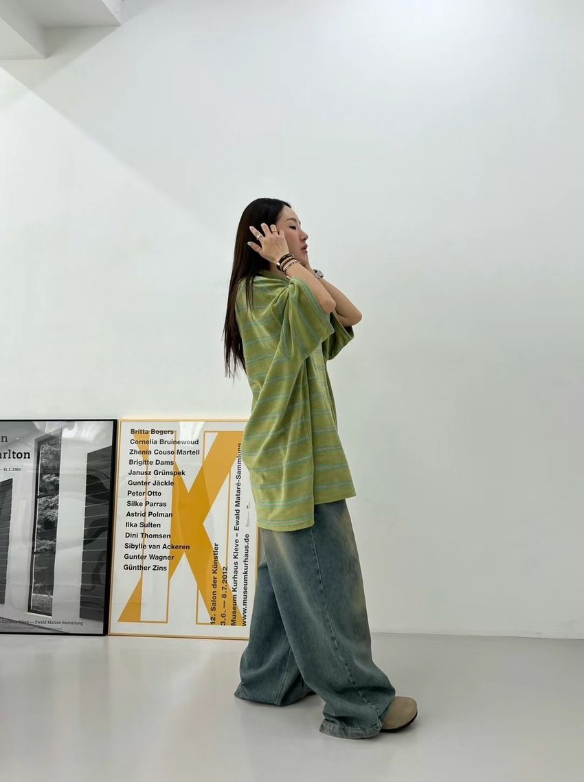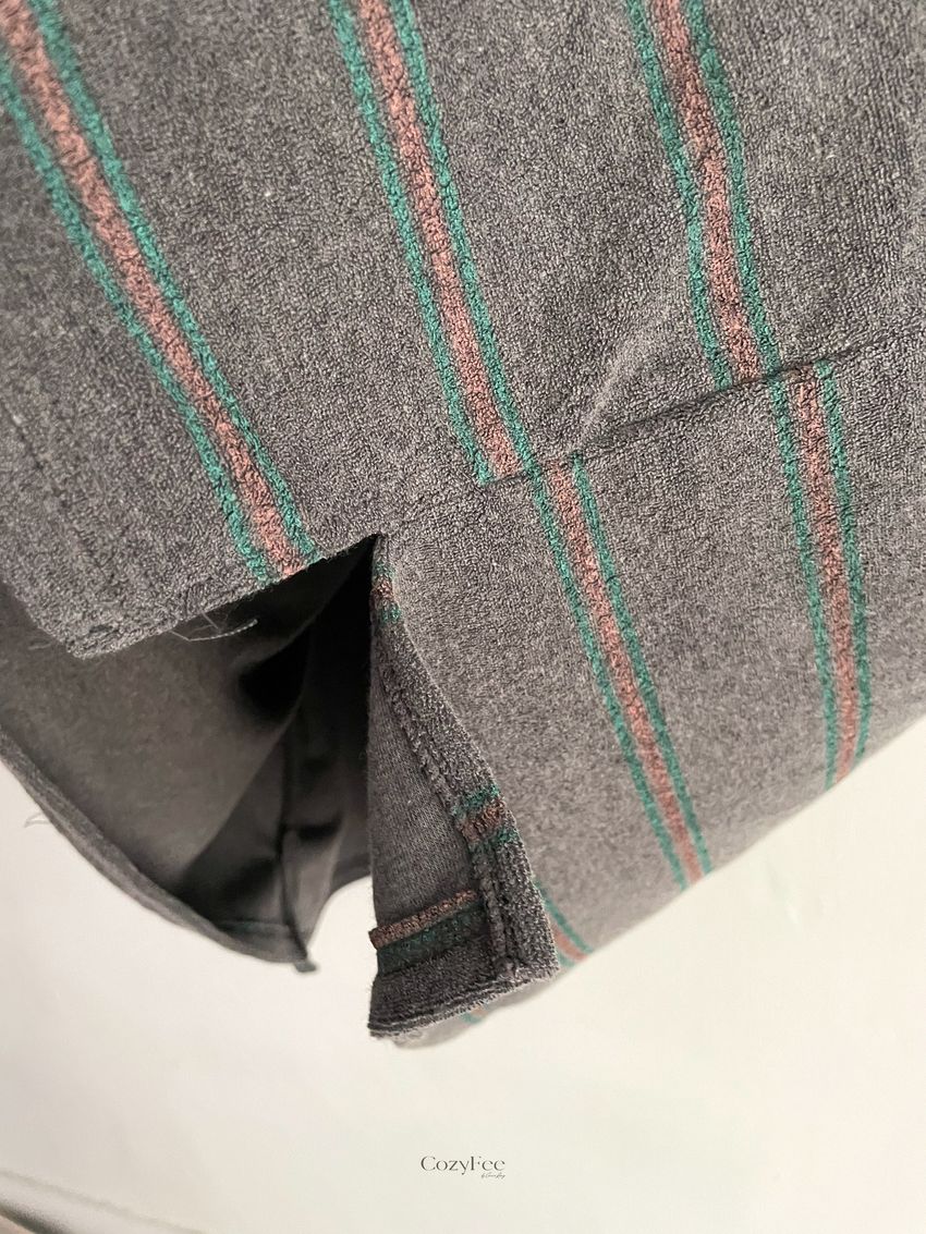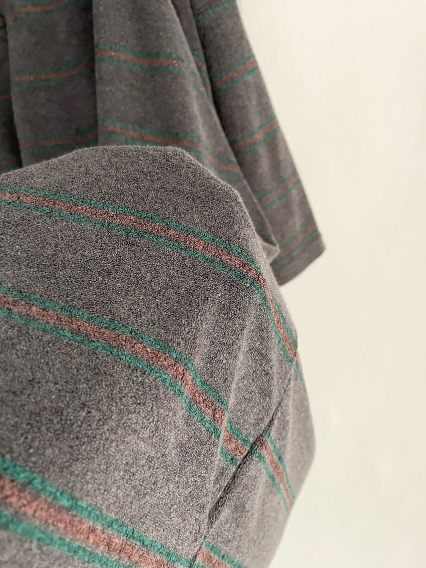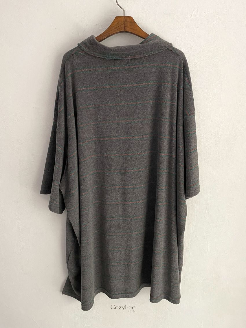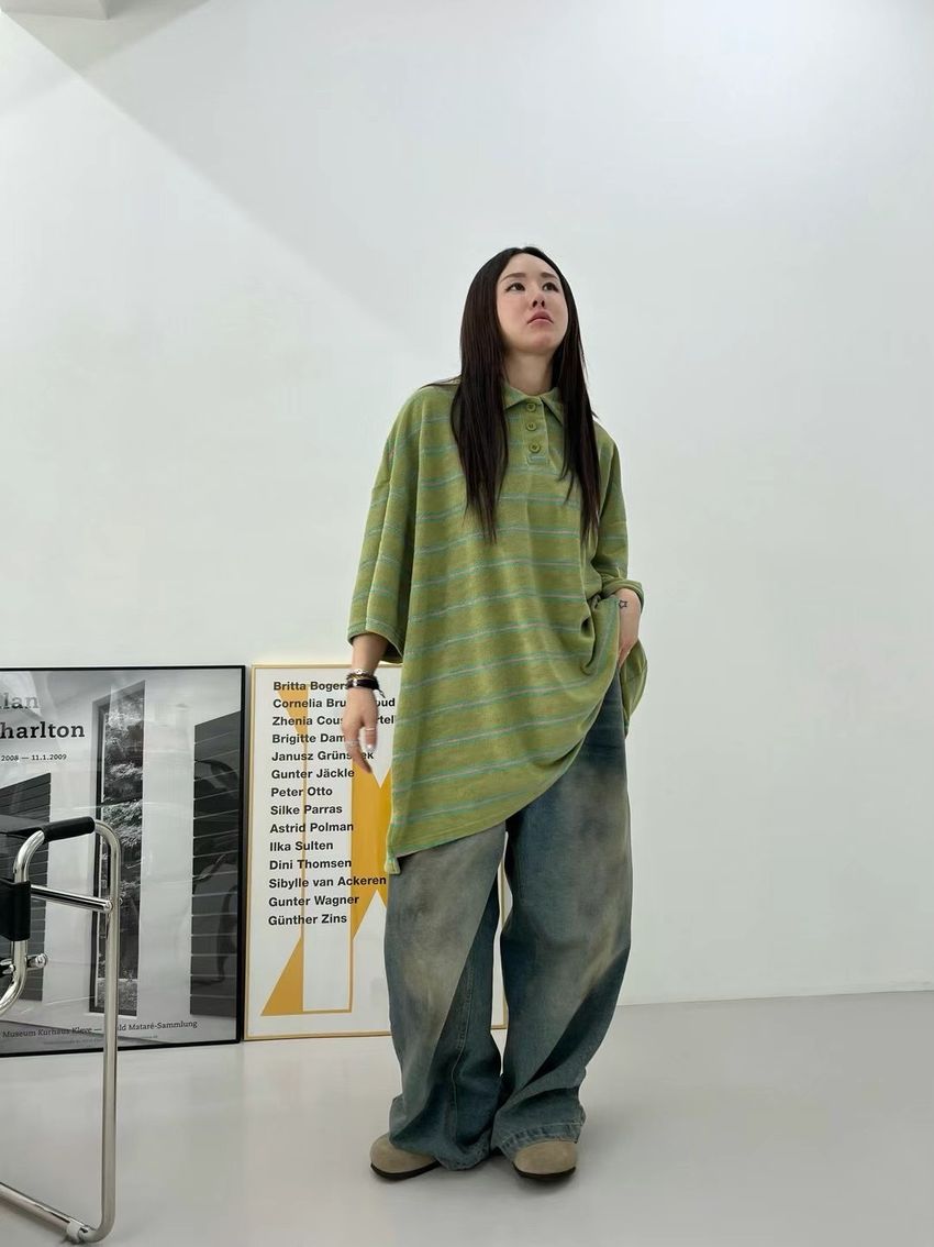 寬鬆翻領鈕扣條紋毛巾T(男女共穿)(特)
