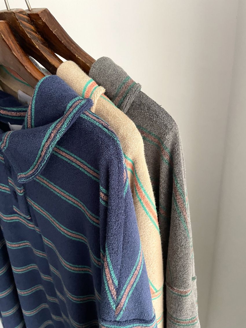 > 寬鬆翻領鈕扣條紋毛巾T(男女共穿)(特)