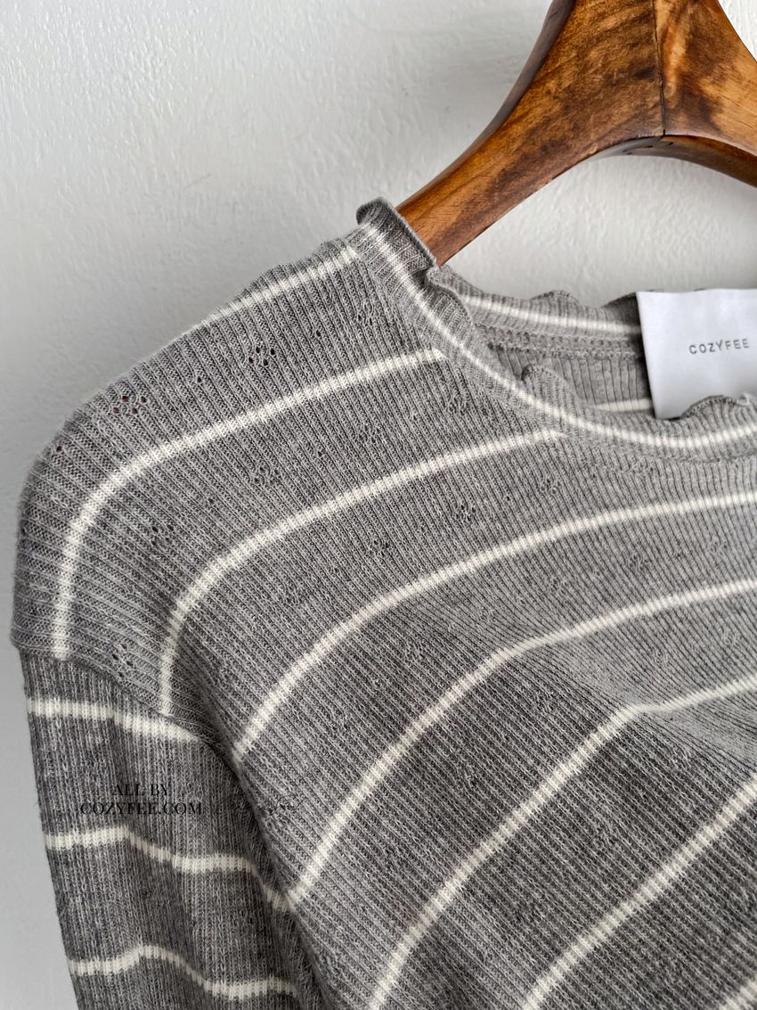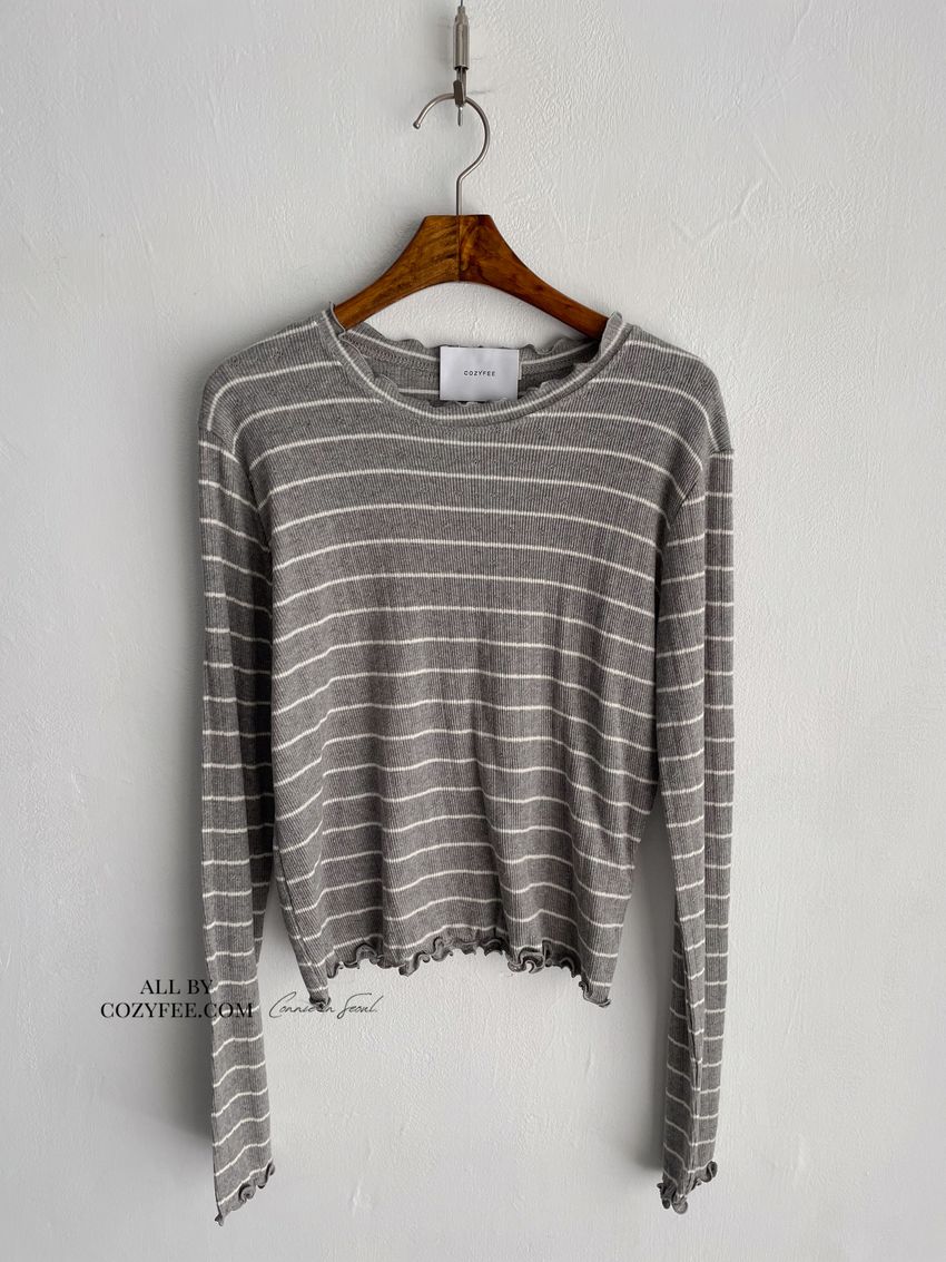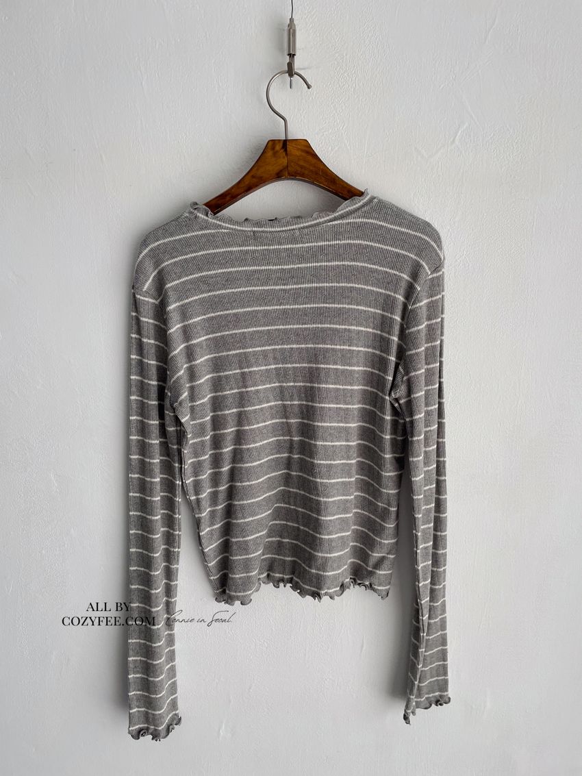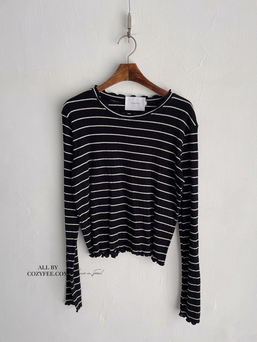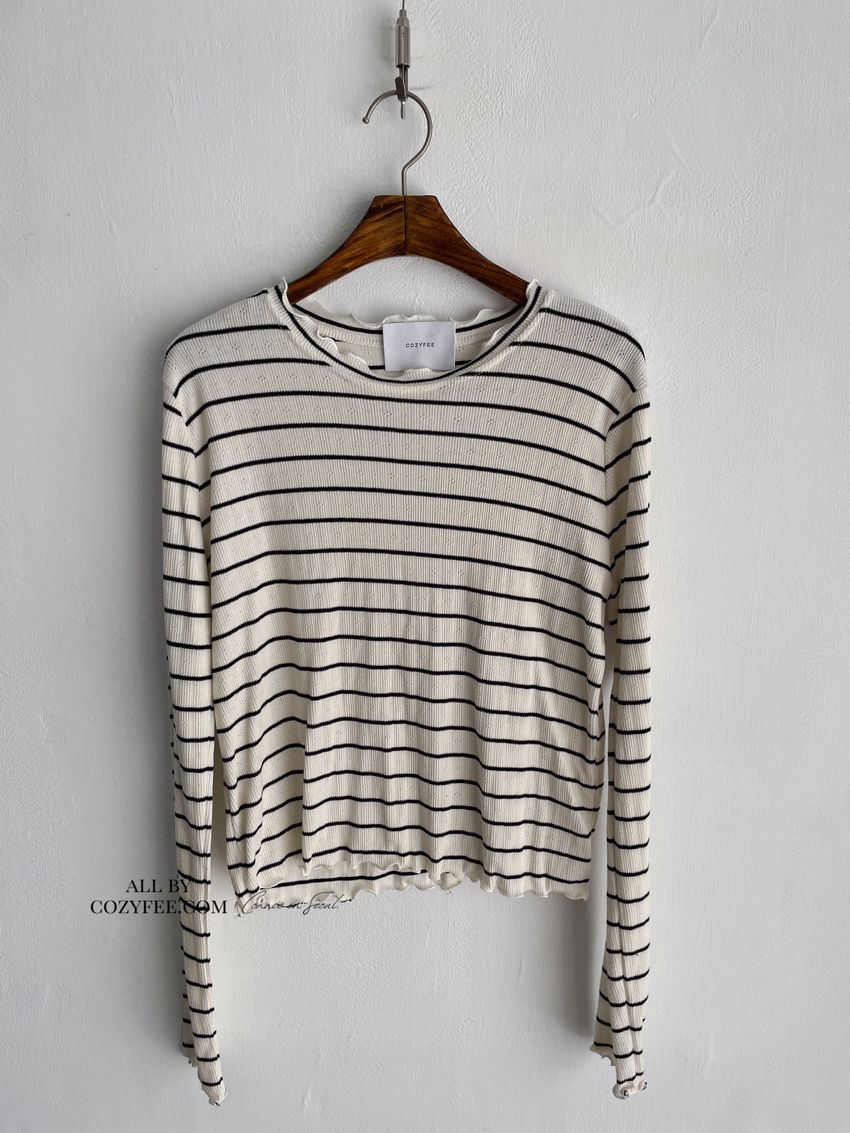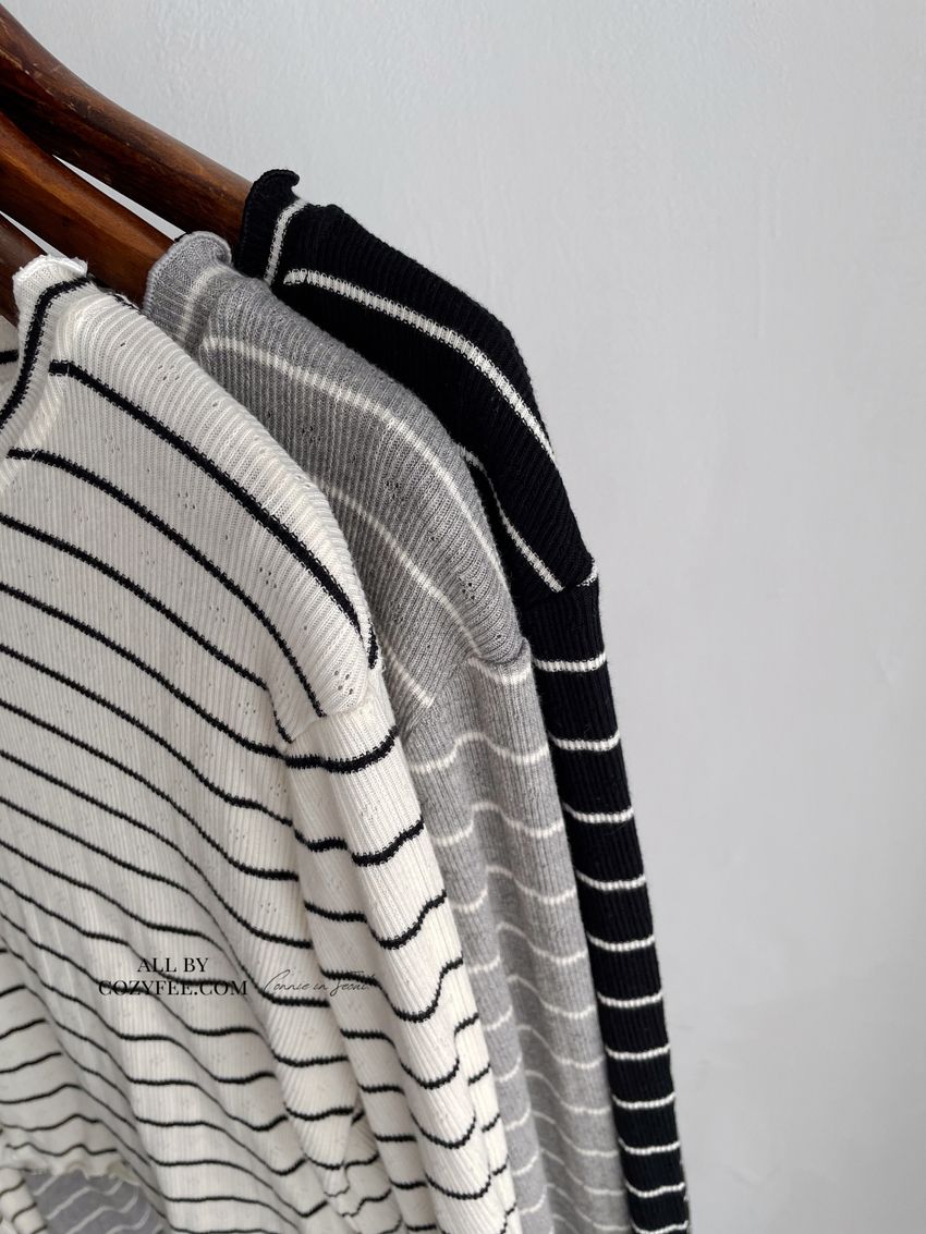 > 條紋簍花捲邊半領長T(直播款)