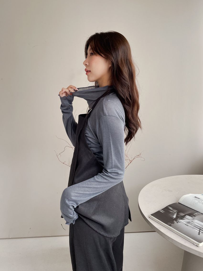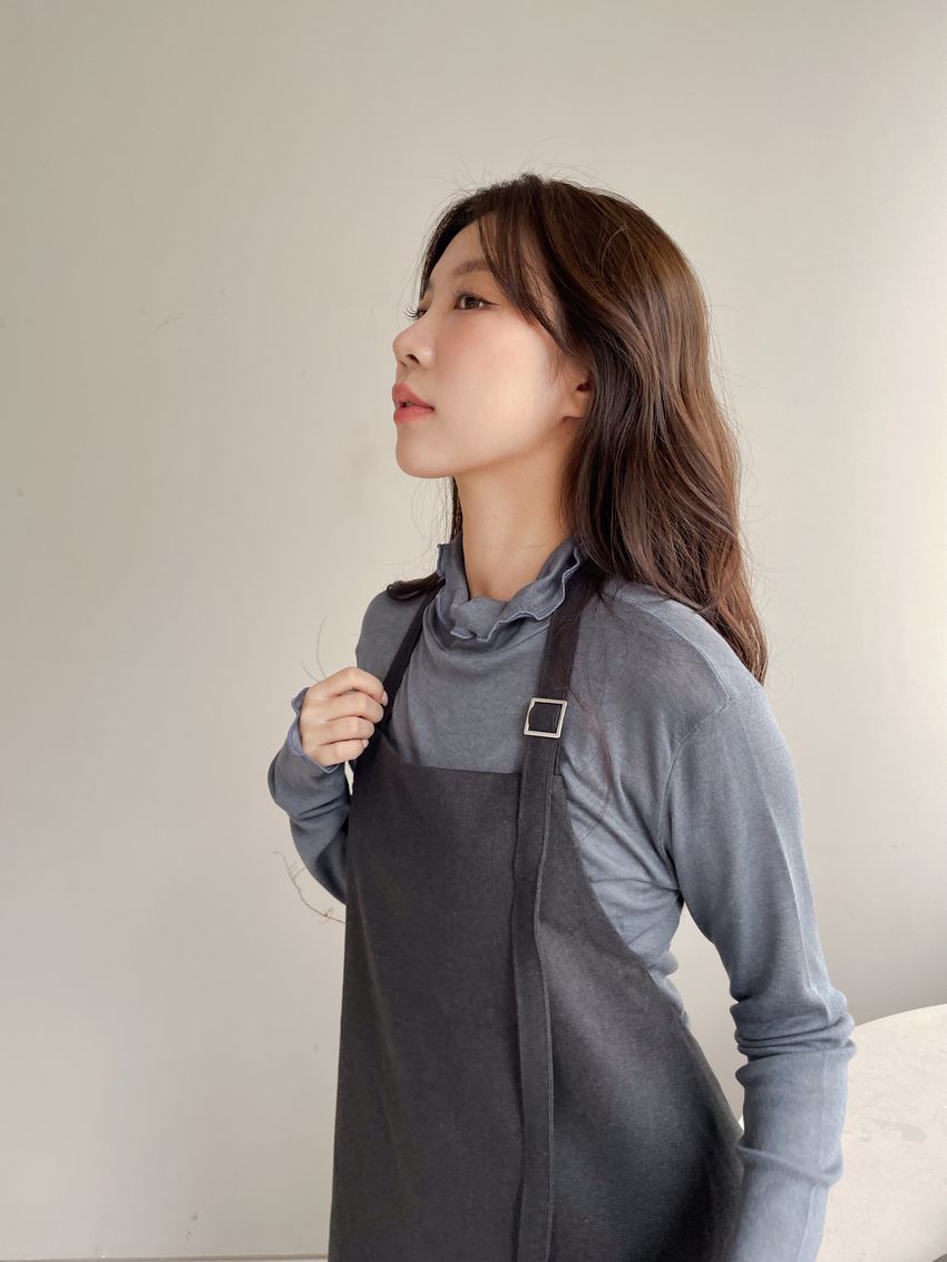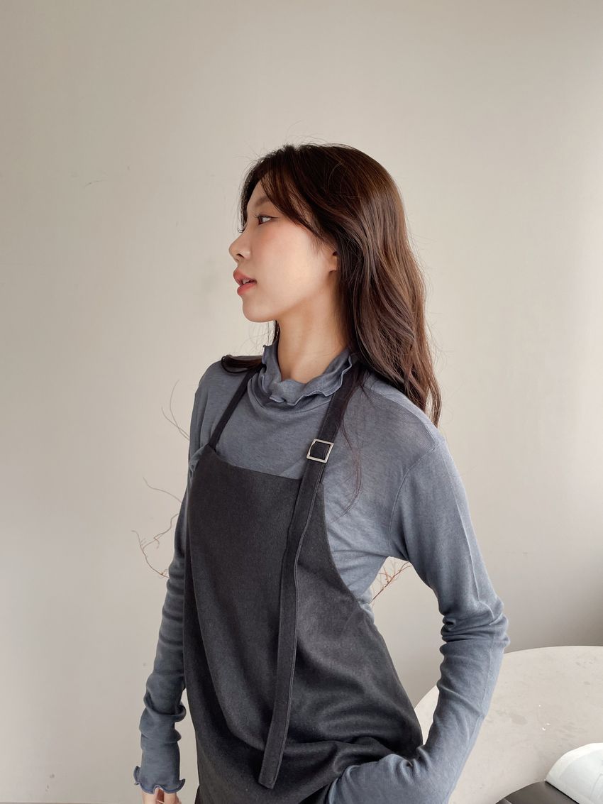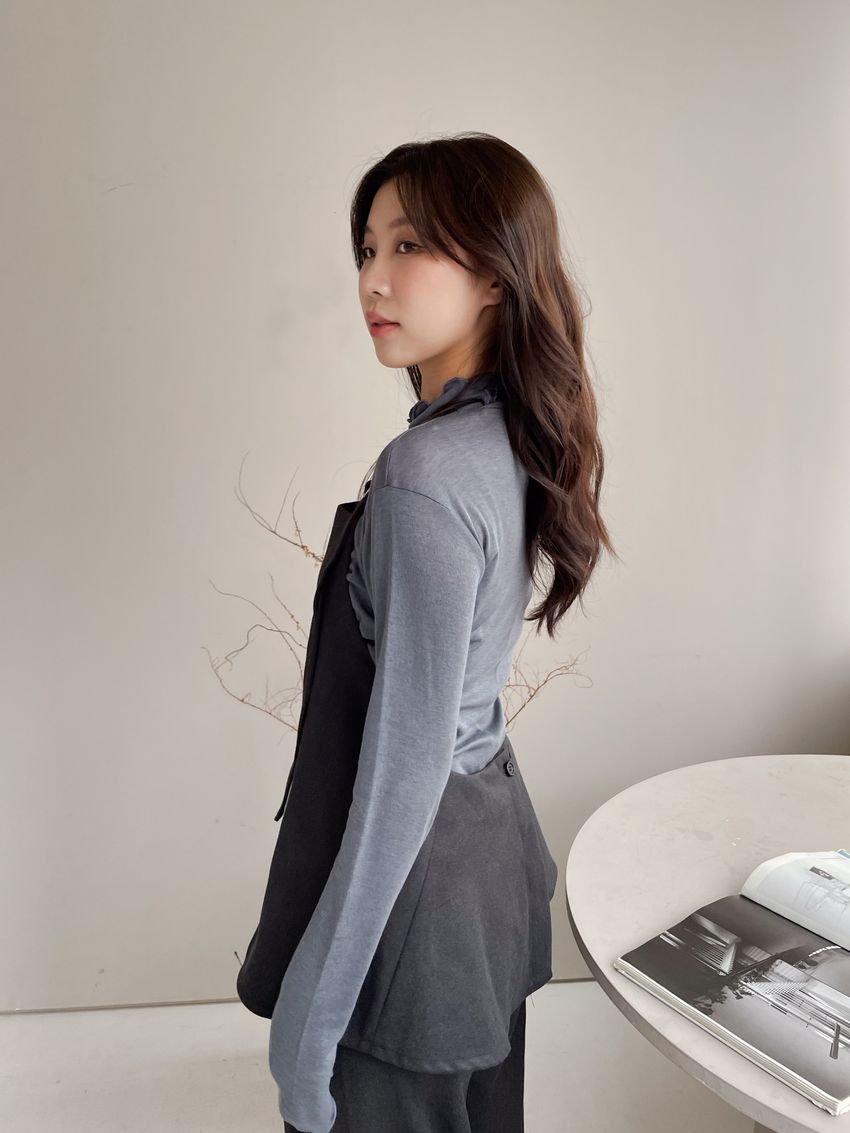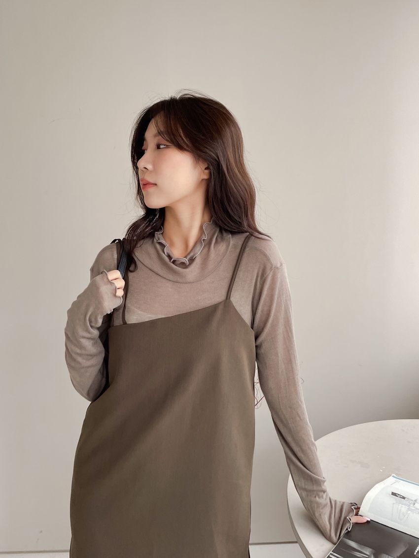 > 捲花邊軟料天絲高領長T