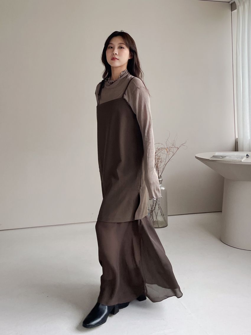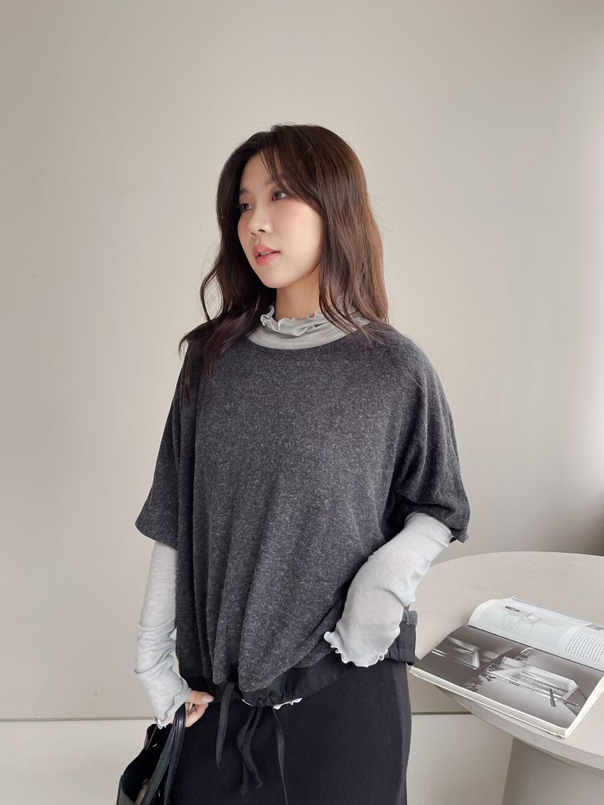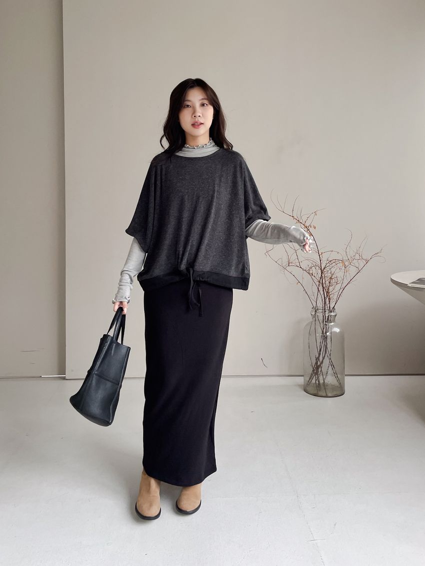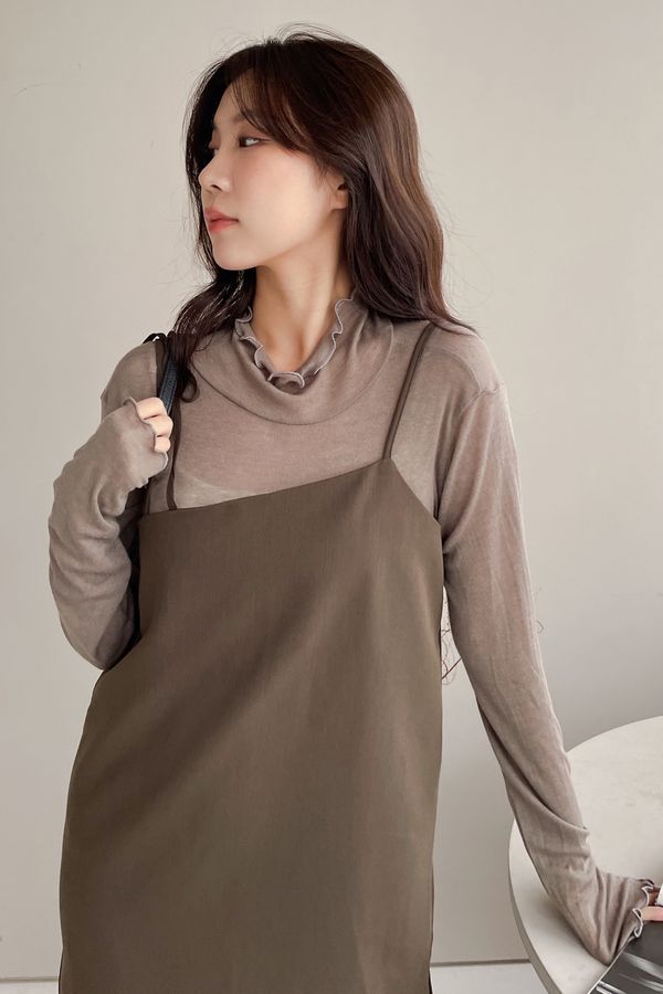 > 捲花邊軟料天絲高領長T