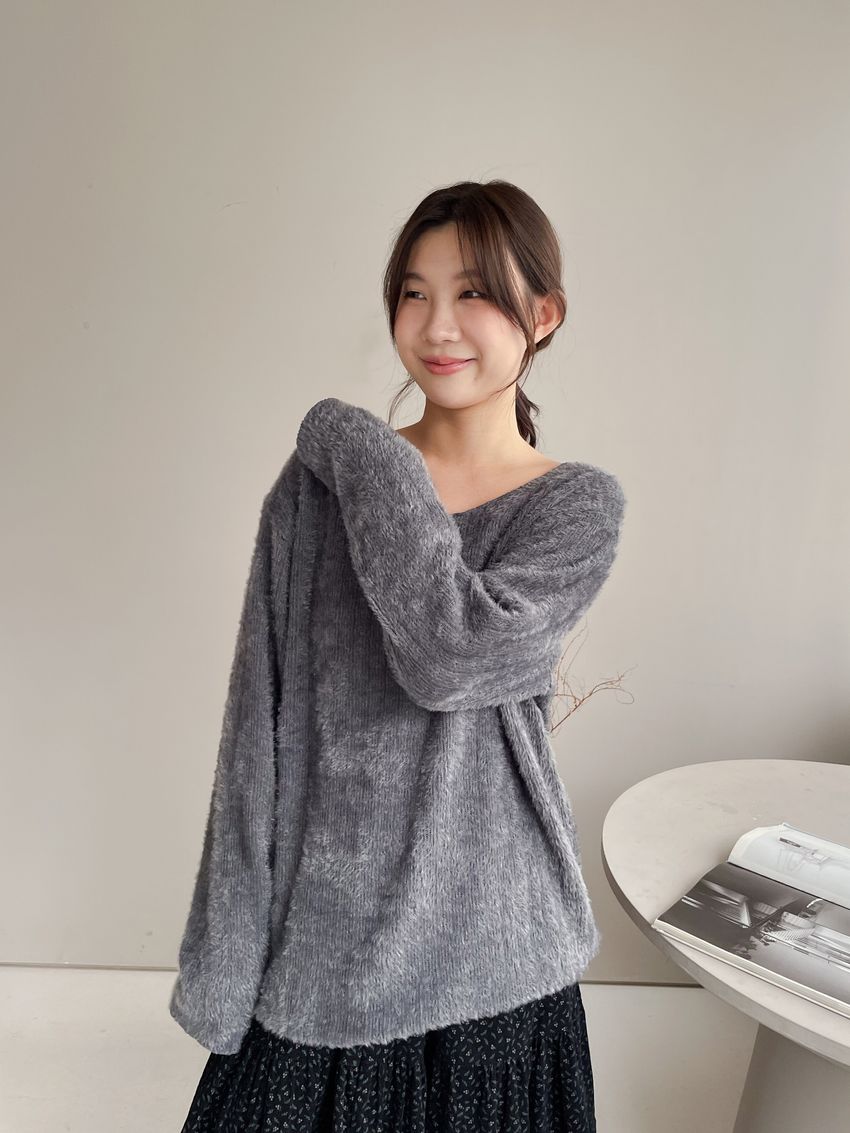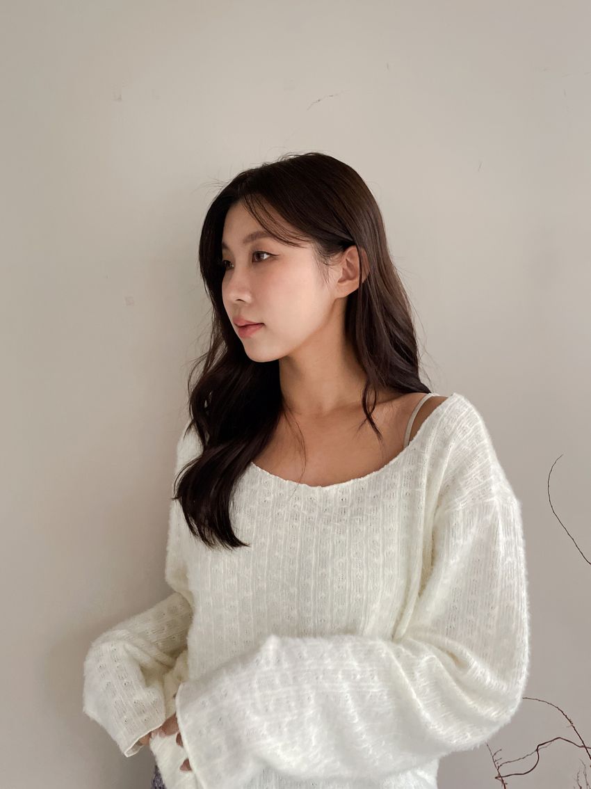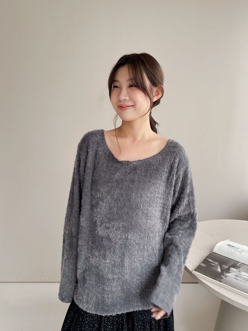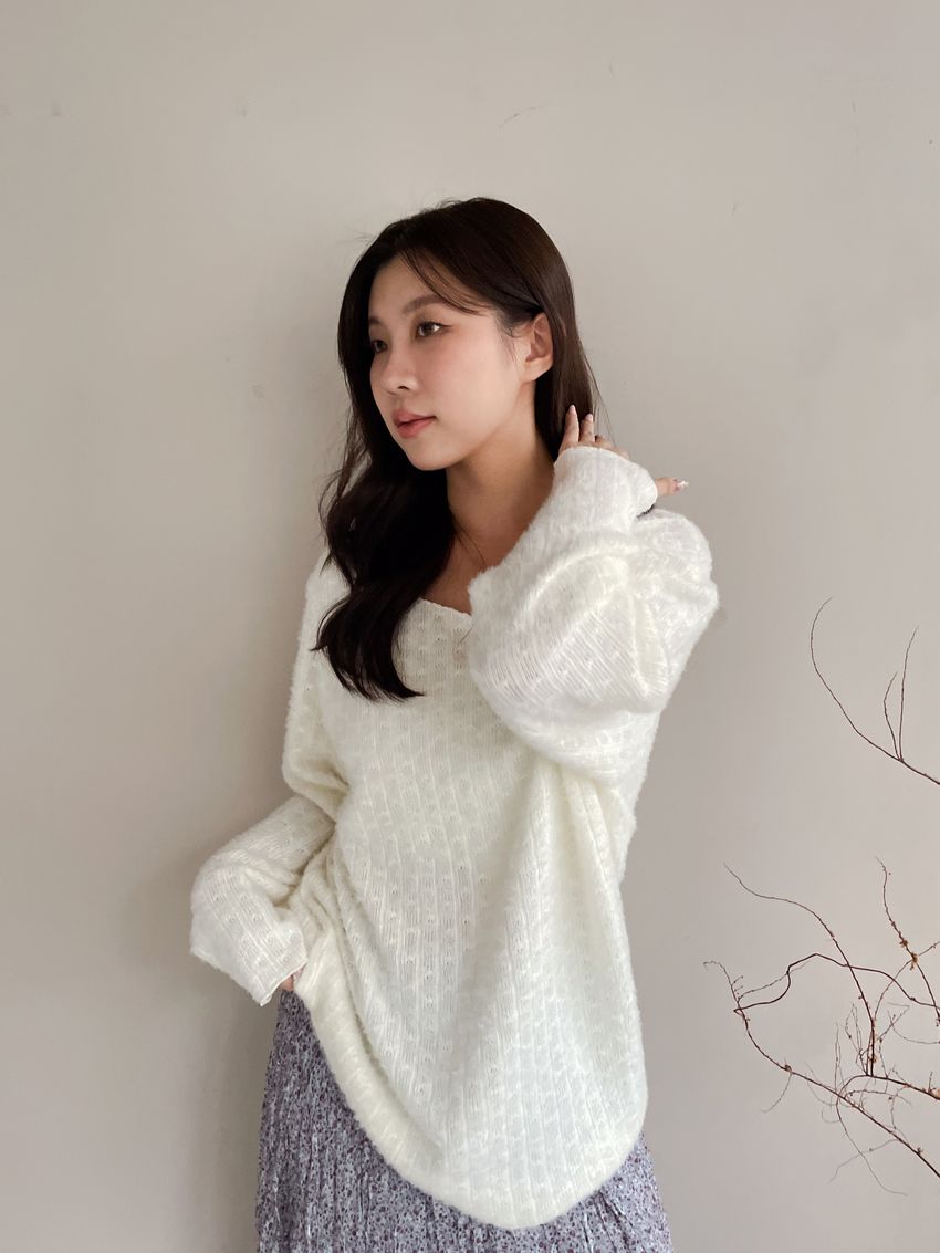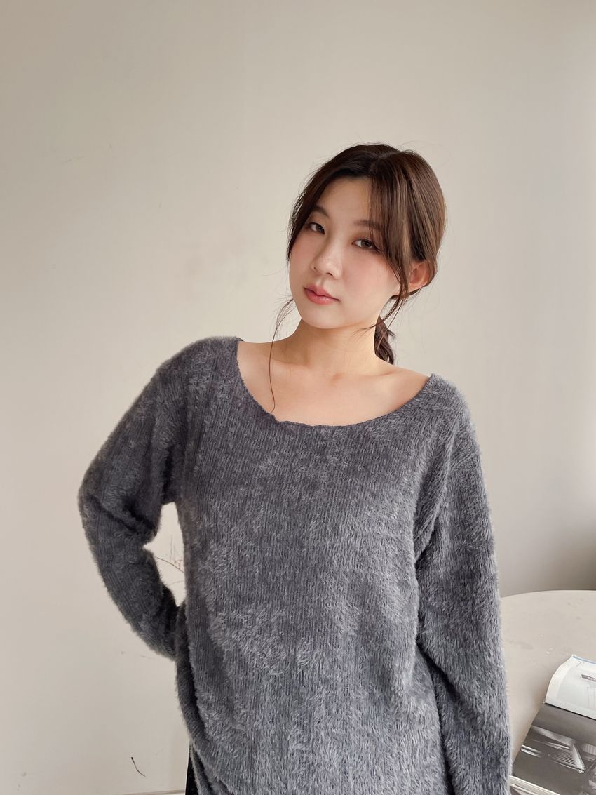 > 寬領毛海感拷克邊針織衫