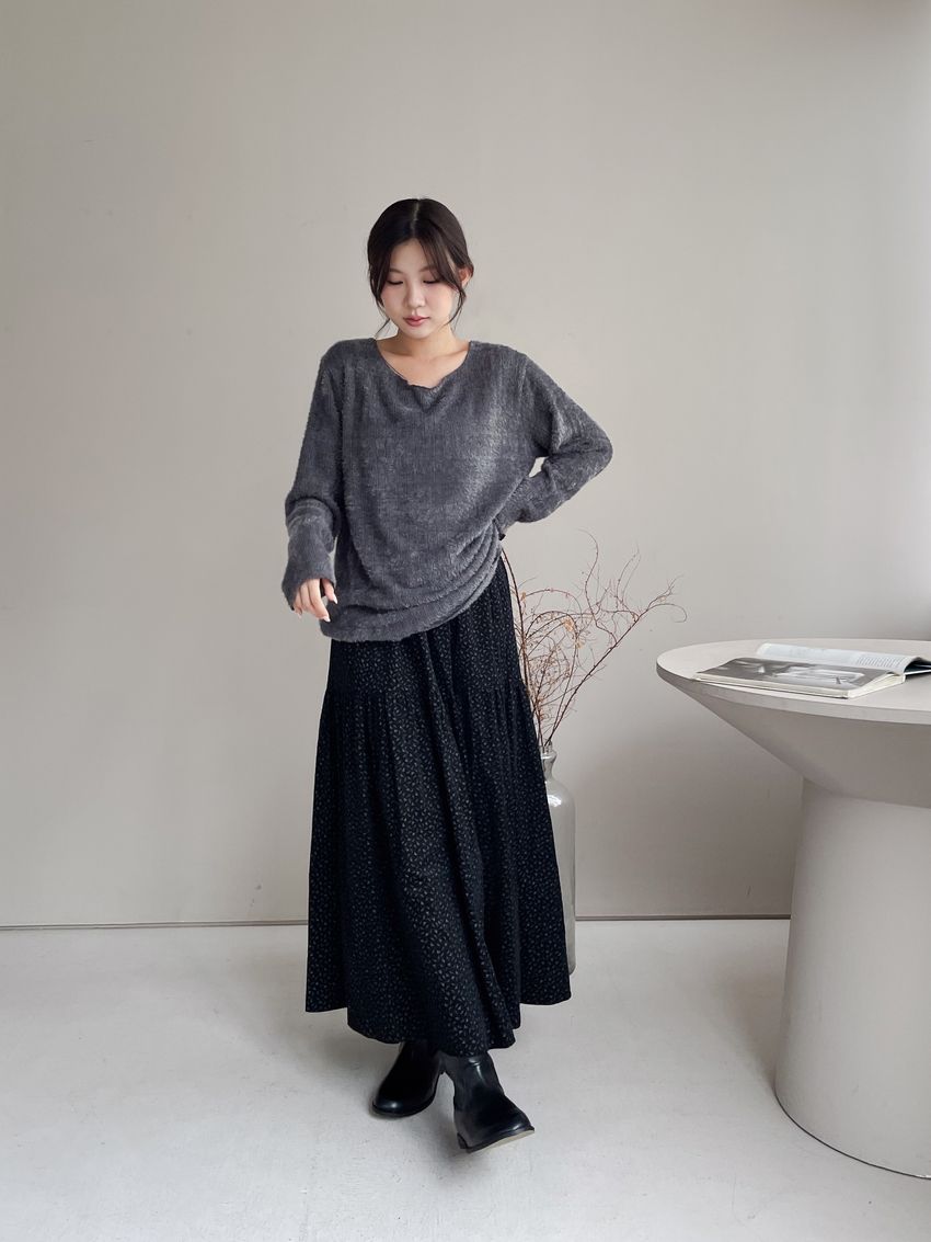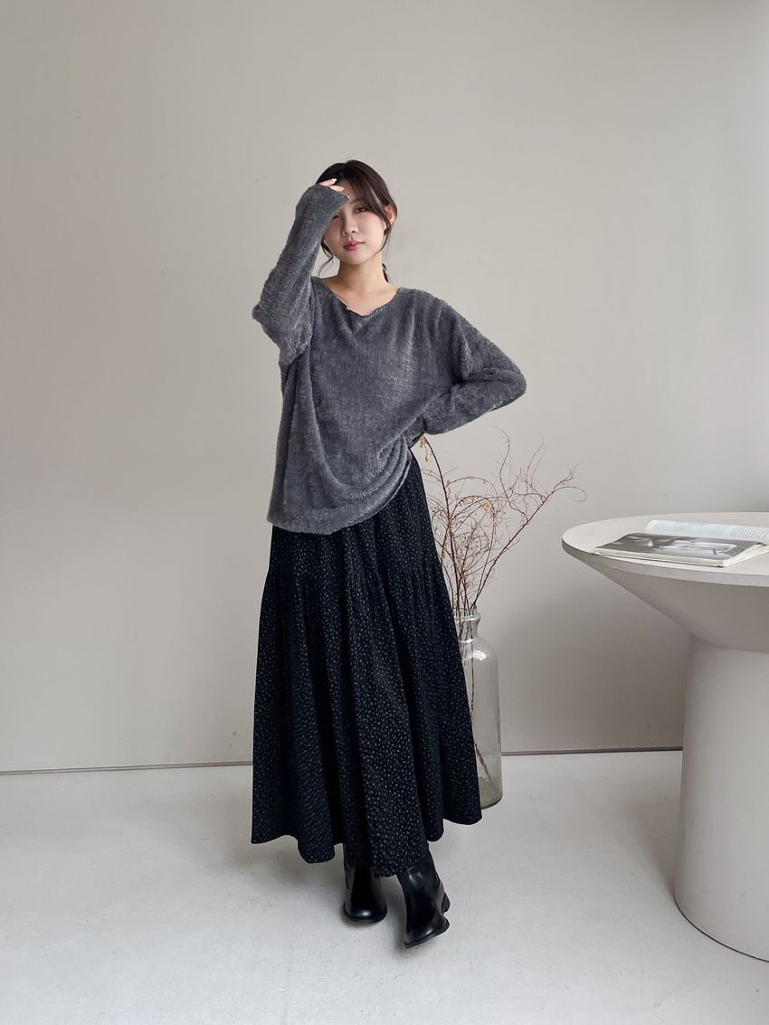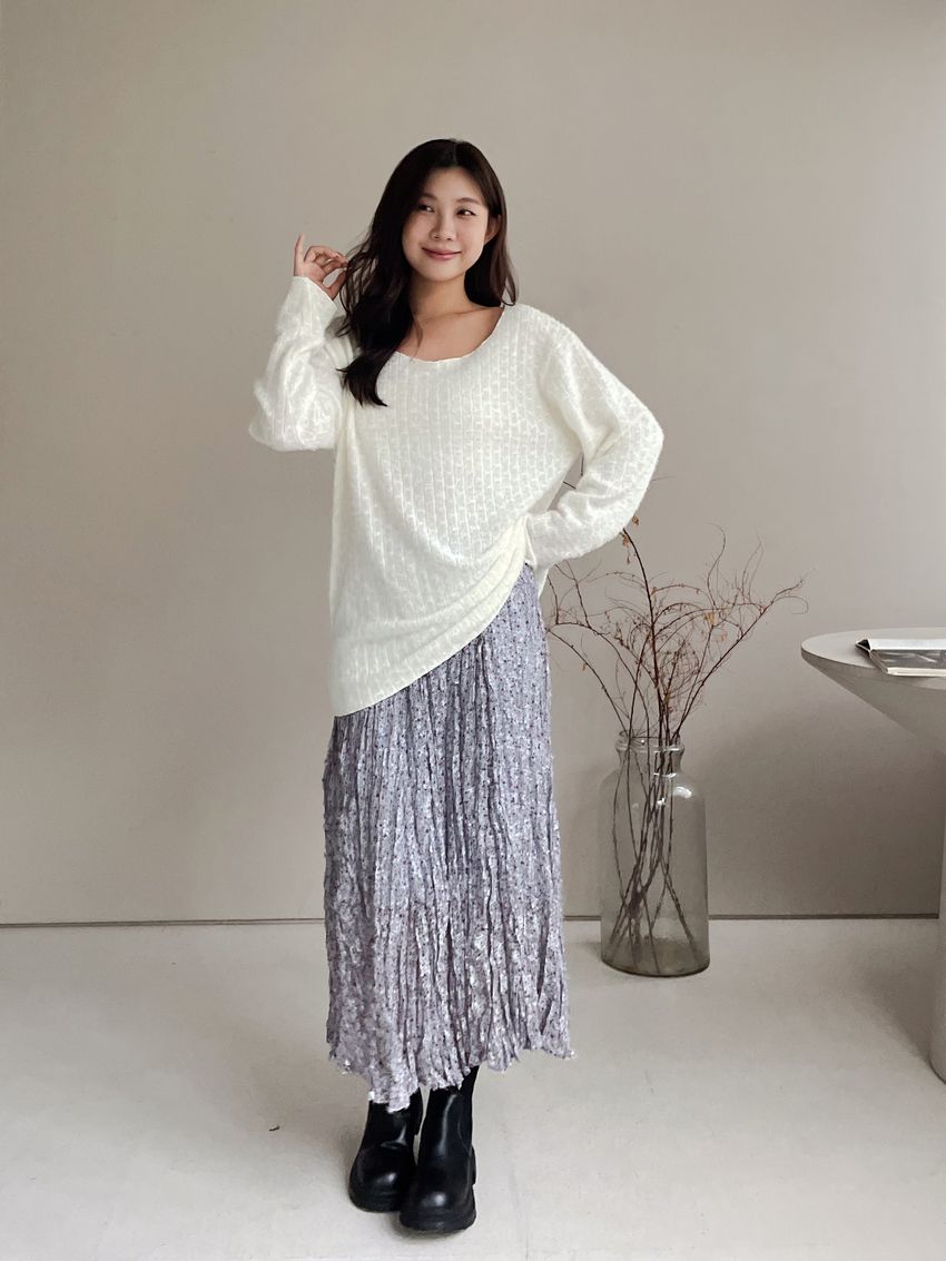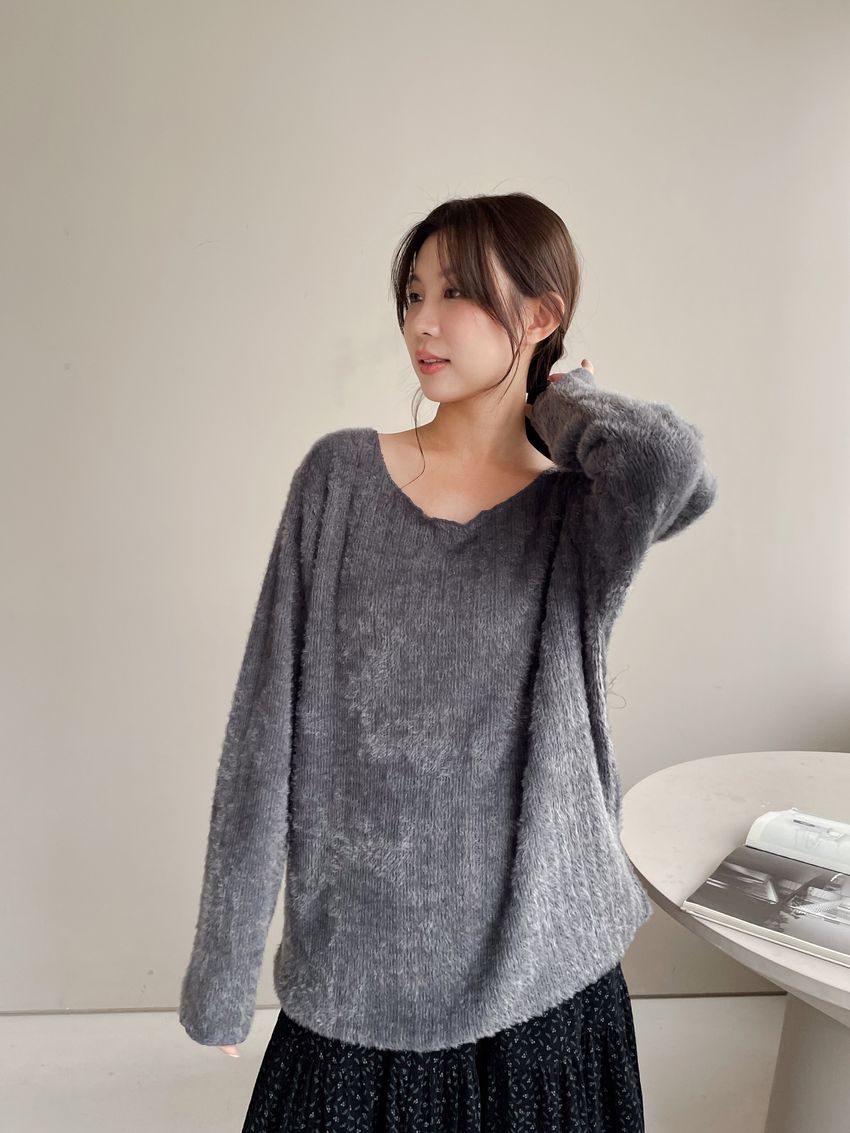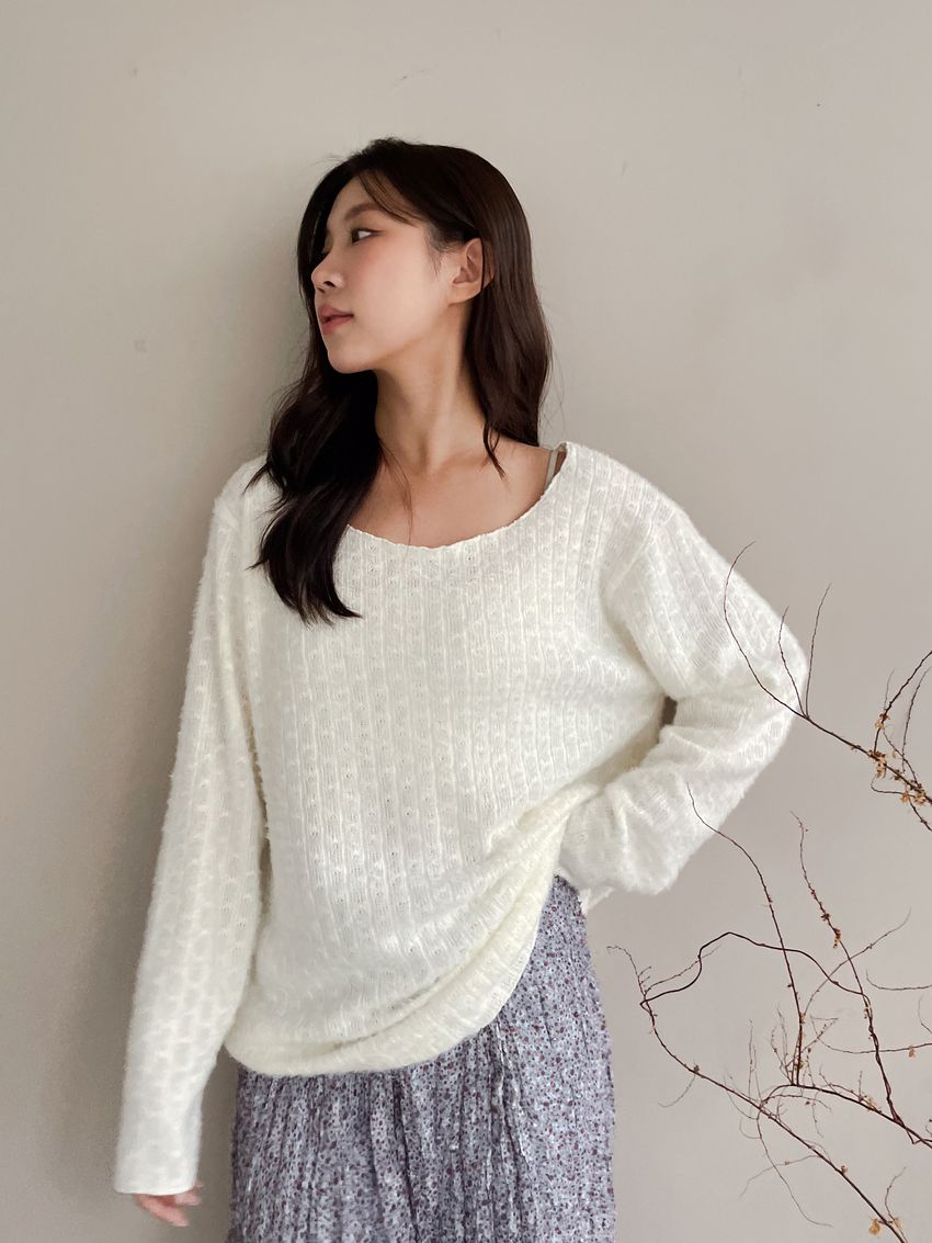 > 寬領毛海感拷克邊針織衫