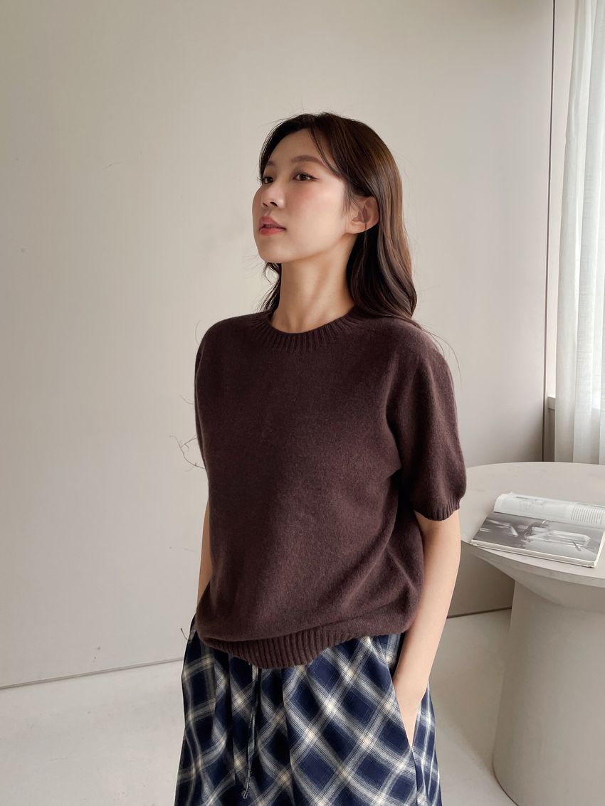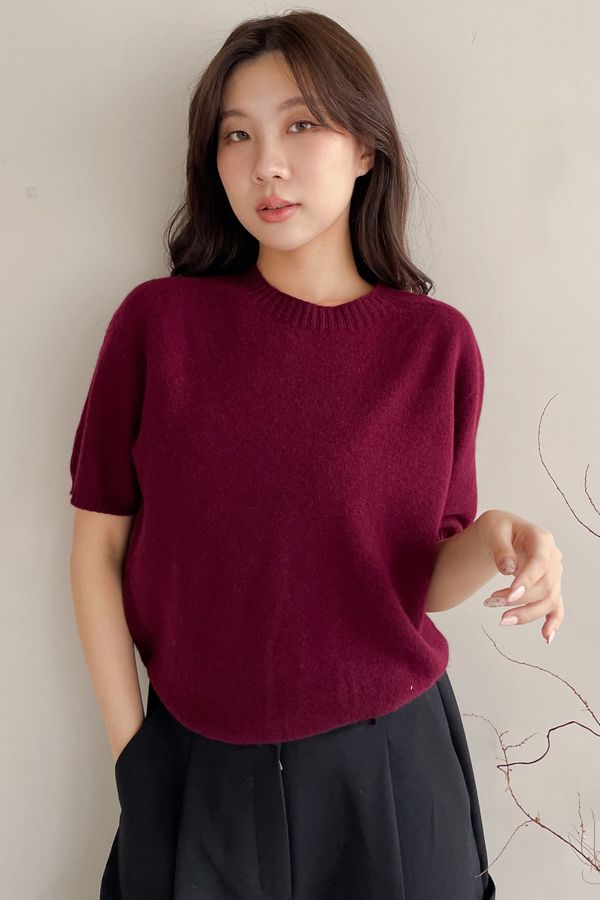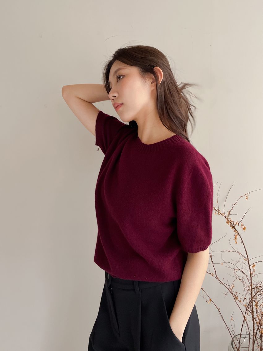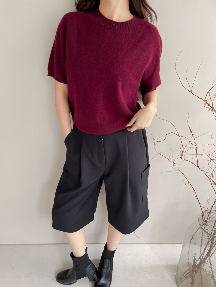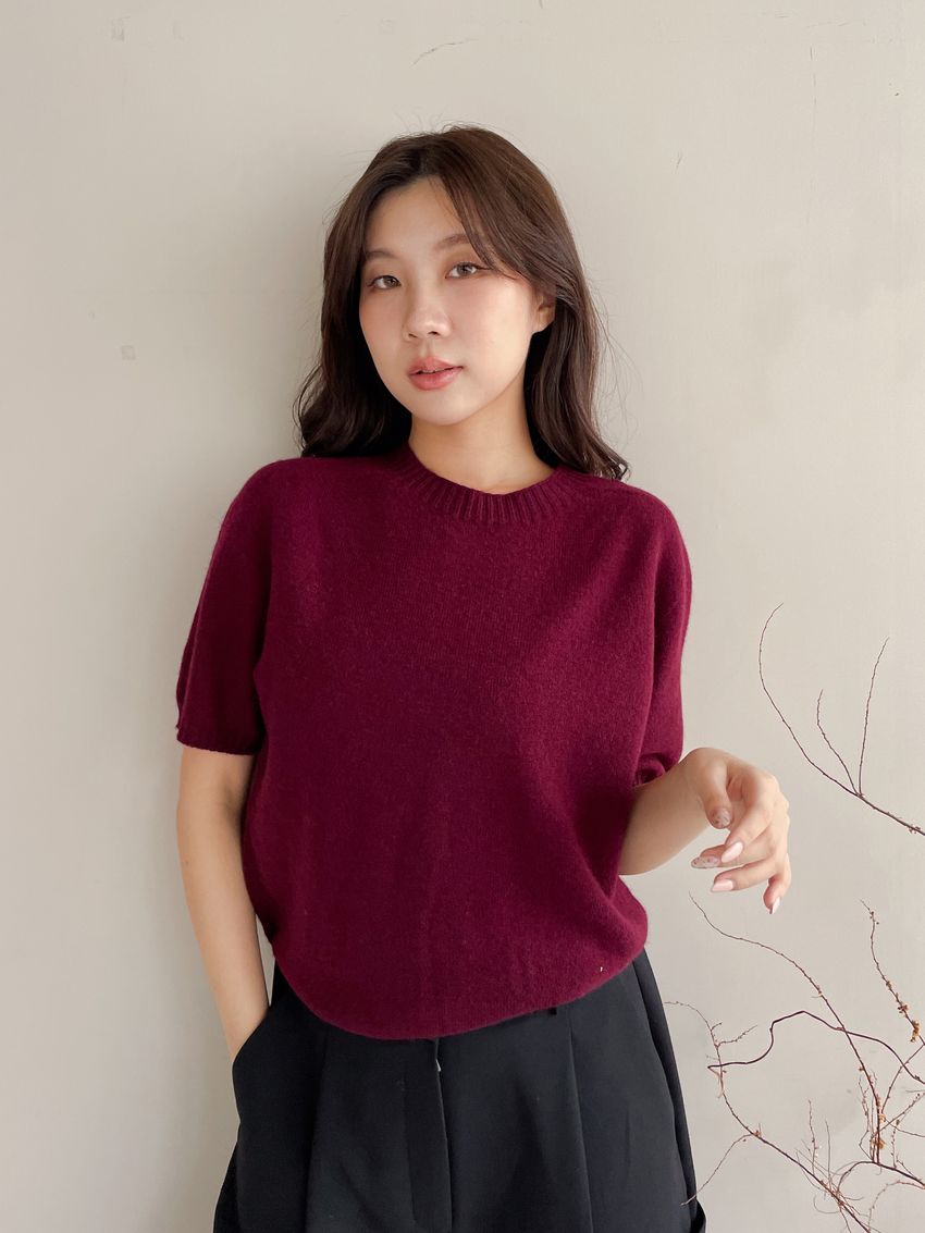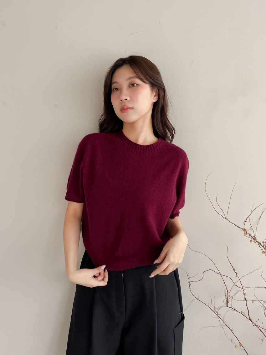 > 壓坑紋領短袖羊毛針織衫