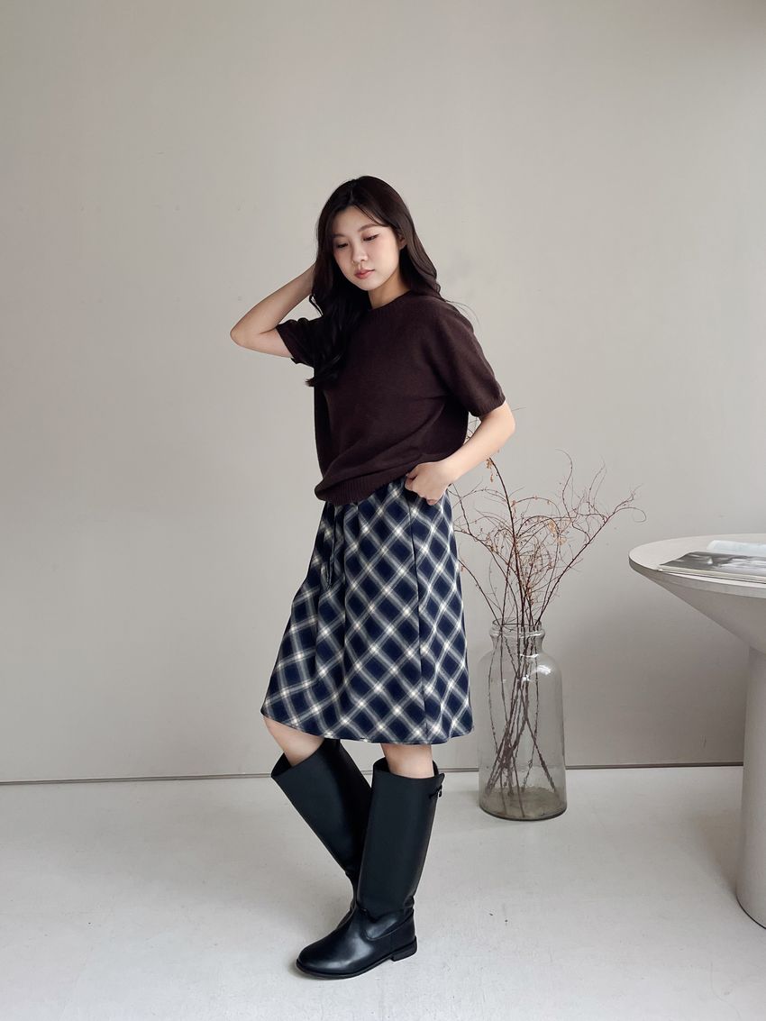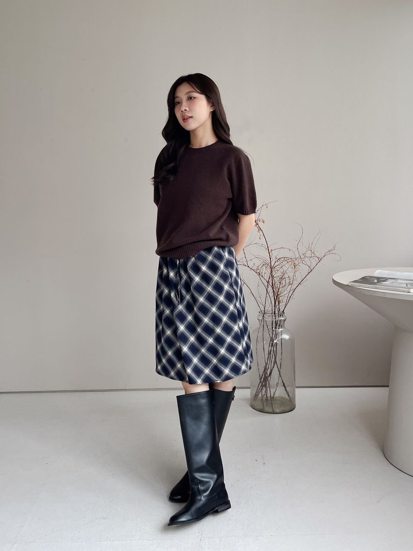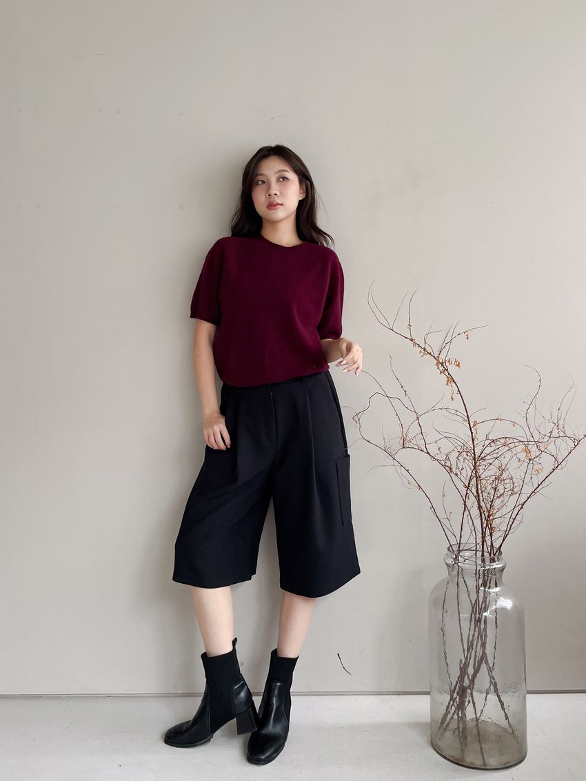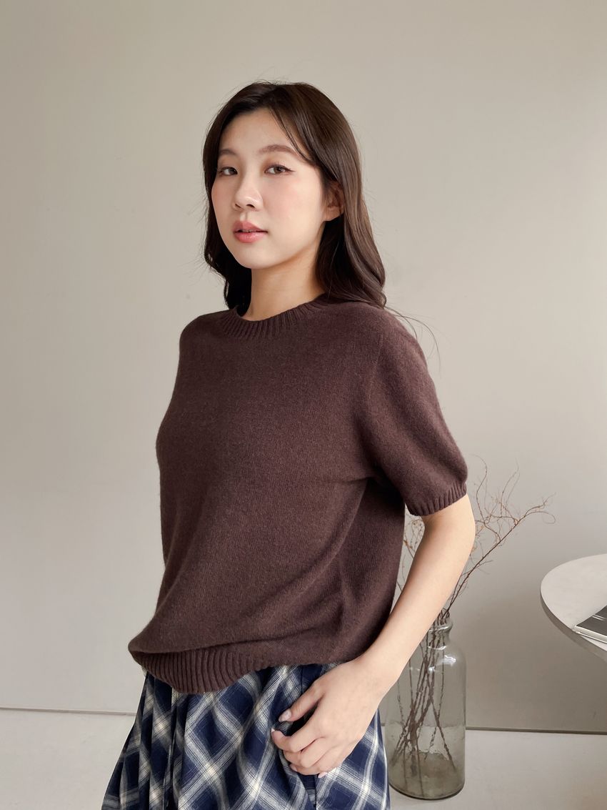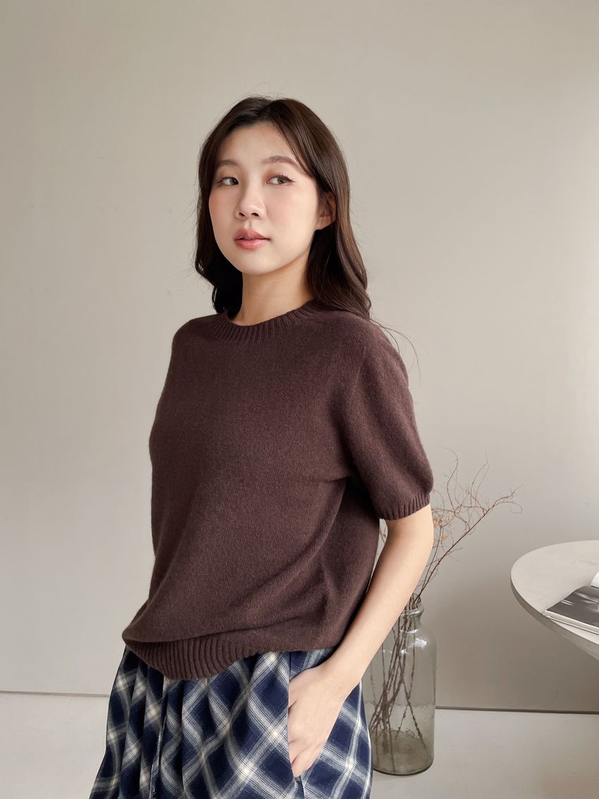 > 壓坑紋領短袖羊毛針織衫