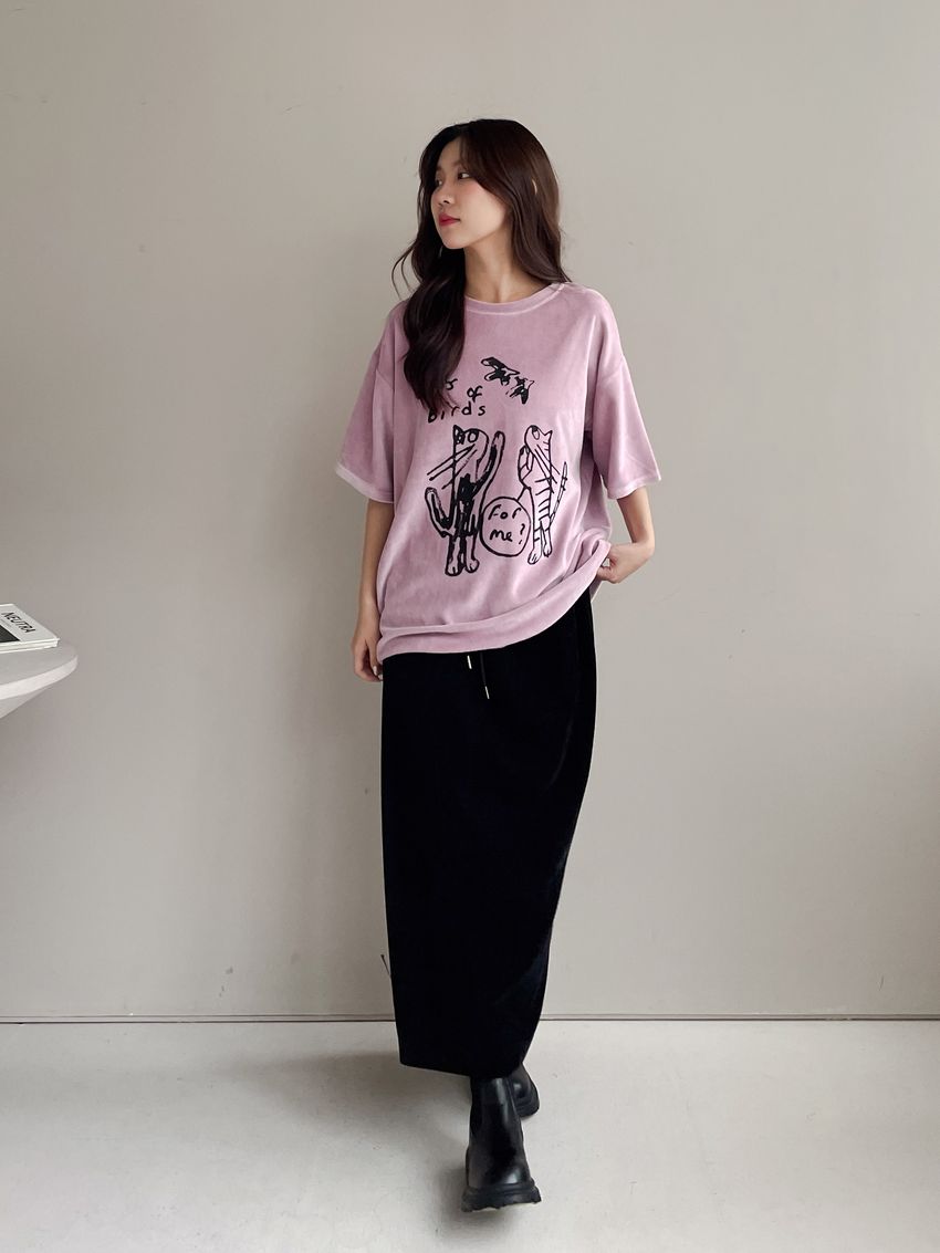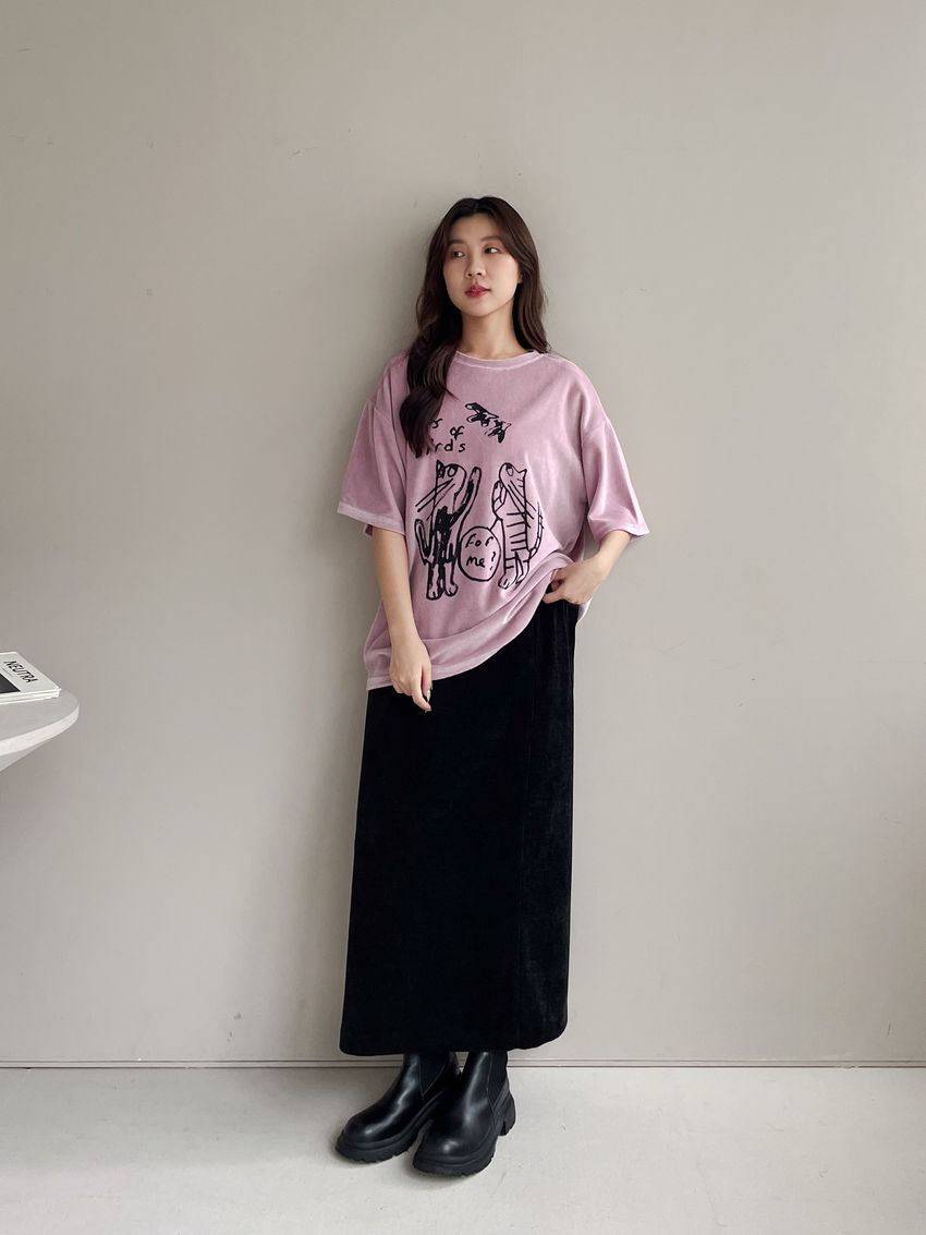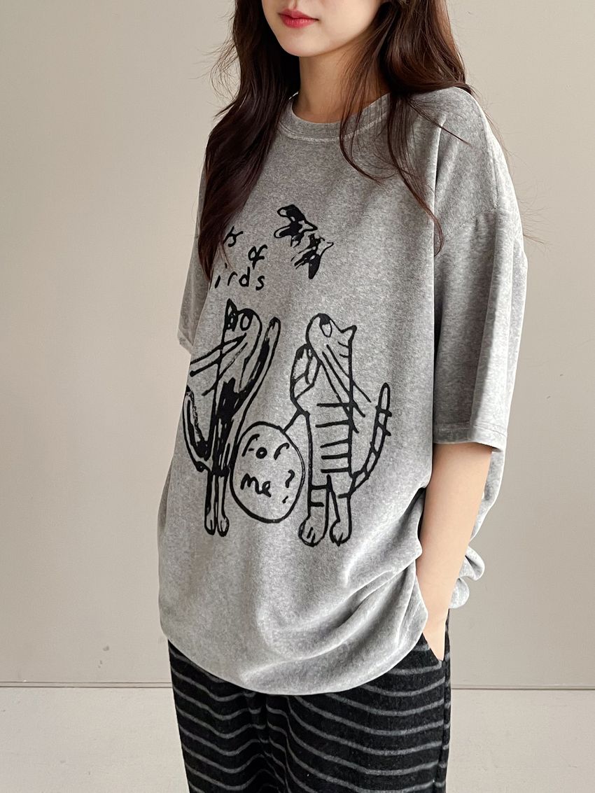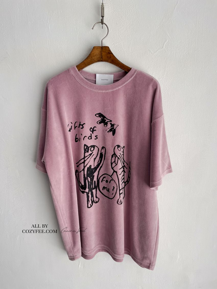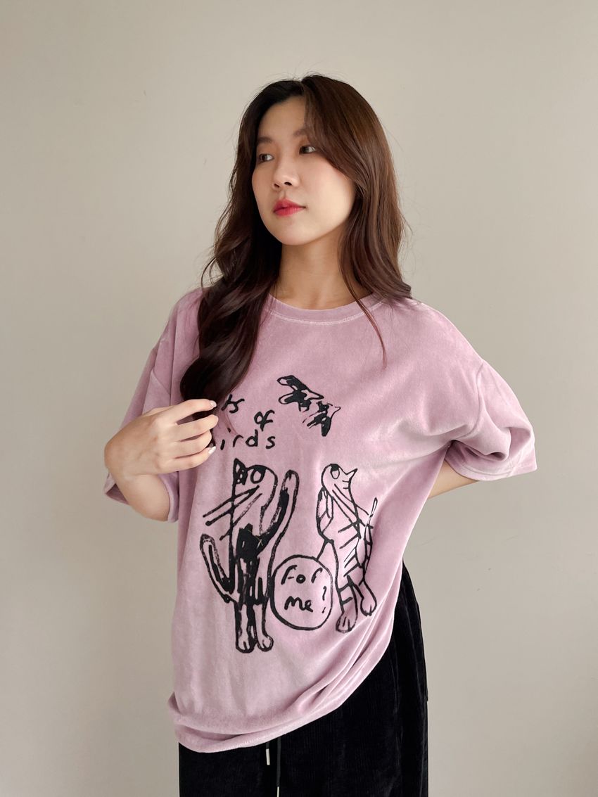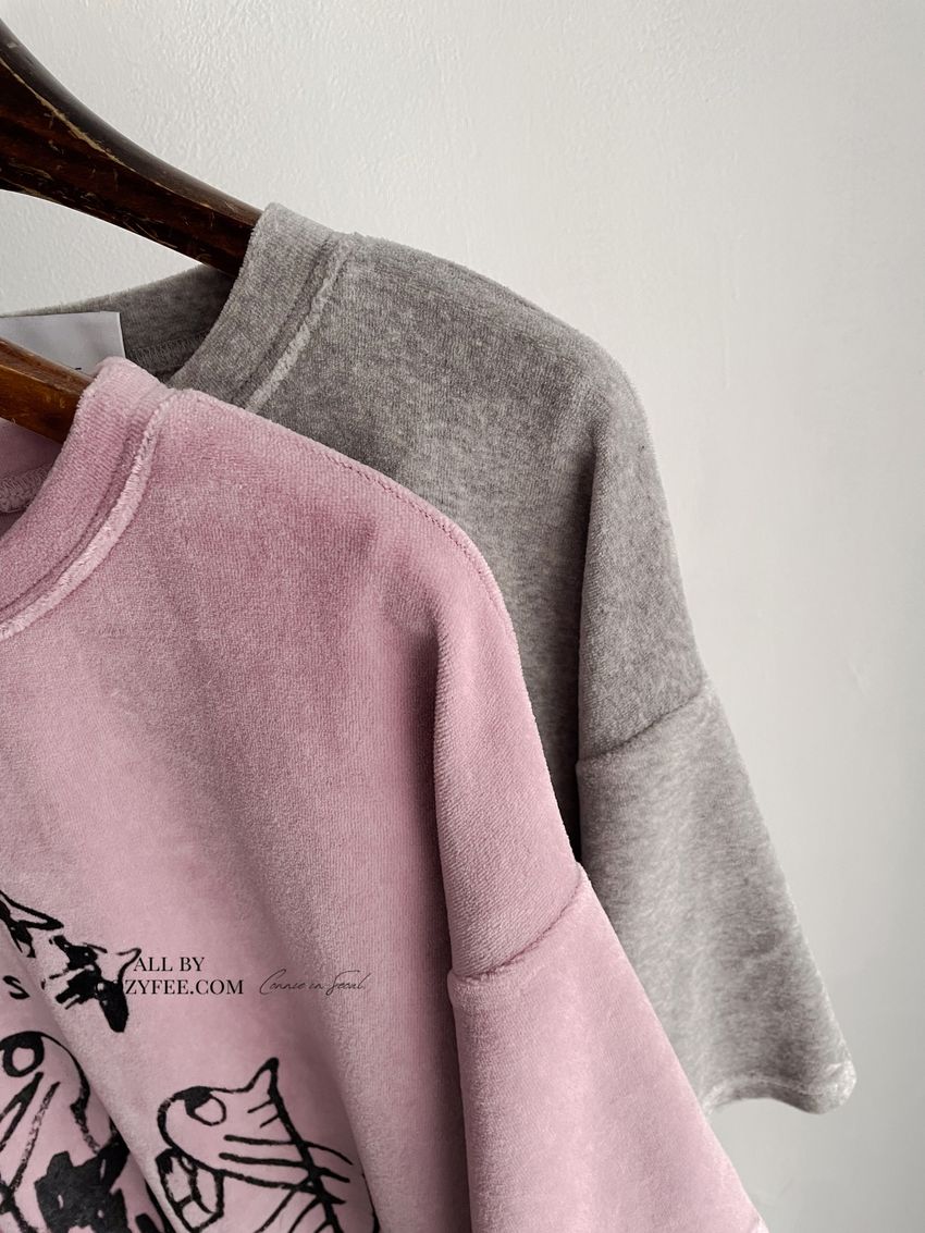 > 塗鴉貓天鵝絨長版T