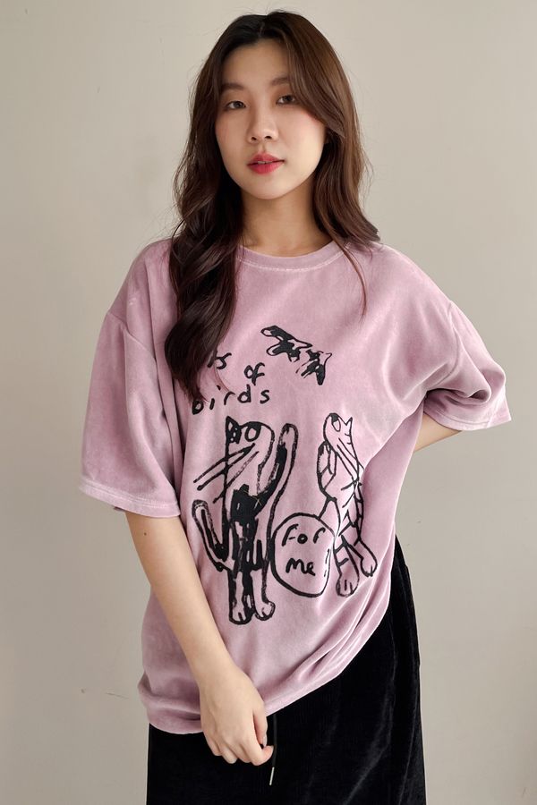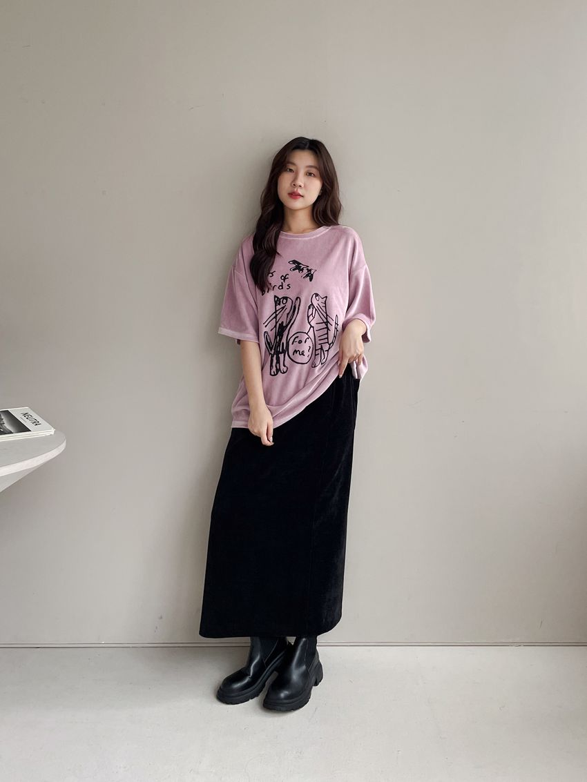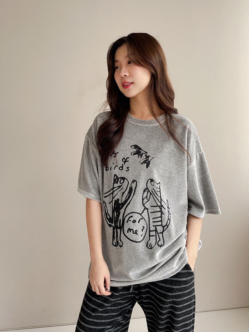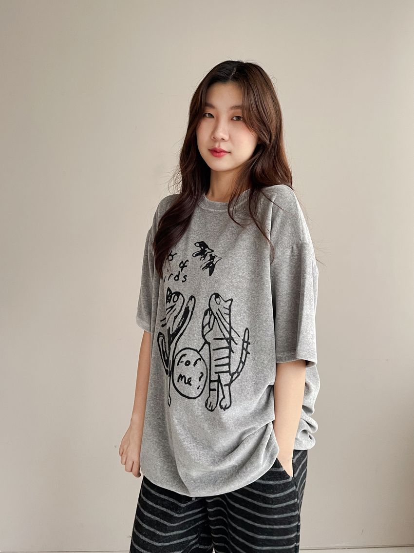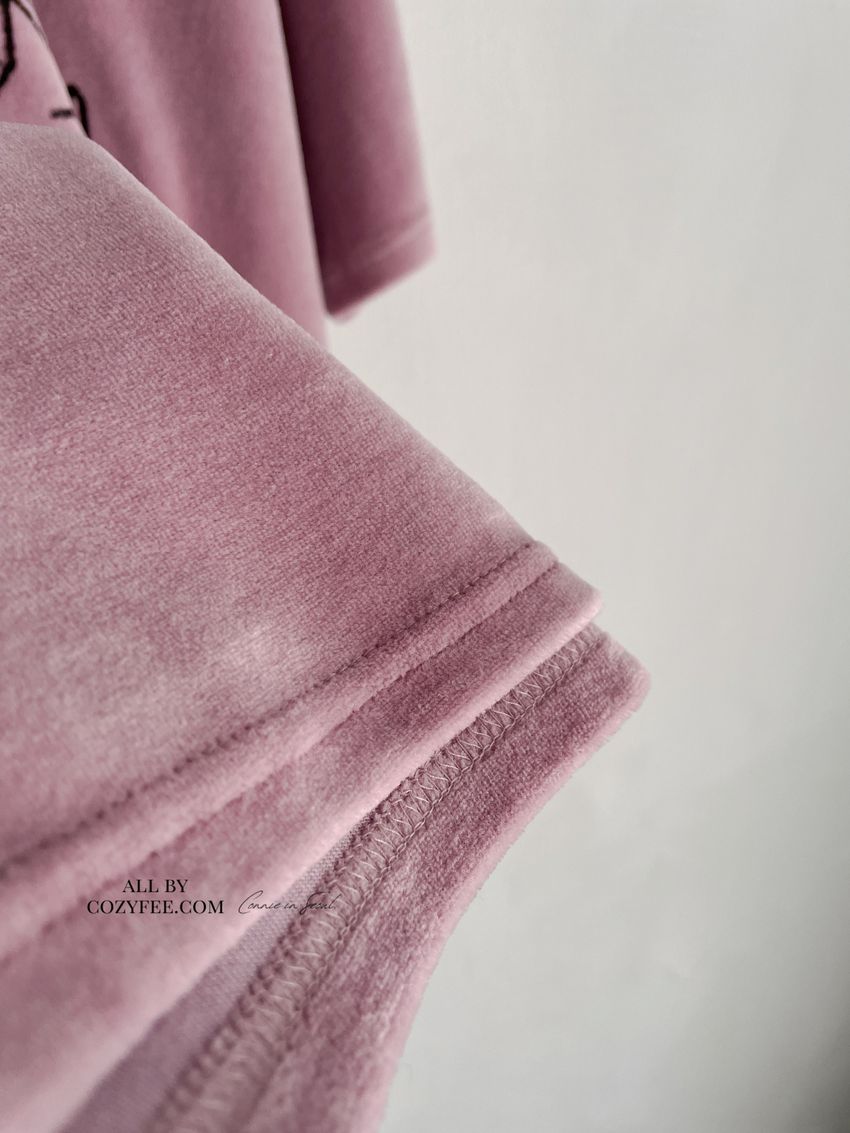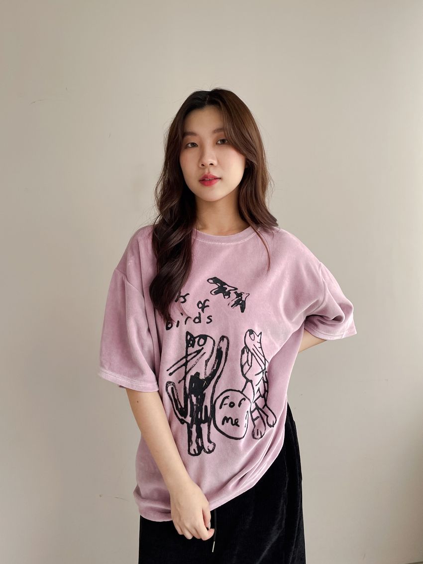 > 塗鴉貓天鵝絨長版T