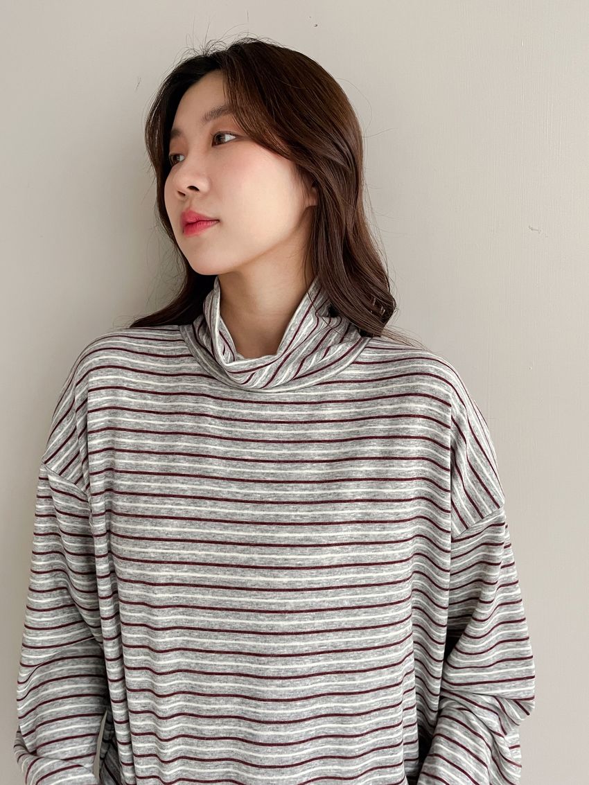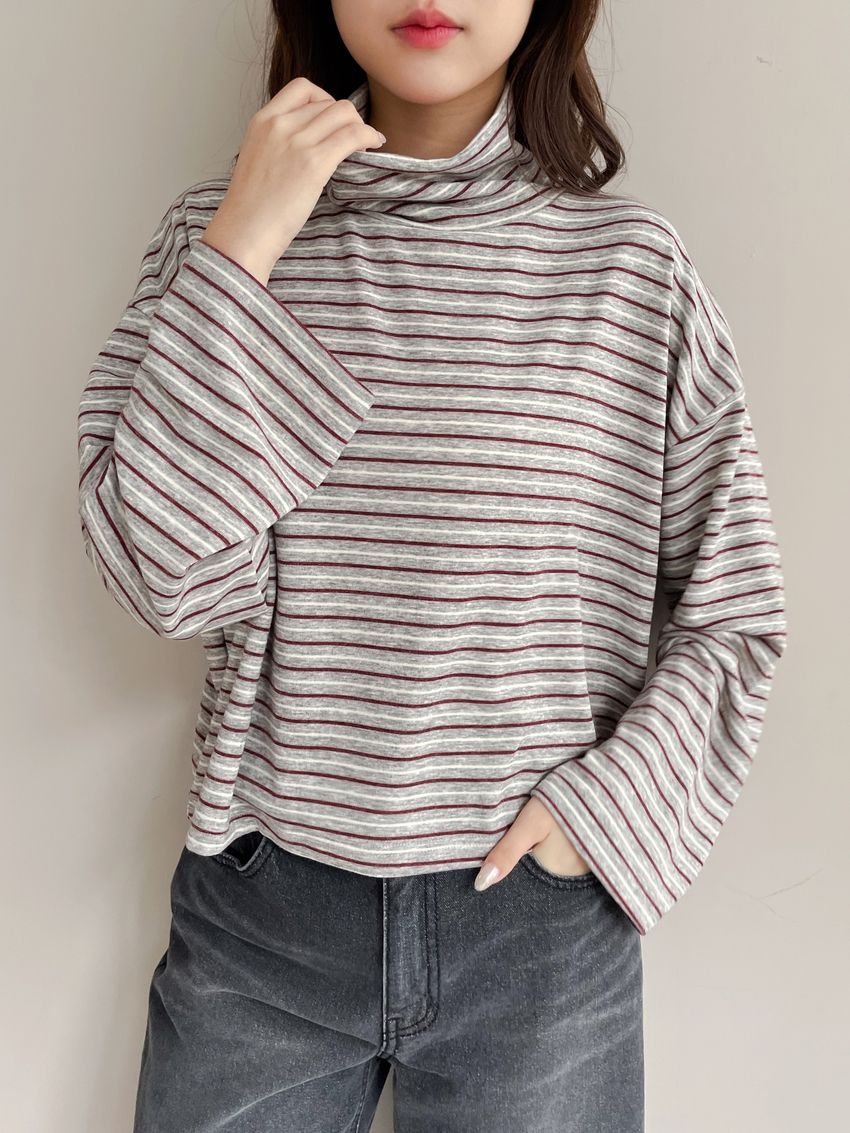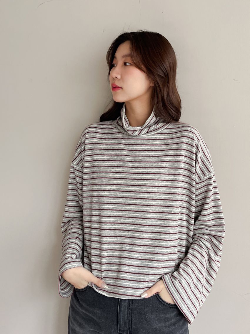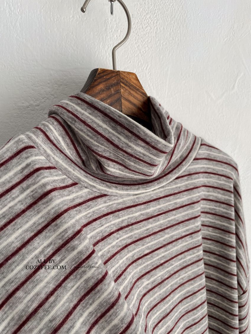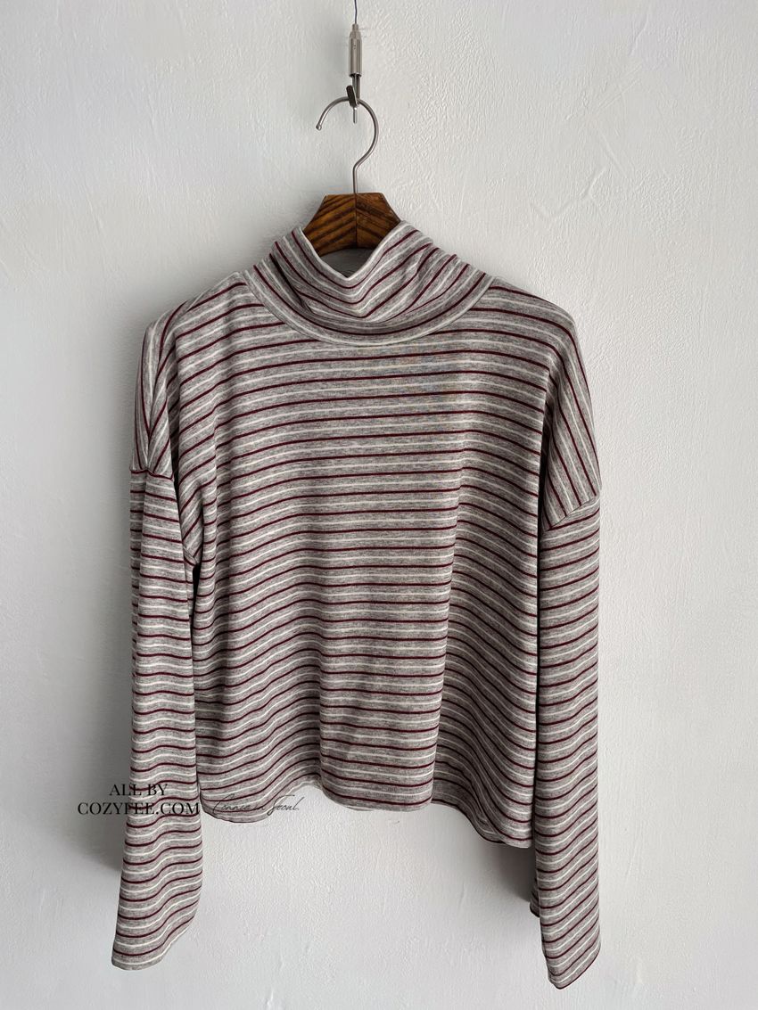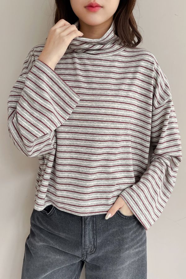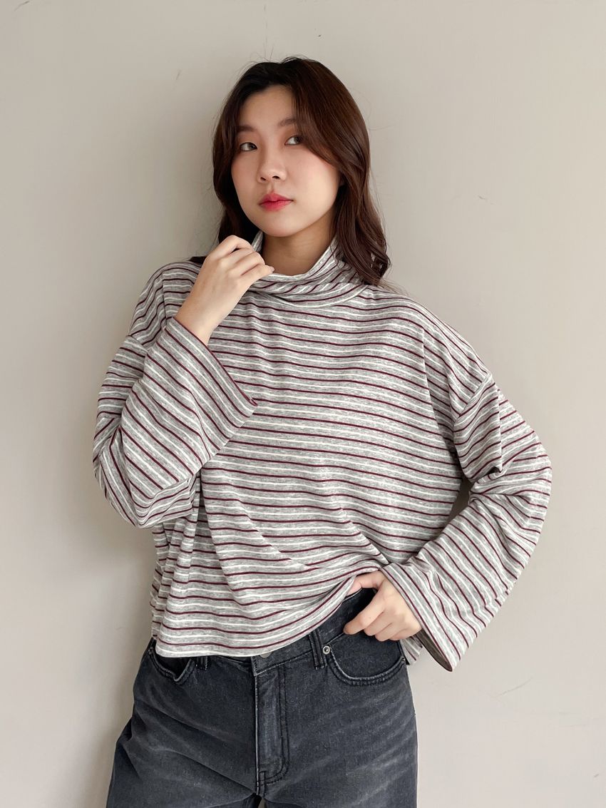 > 鬆鬆高領條紋短版長T
