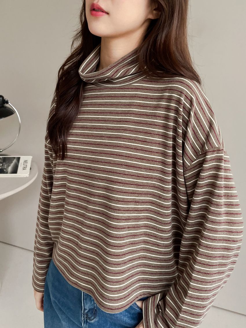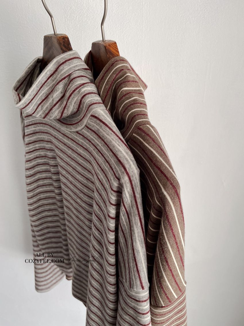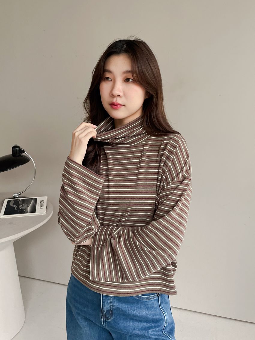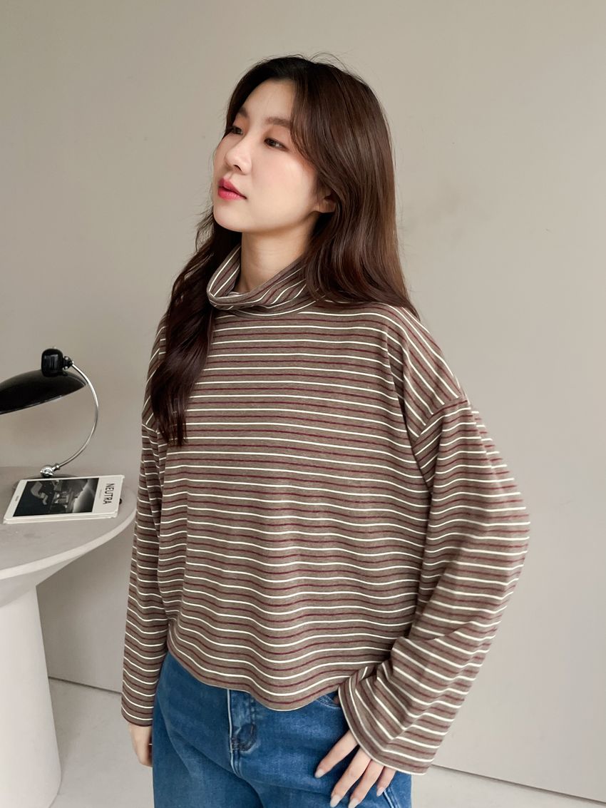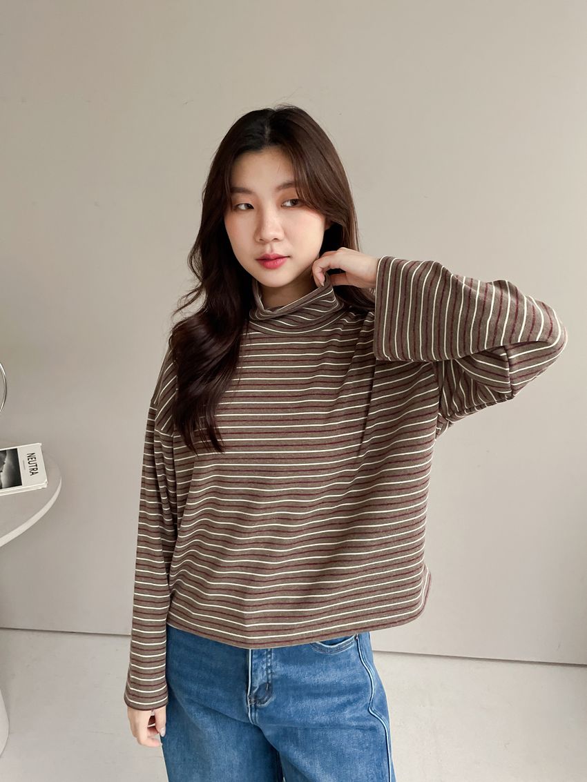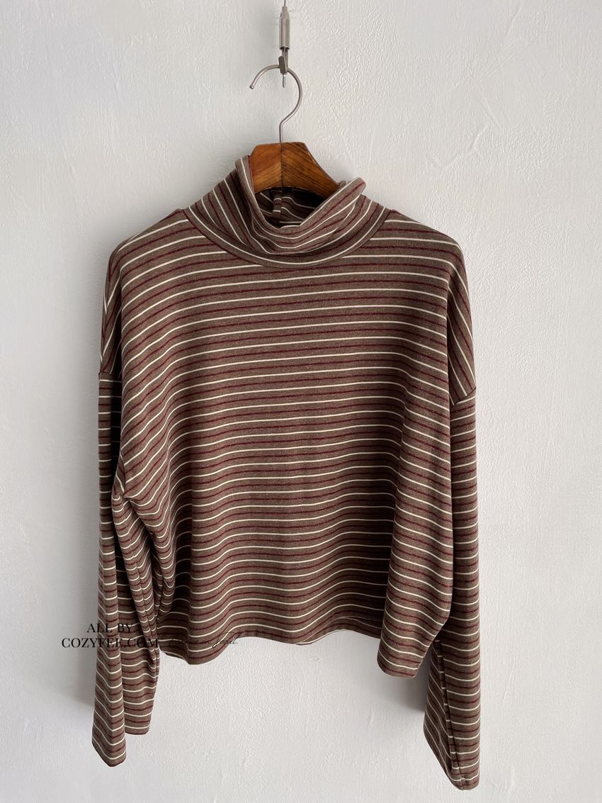 > 鬆鬆高領條紋短版長T