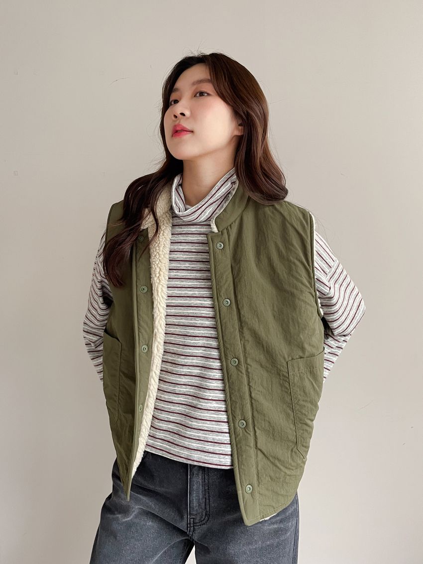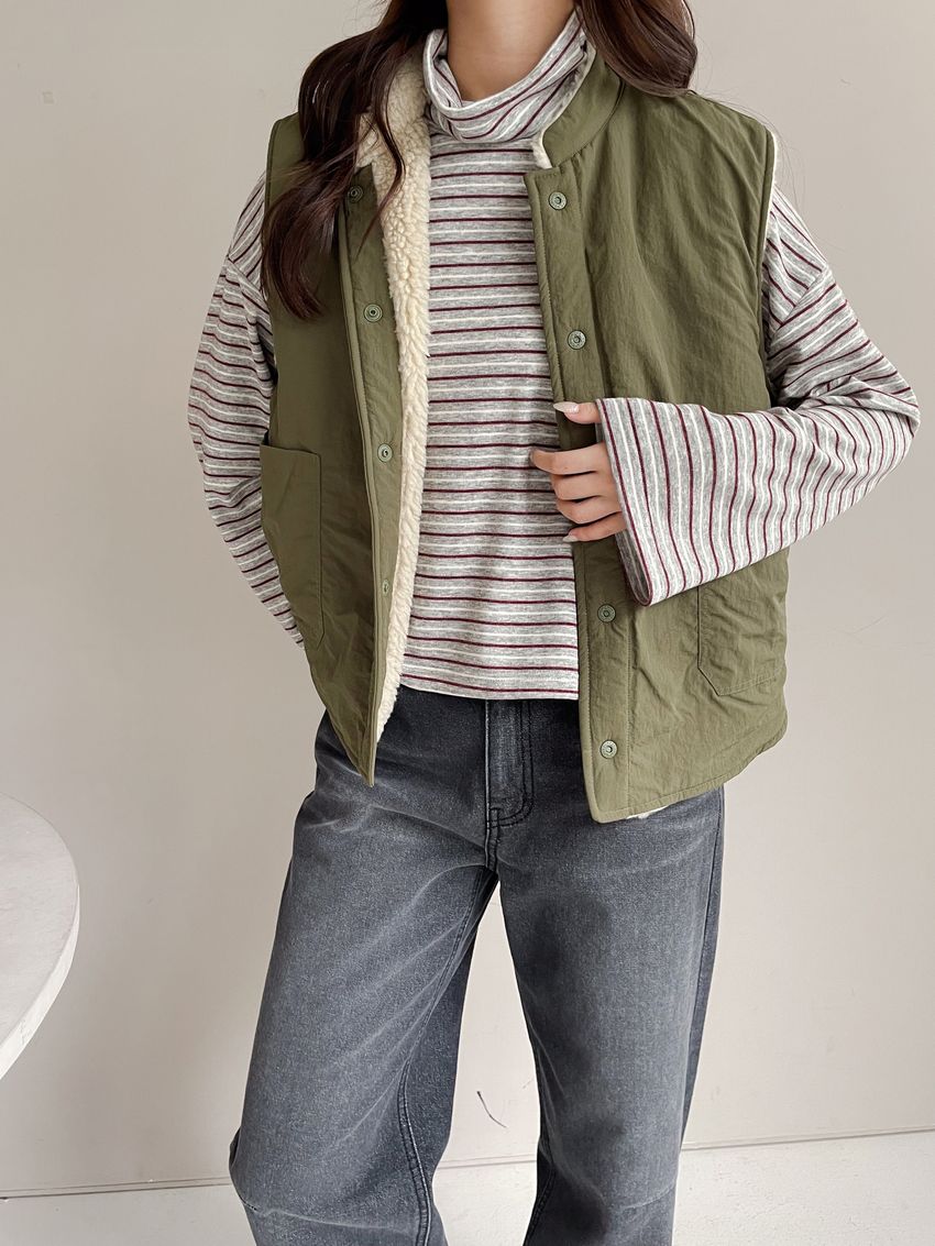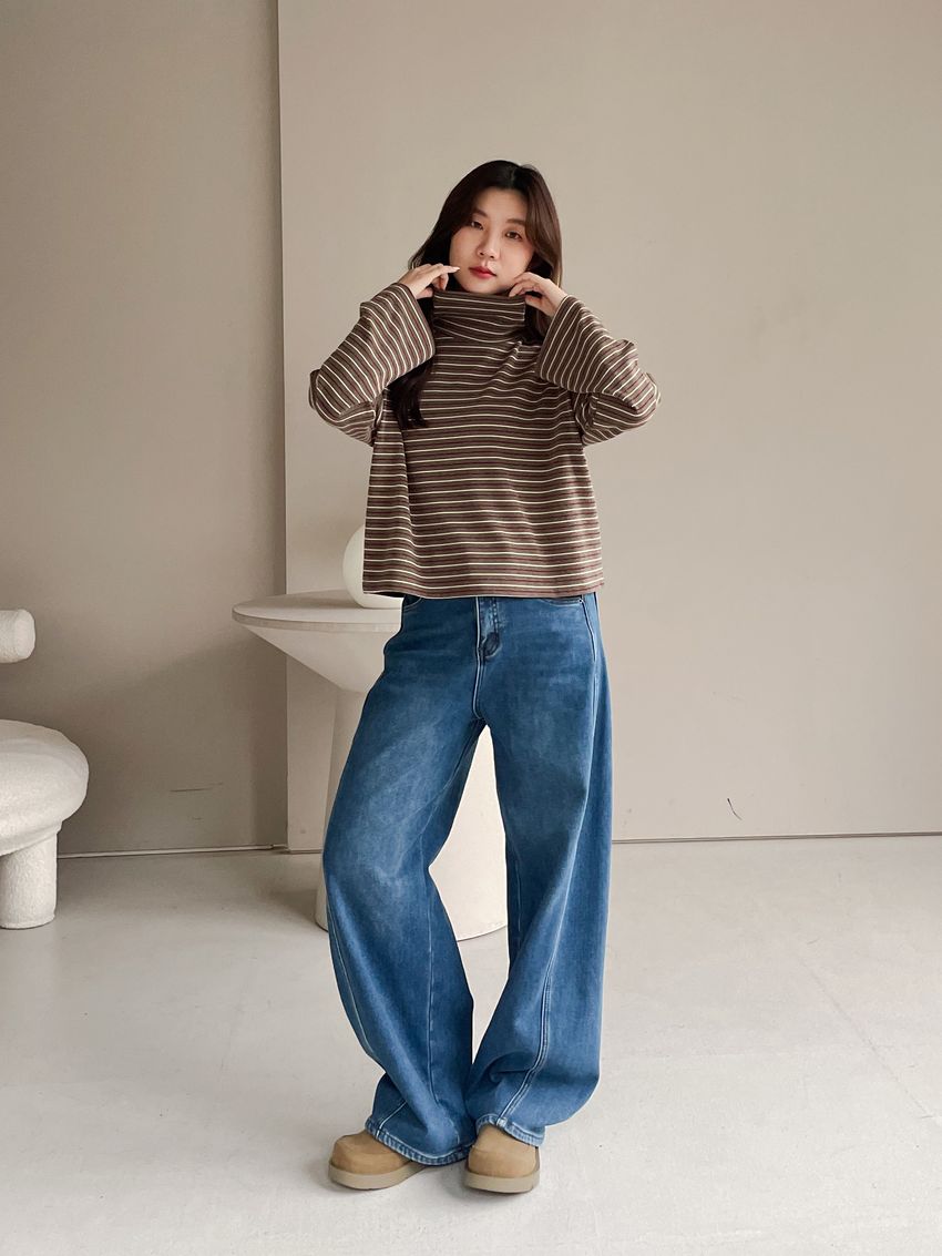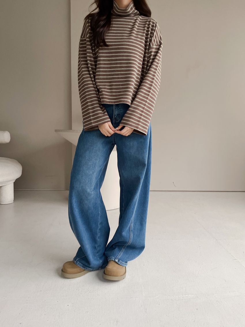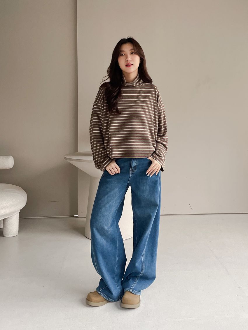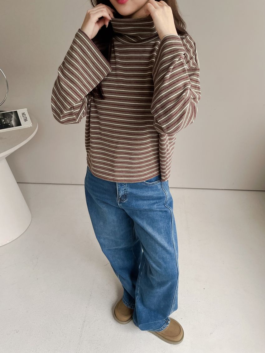 > 鬆鬆高領條紋短版長T
