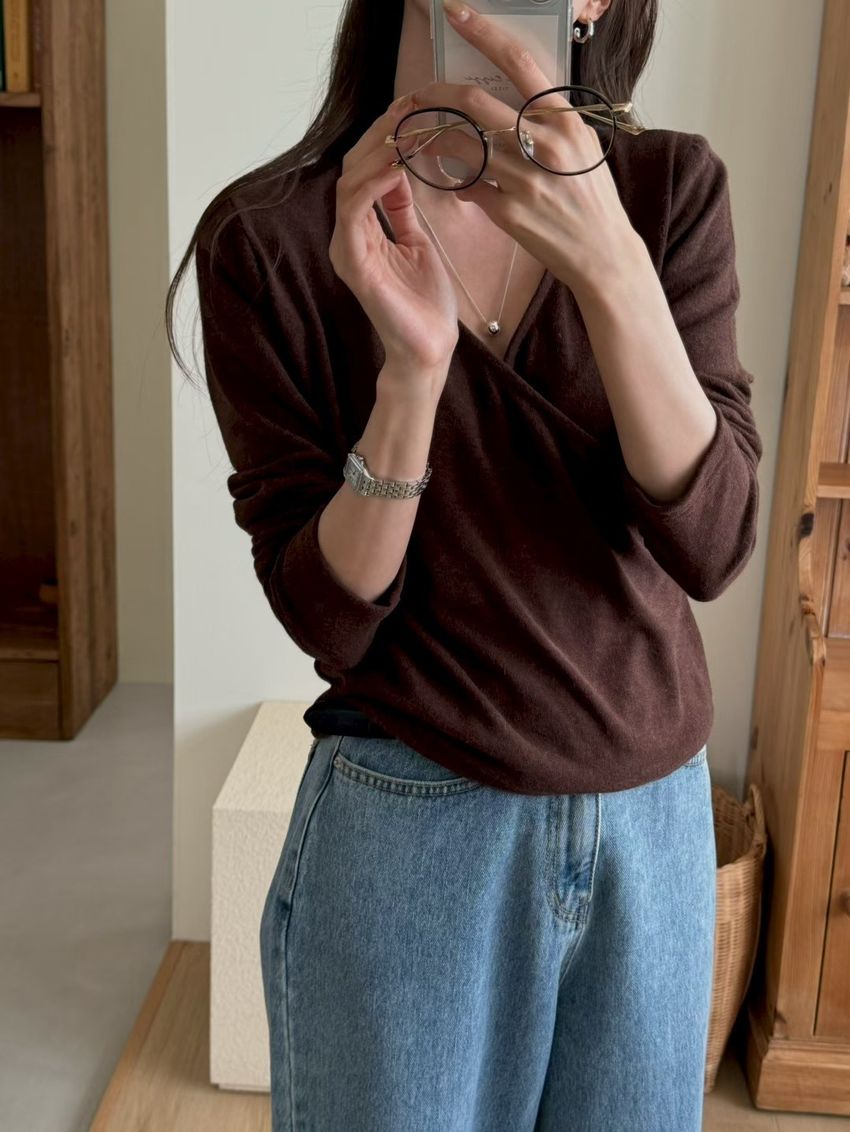 > 氣質交錯V領針織素T