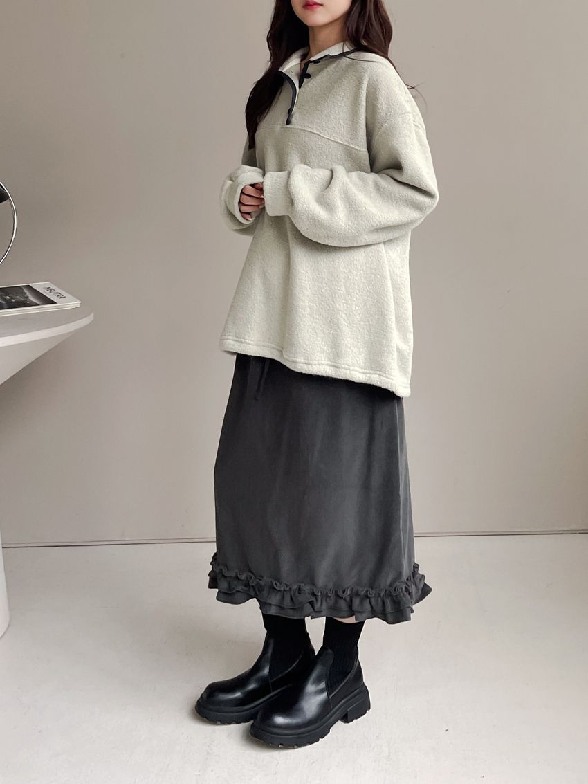 > 黑滾領四釦毛巾布刷毛大學T