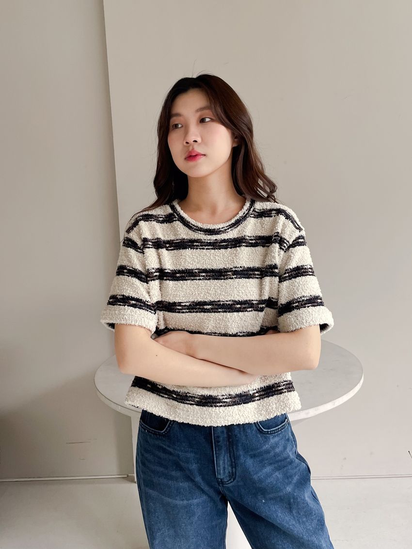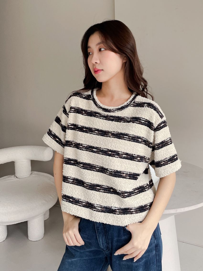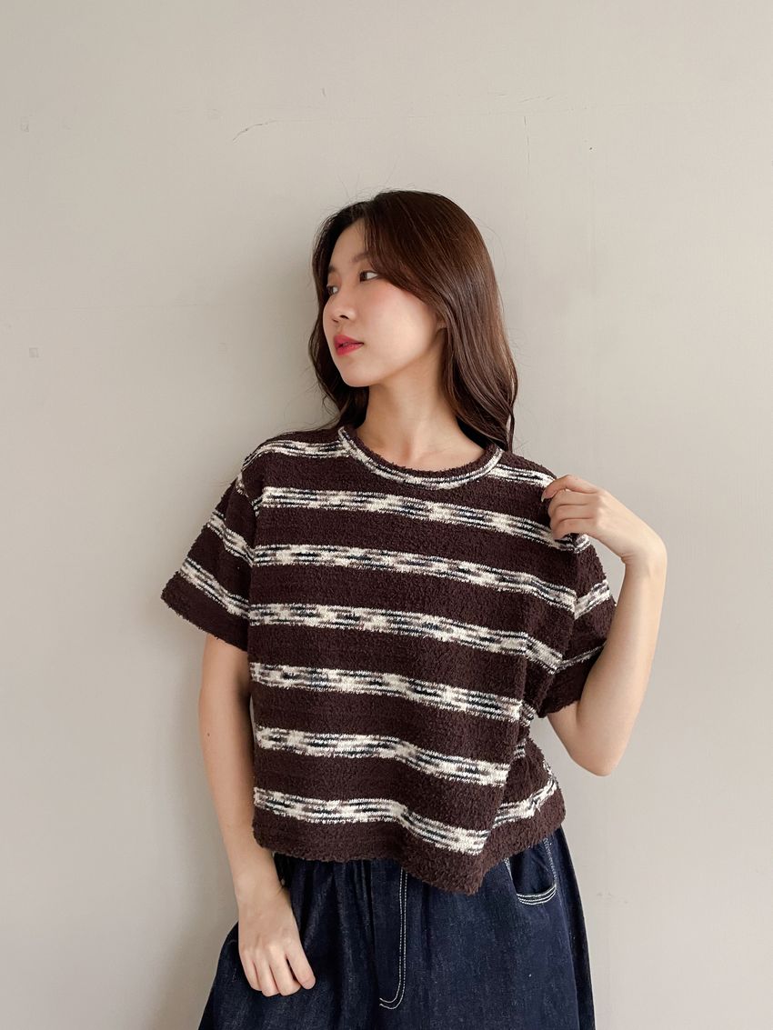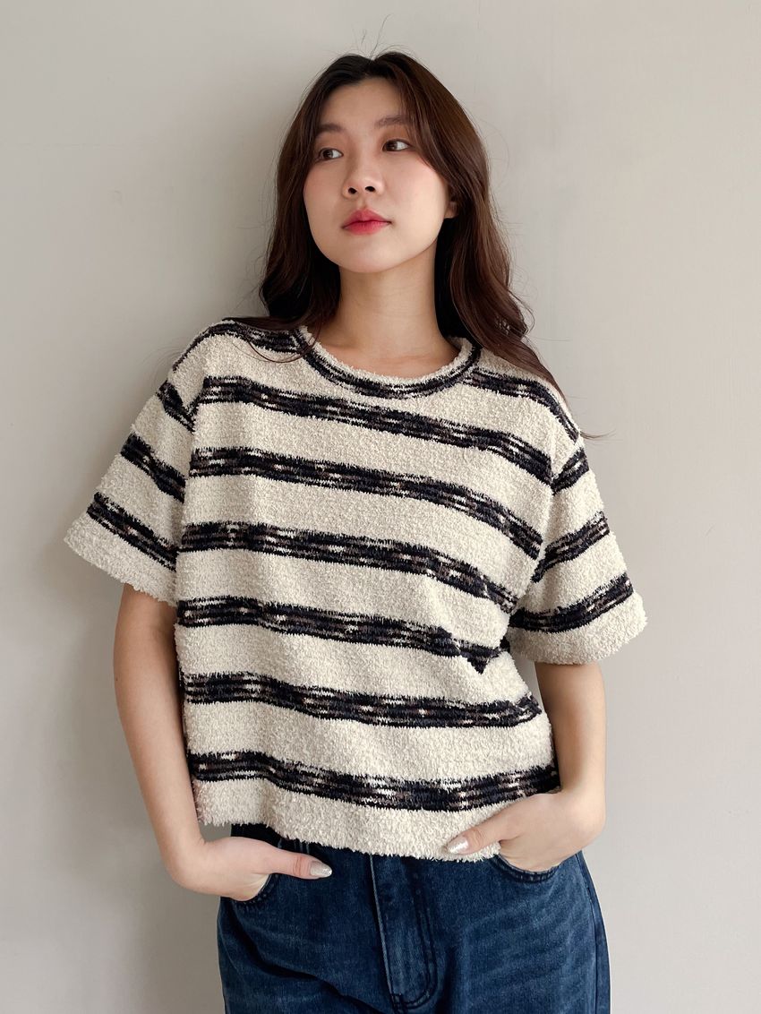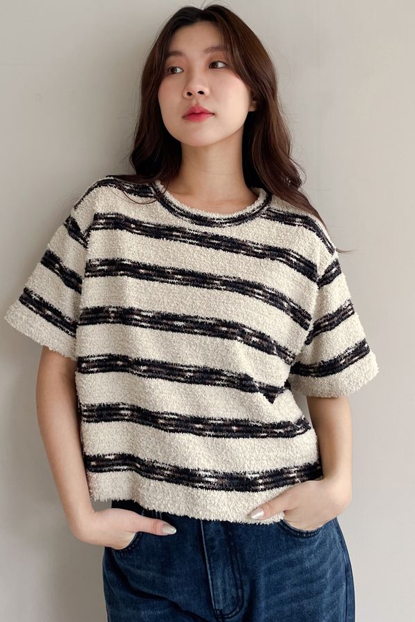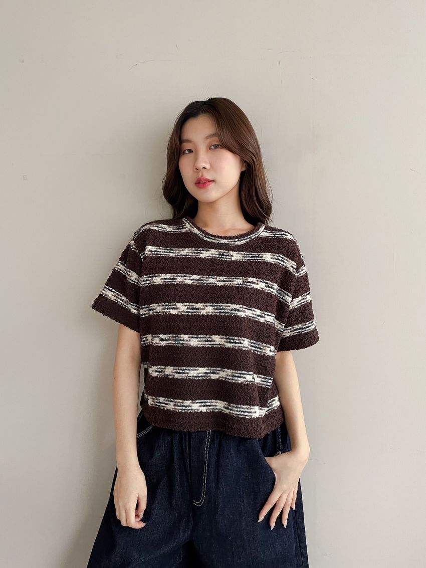 > 鬆軟熊寶條紋短T