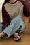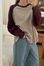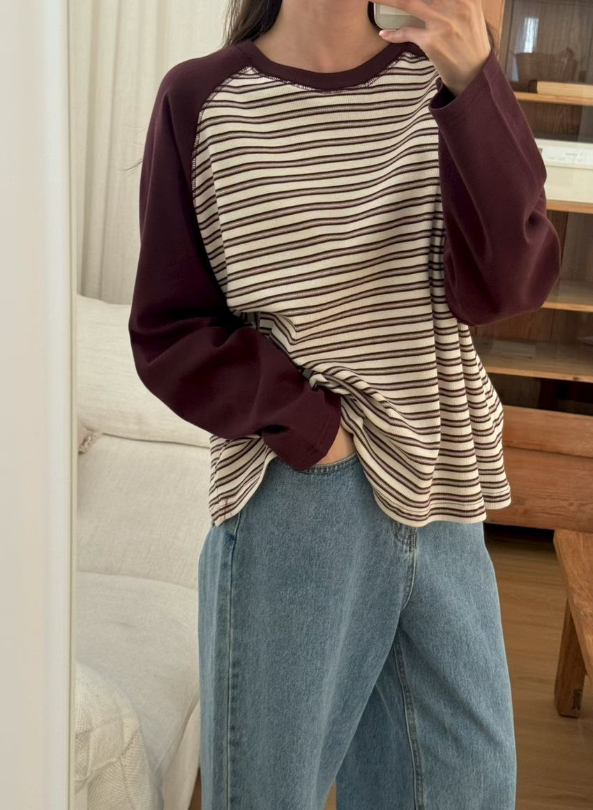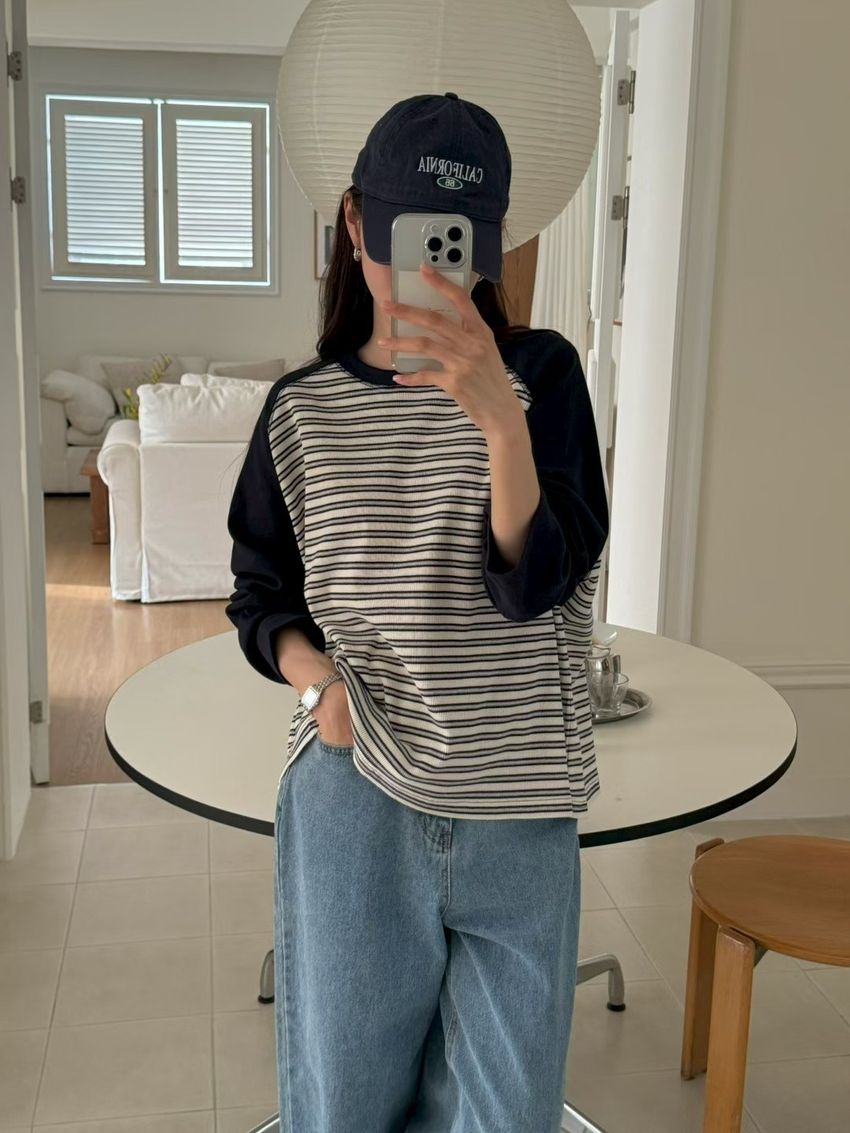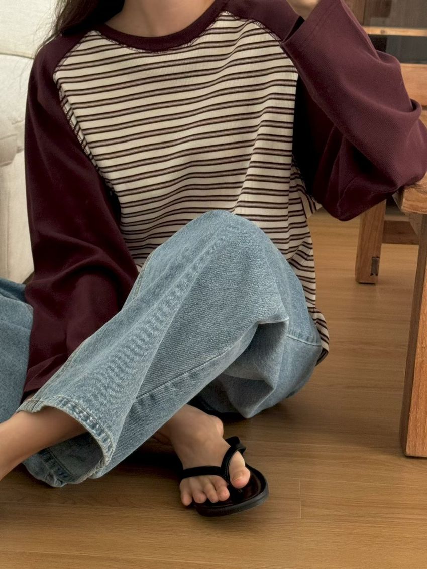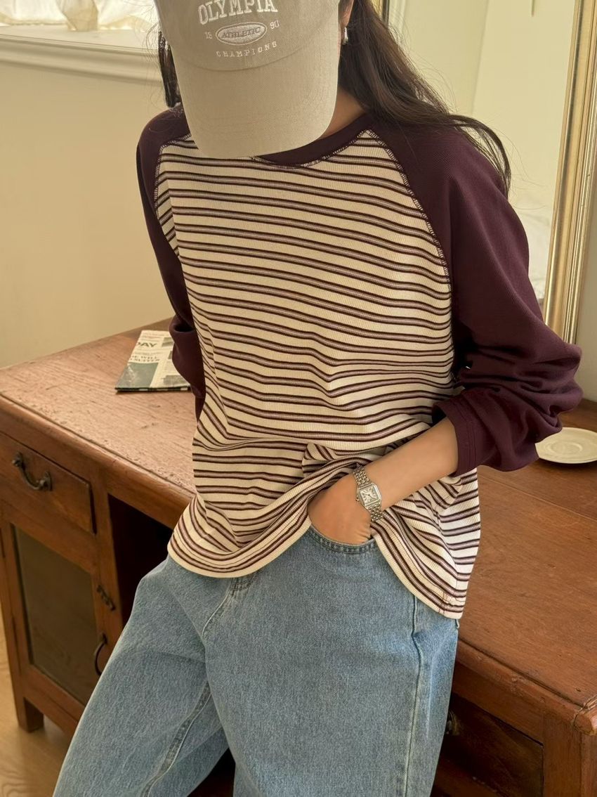 拼接條紋插肩袖長T