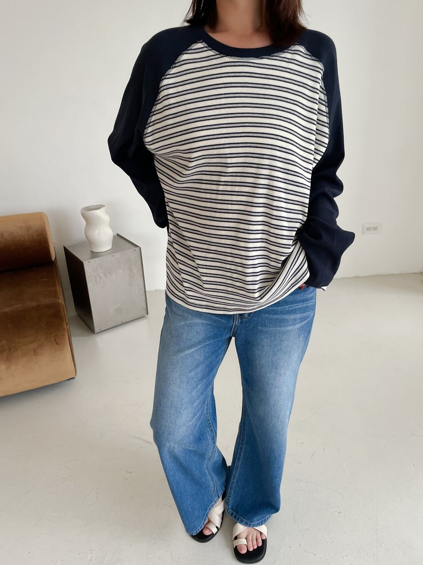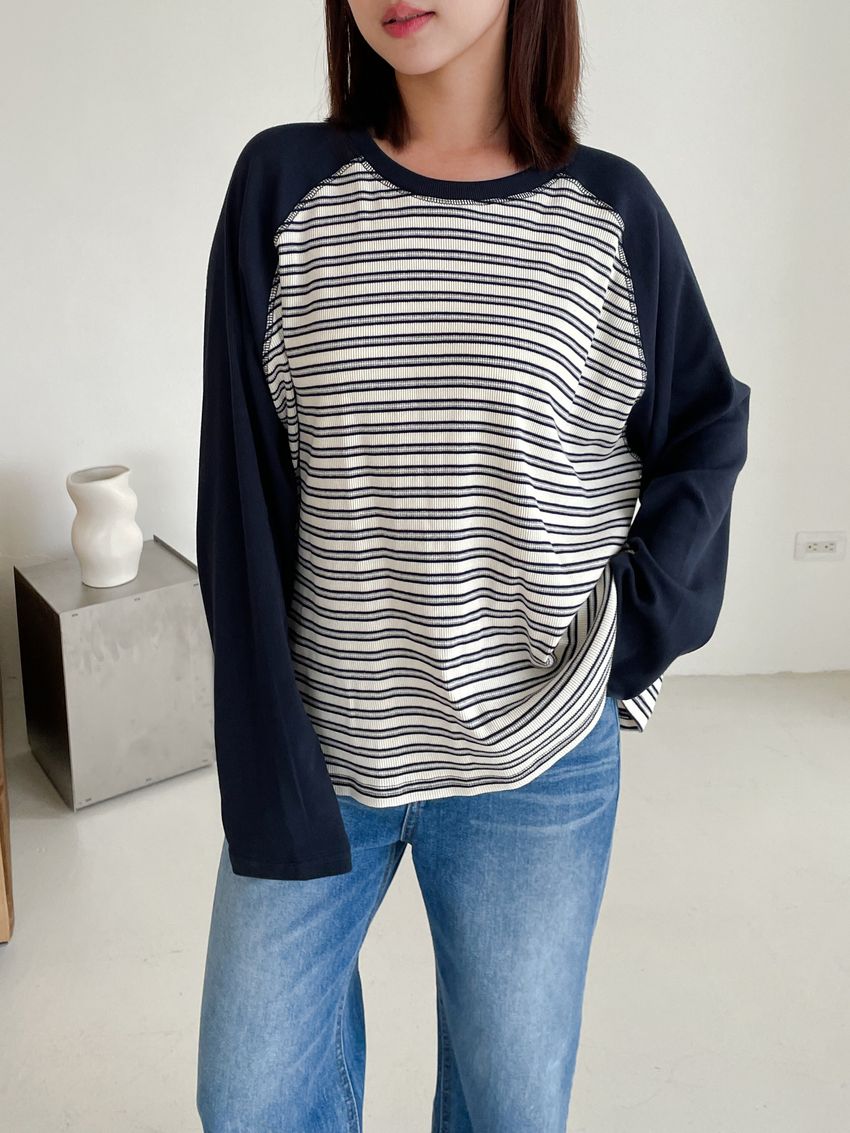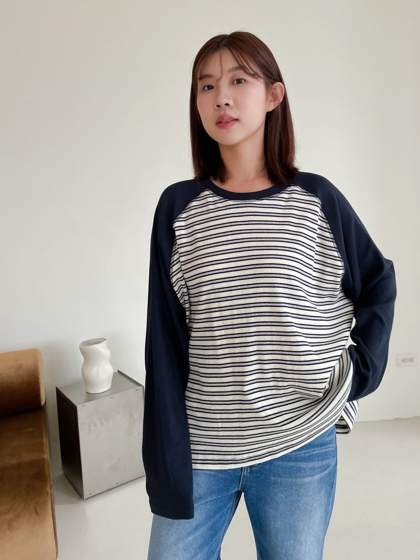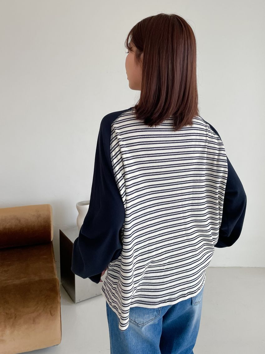> 拼接條紋插肩袖長T