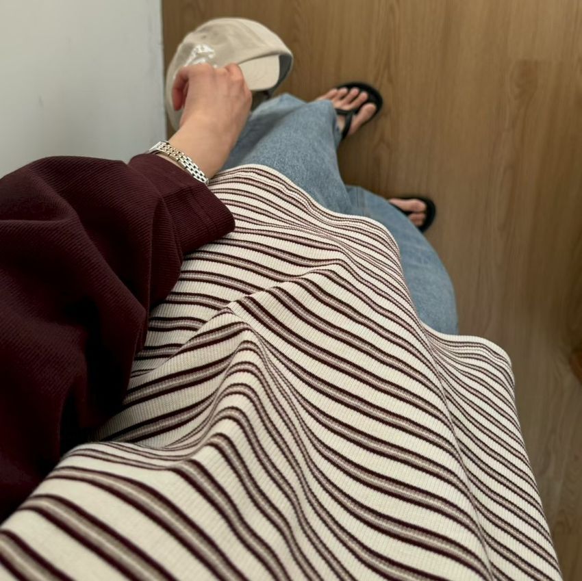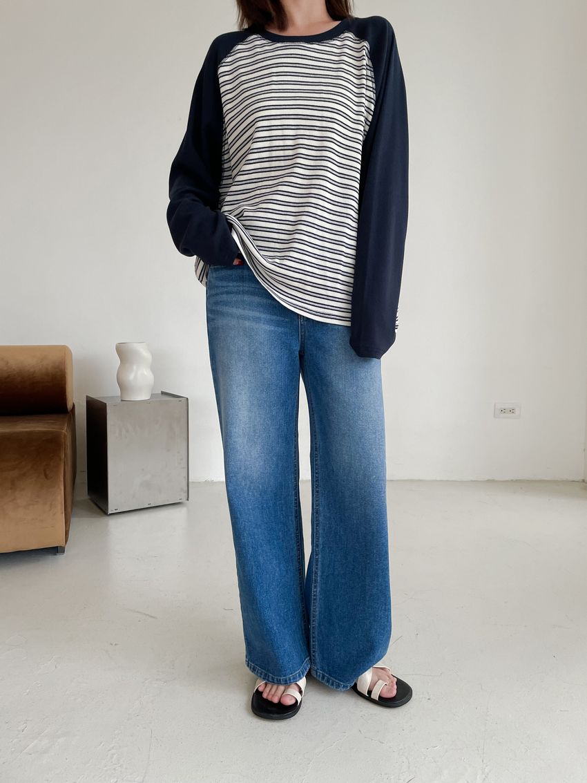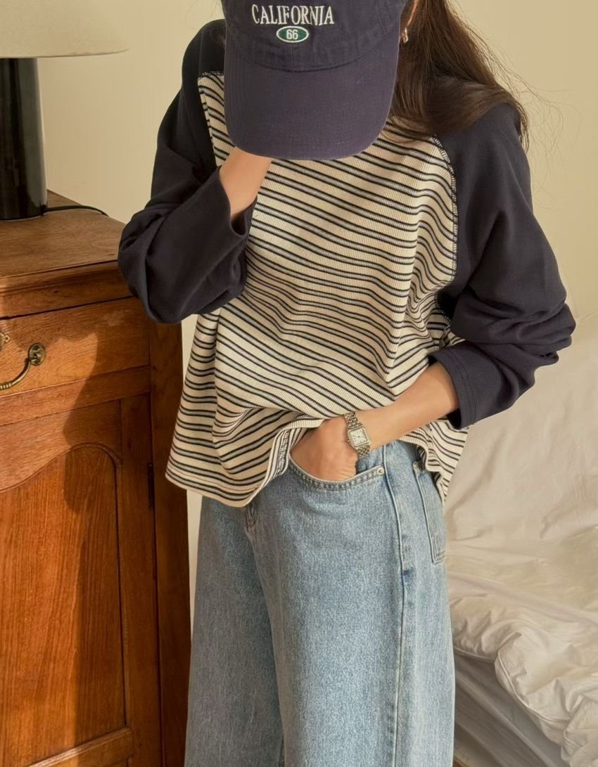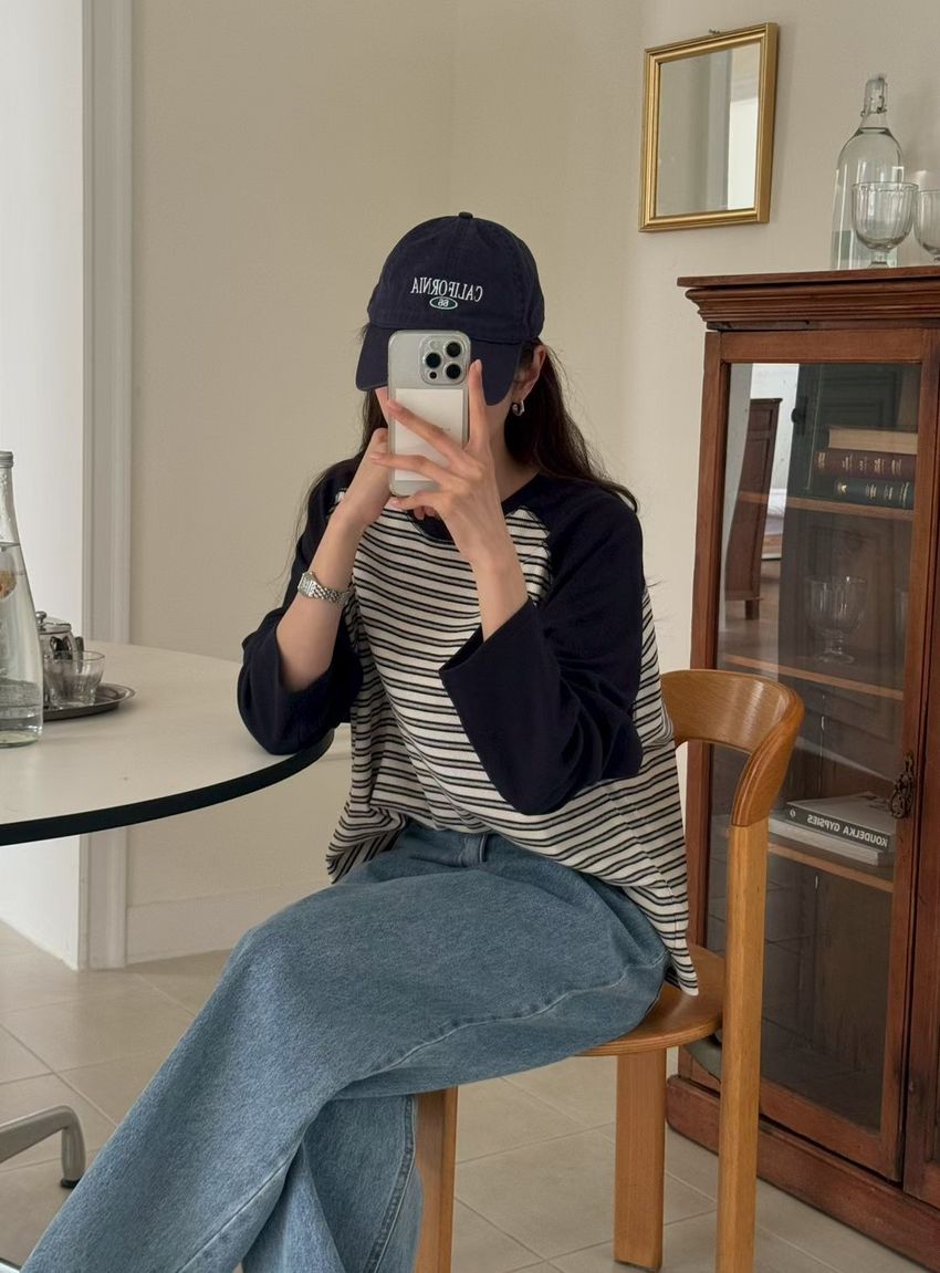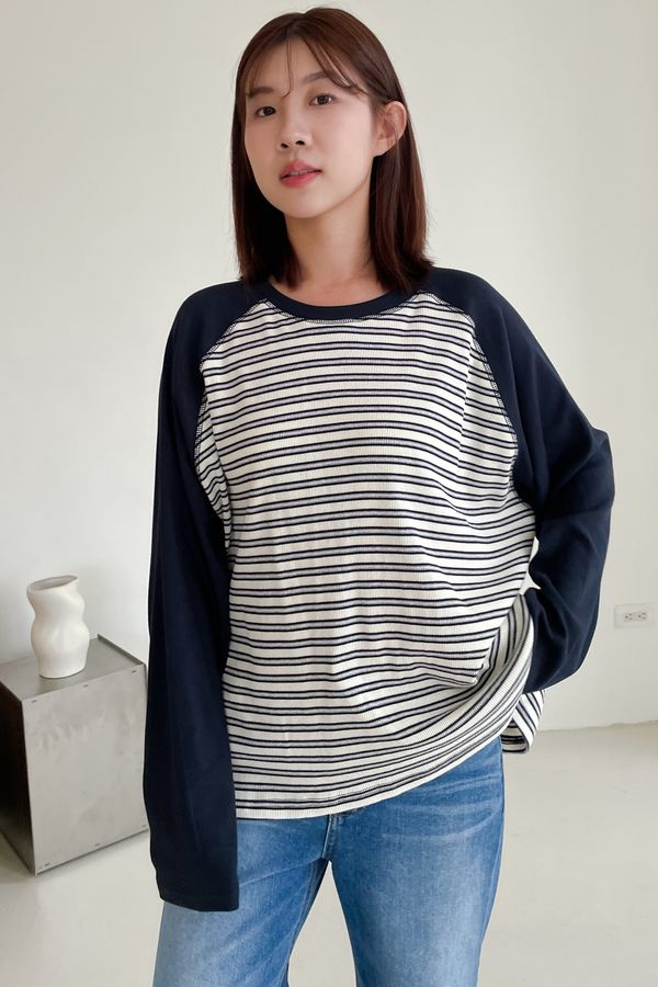 > 拼接條紋插肩袖長T