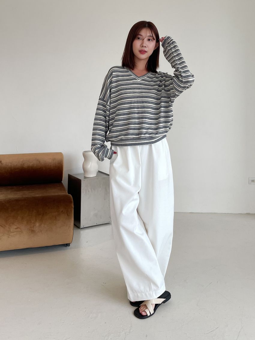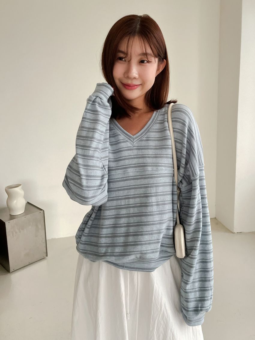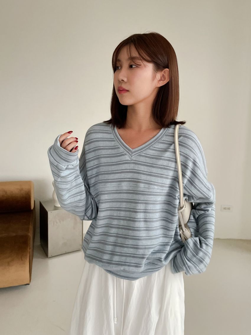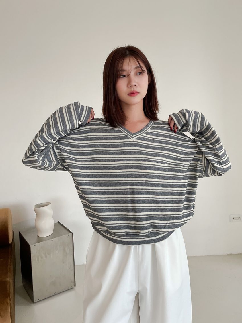 Connie推薦款!桃型V領條紋針織大學T