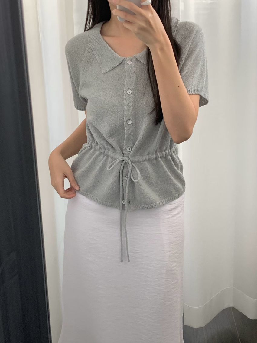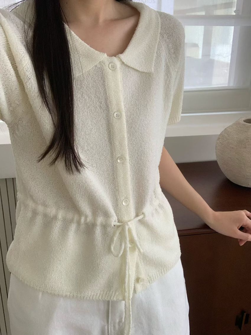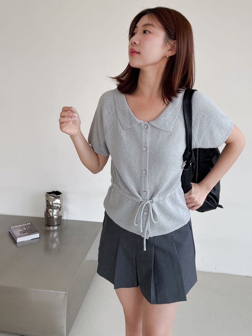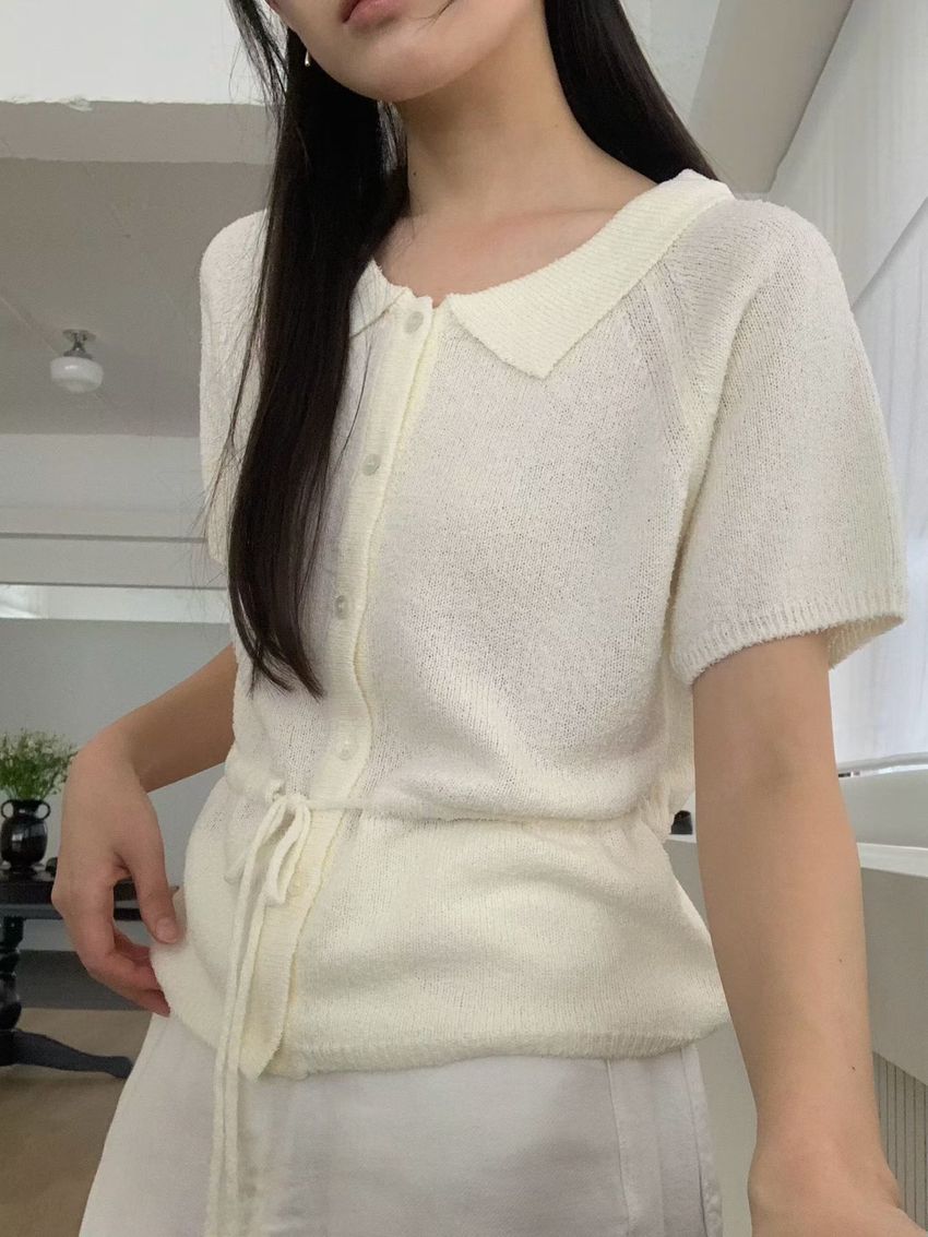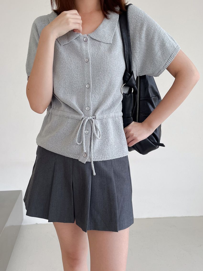 > 翻領腰抽繩開襟針織衫