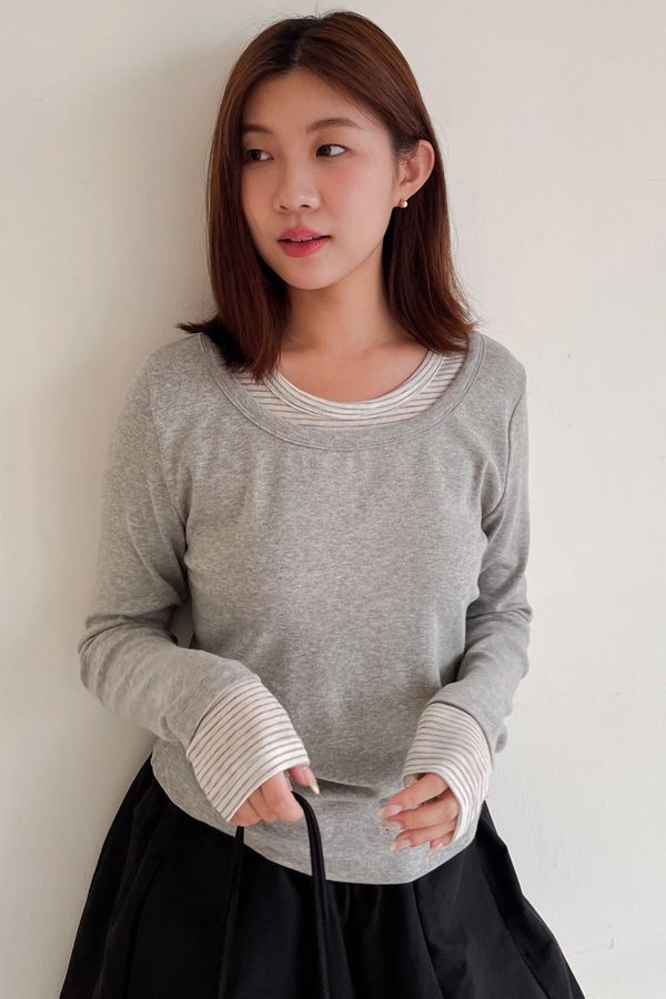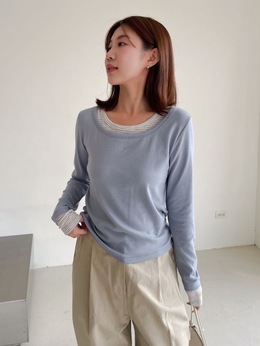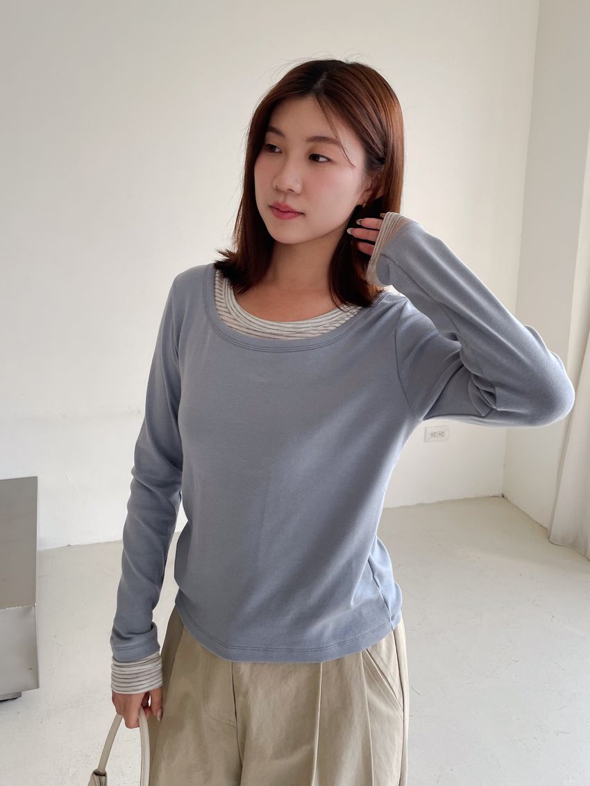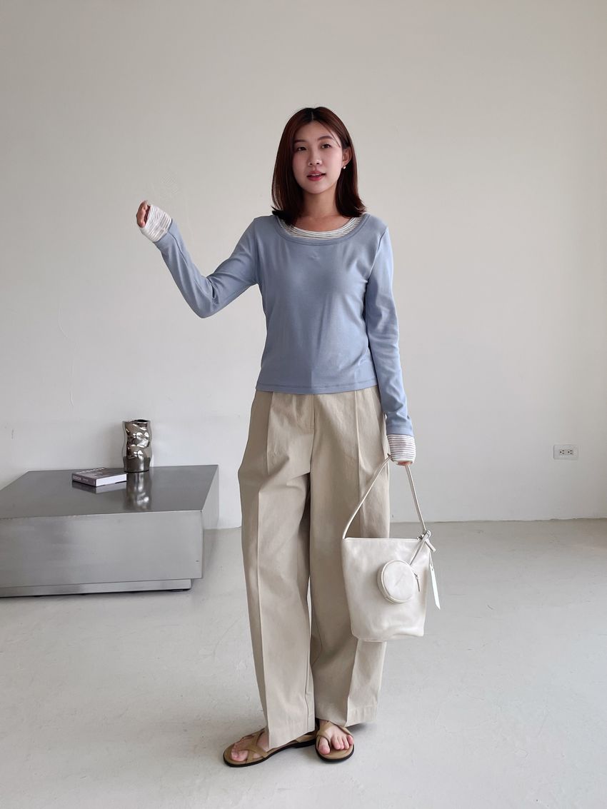 > 條紋領假兩件長T