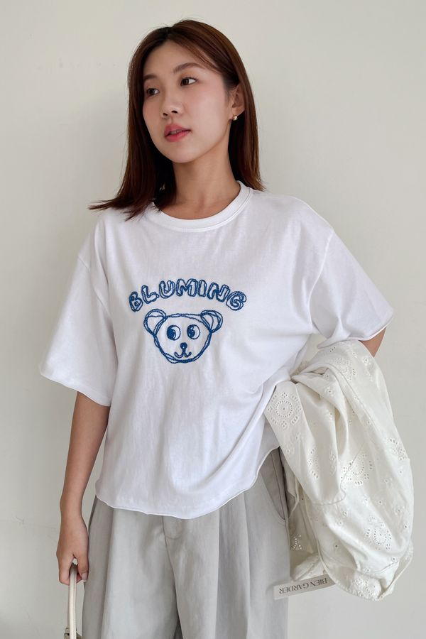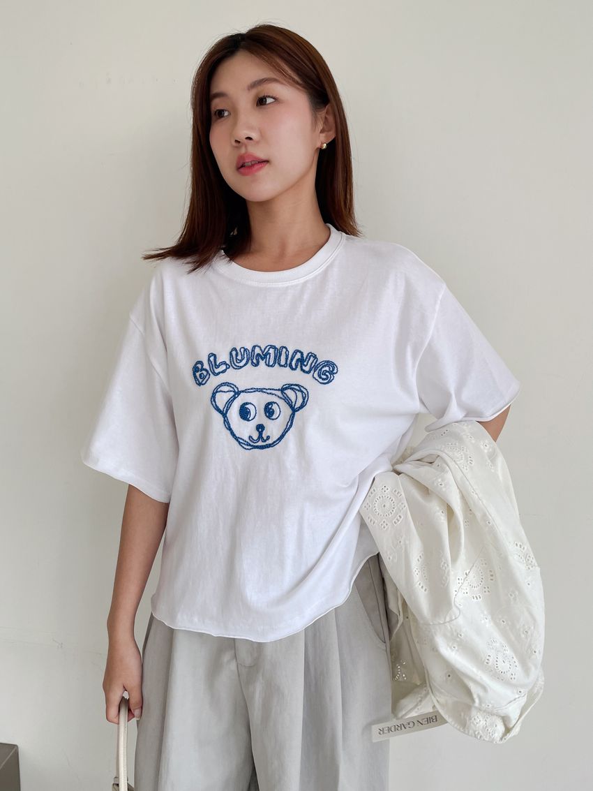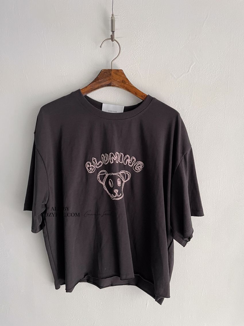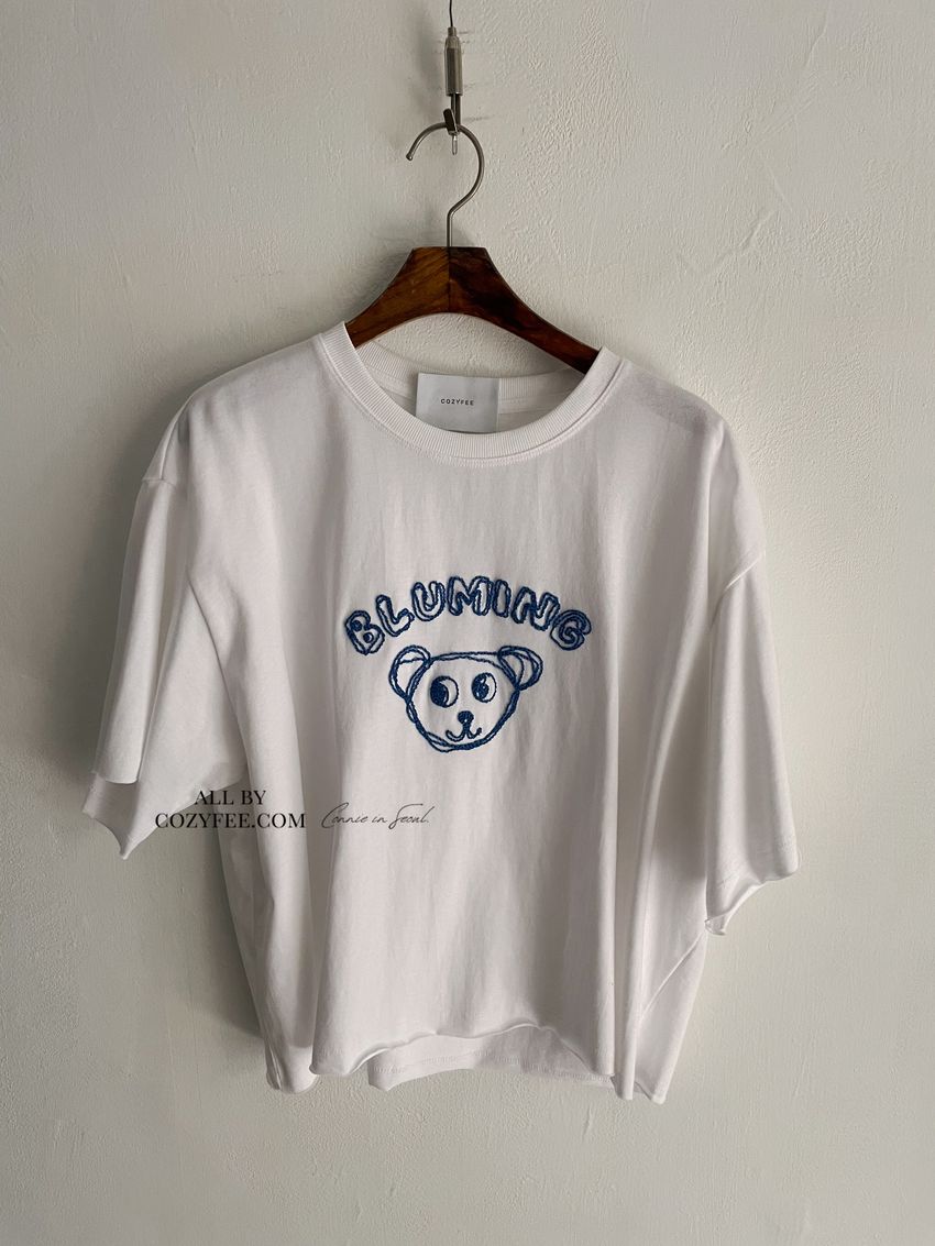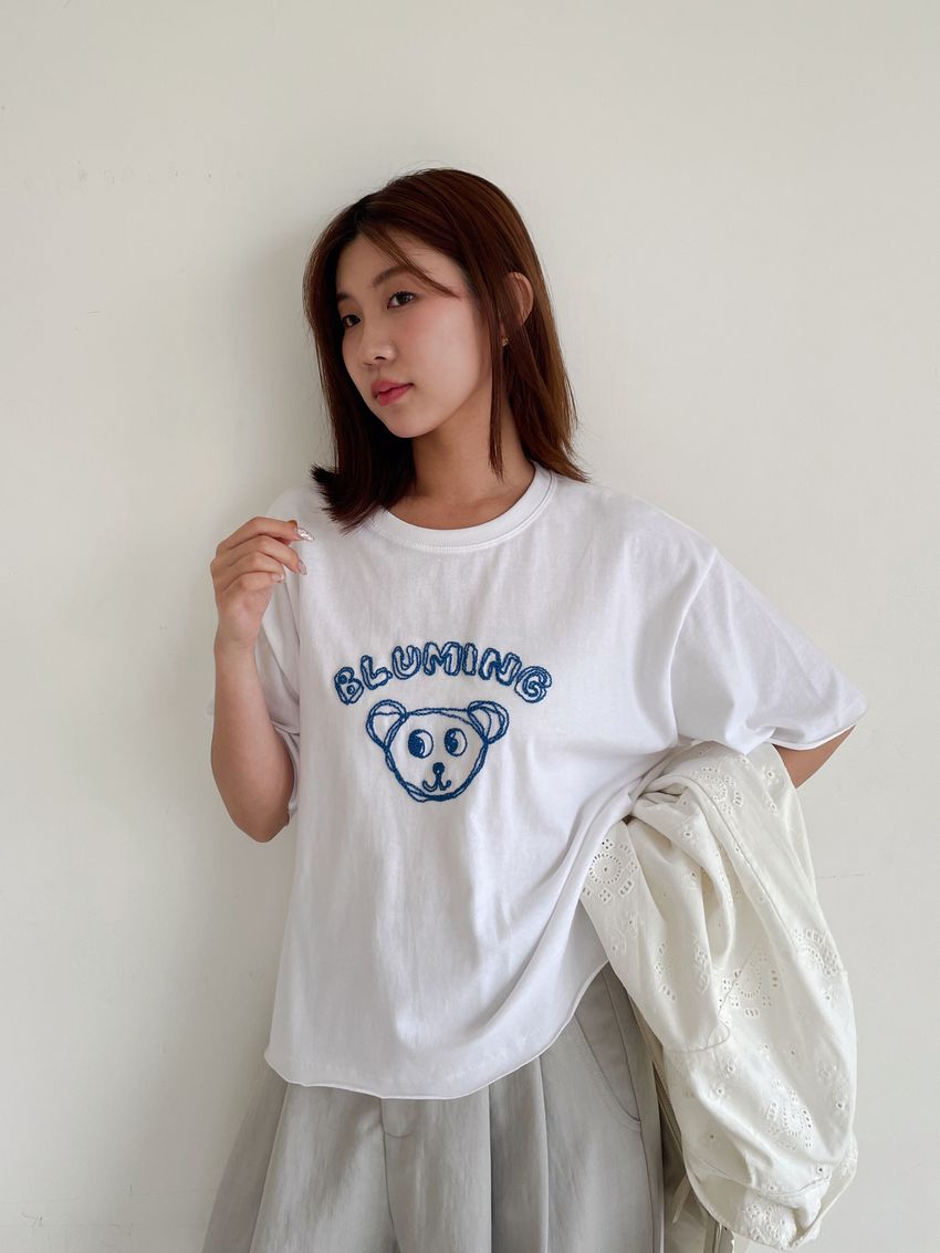 > 小熊刺繡不收邊短T