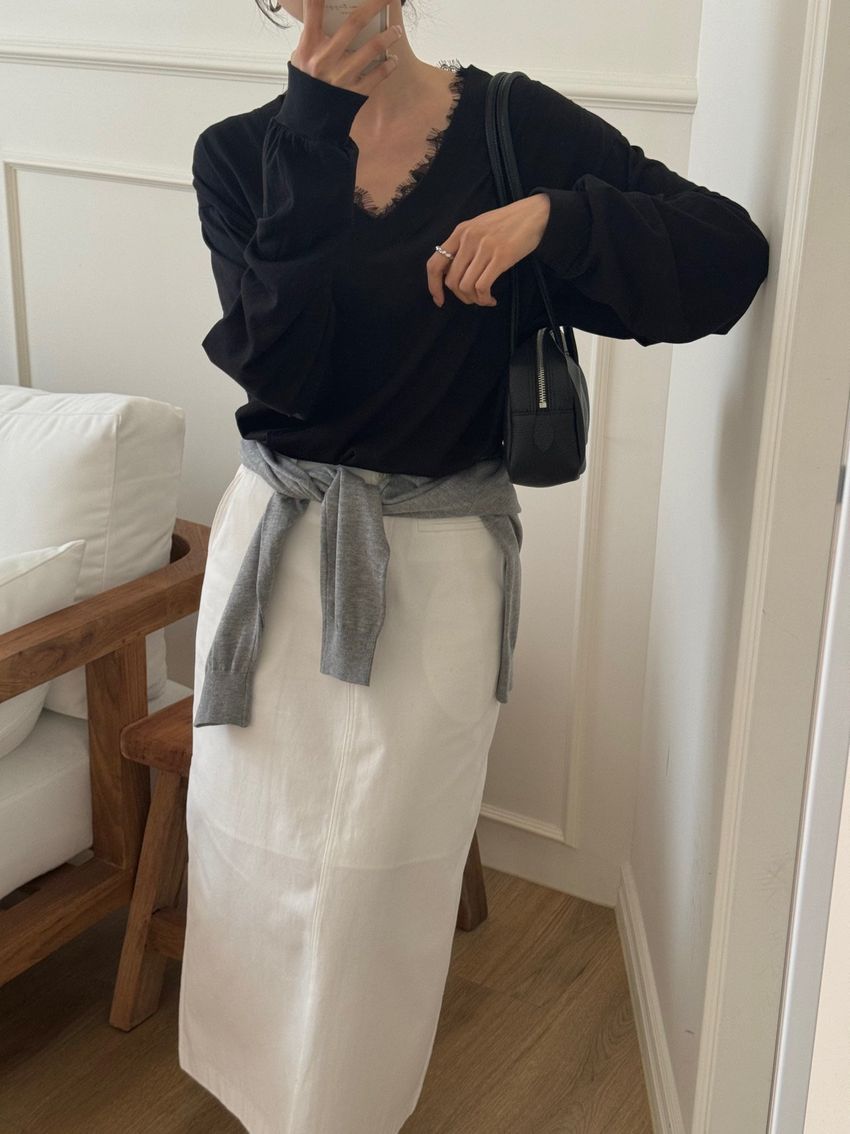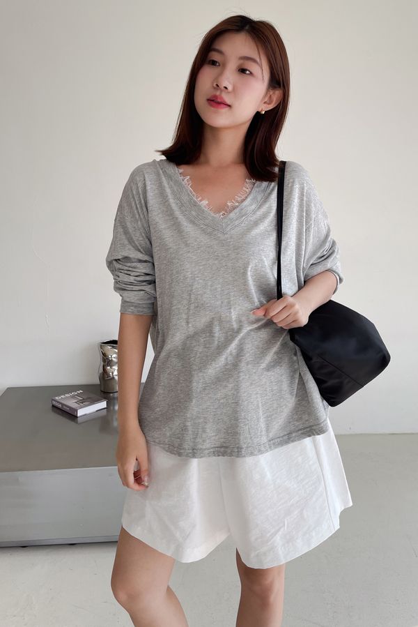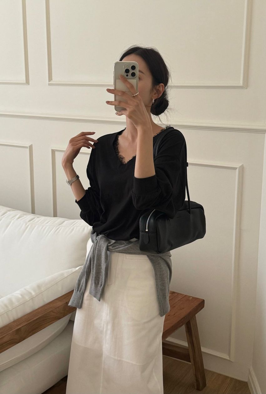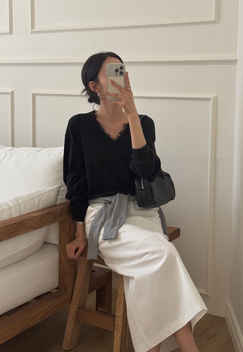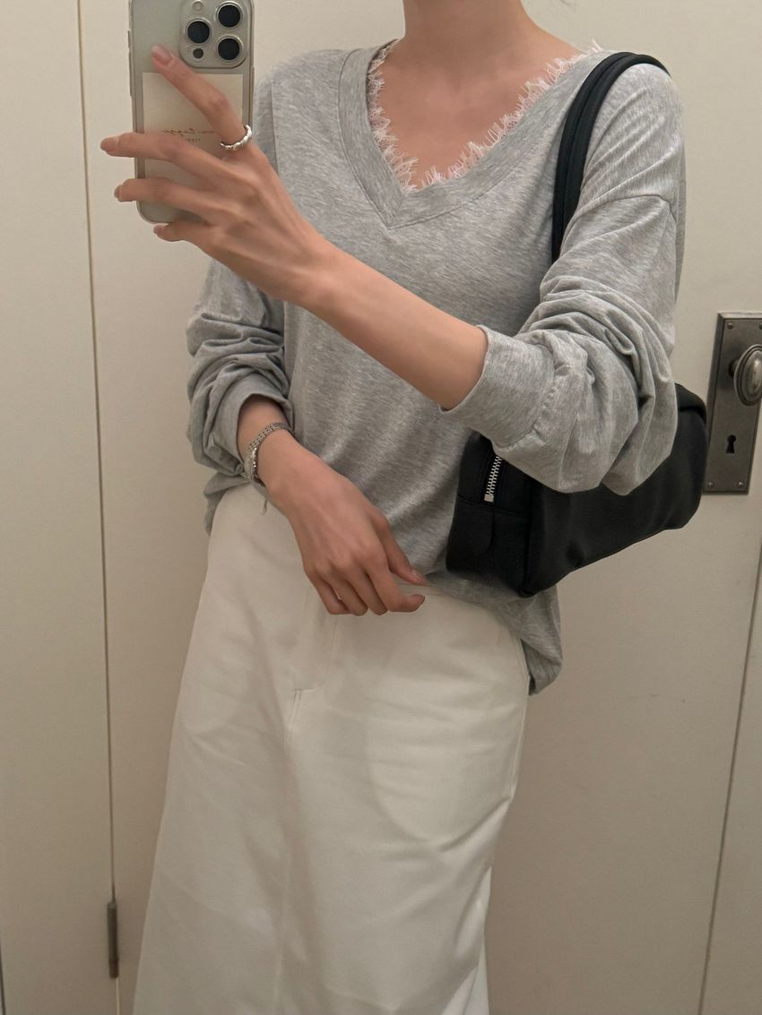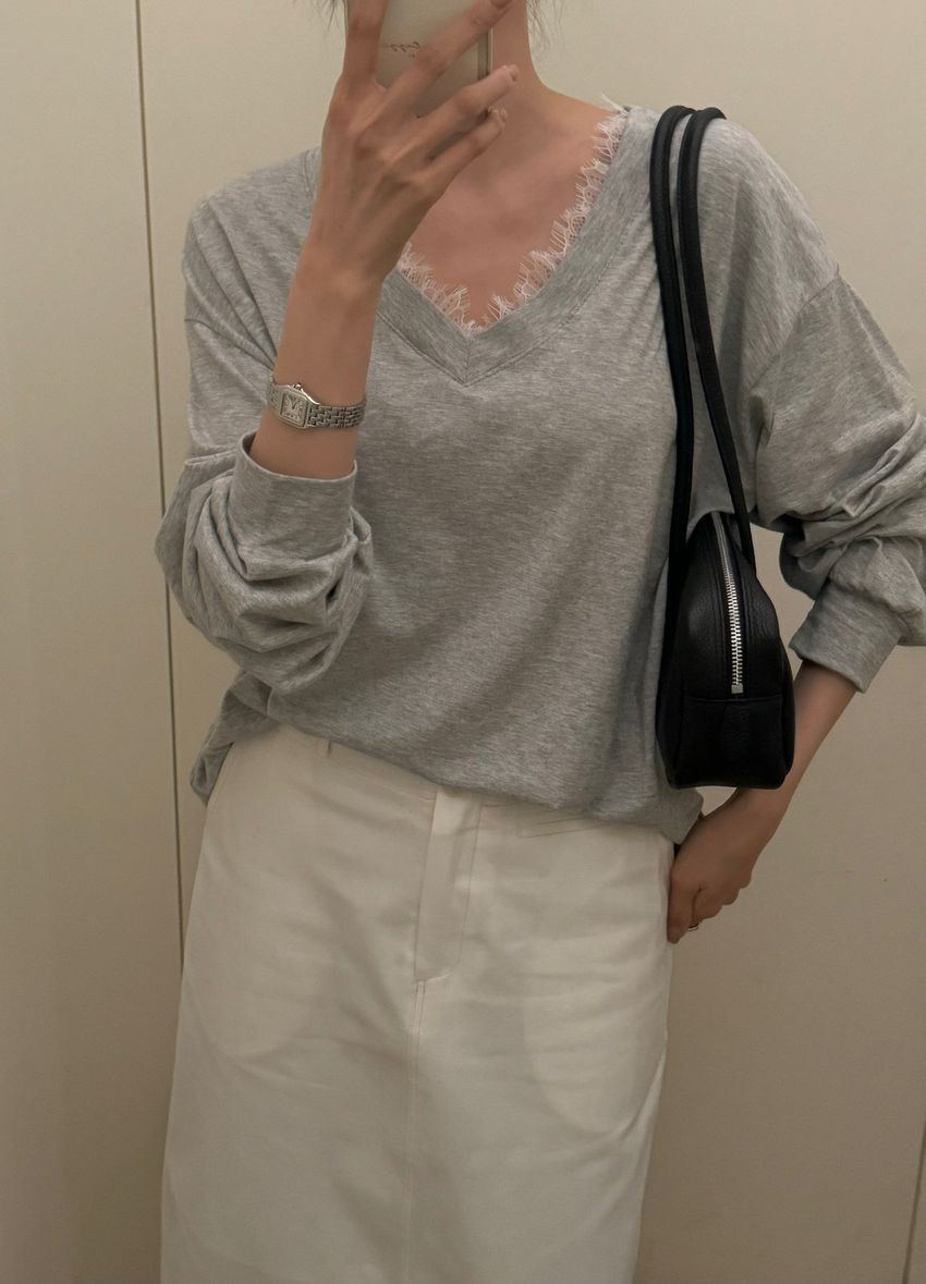 > Connie推薦款!蕾絲V領輕薄長T(直播款)