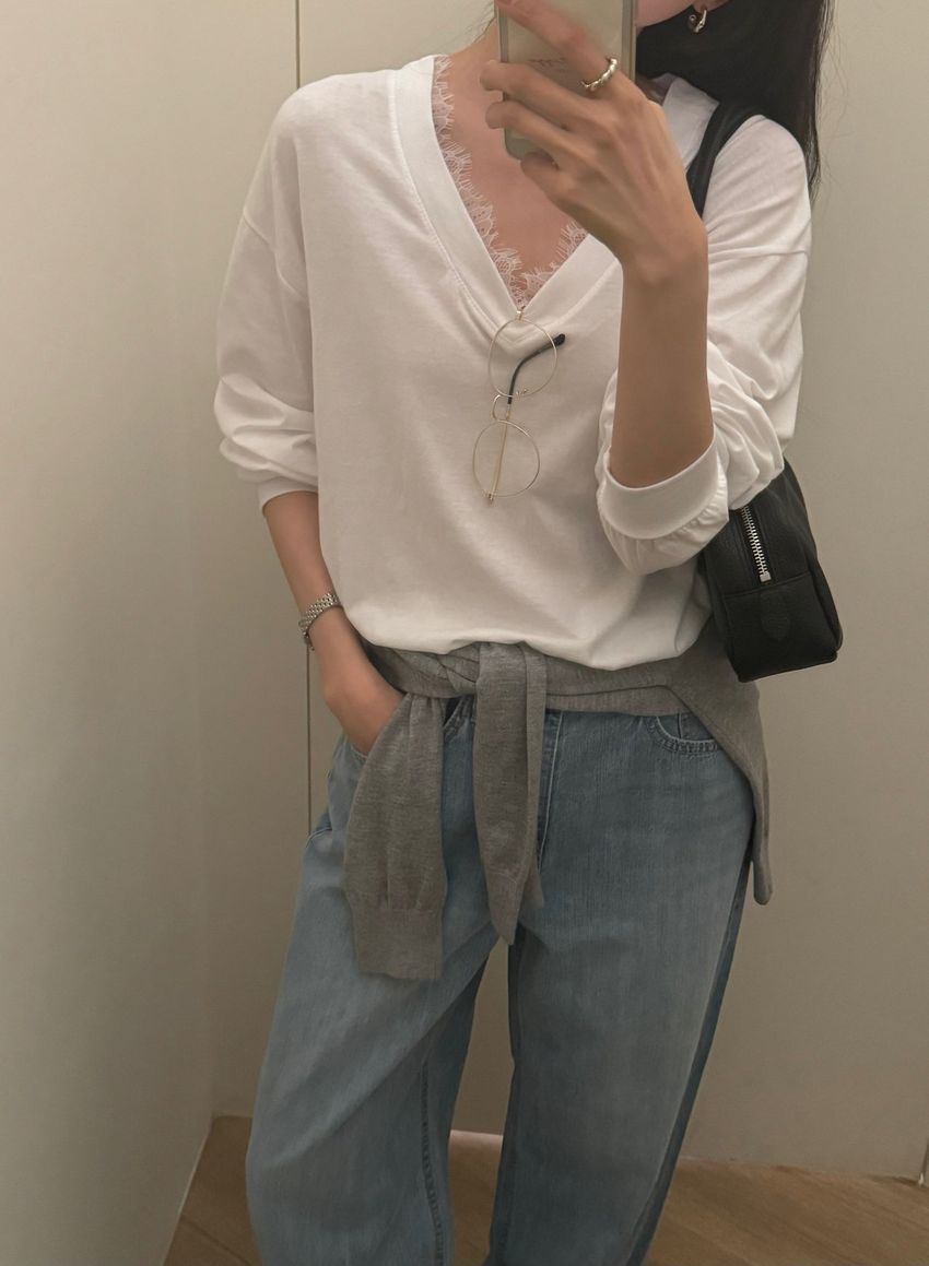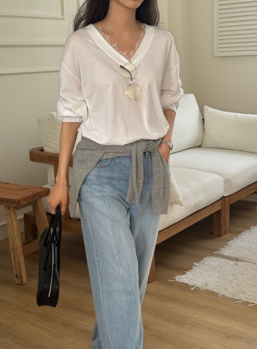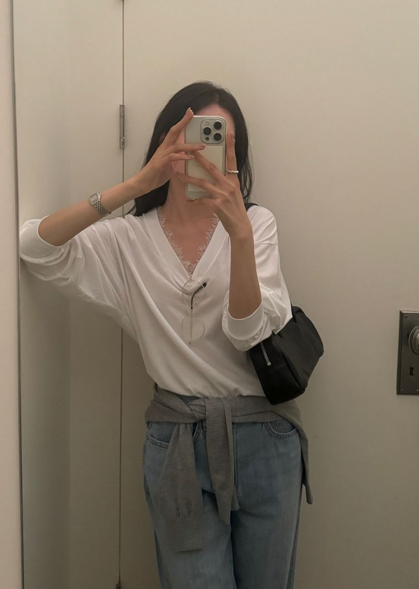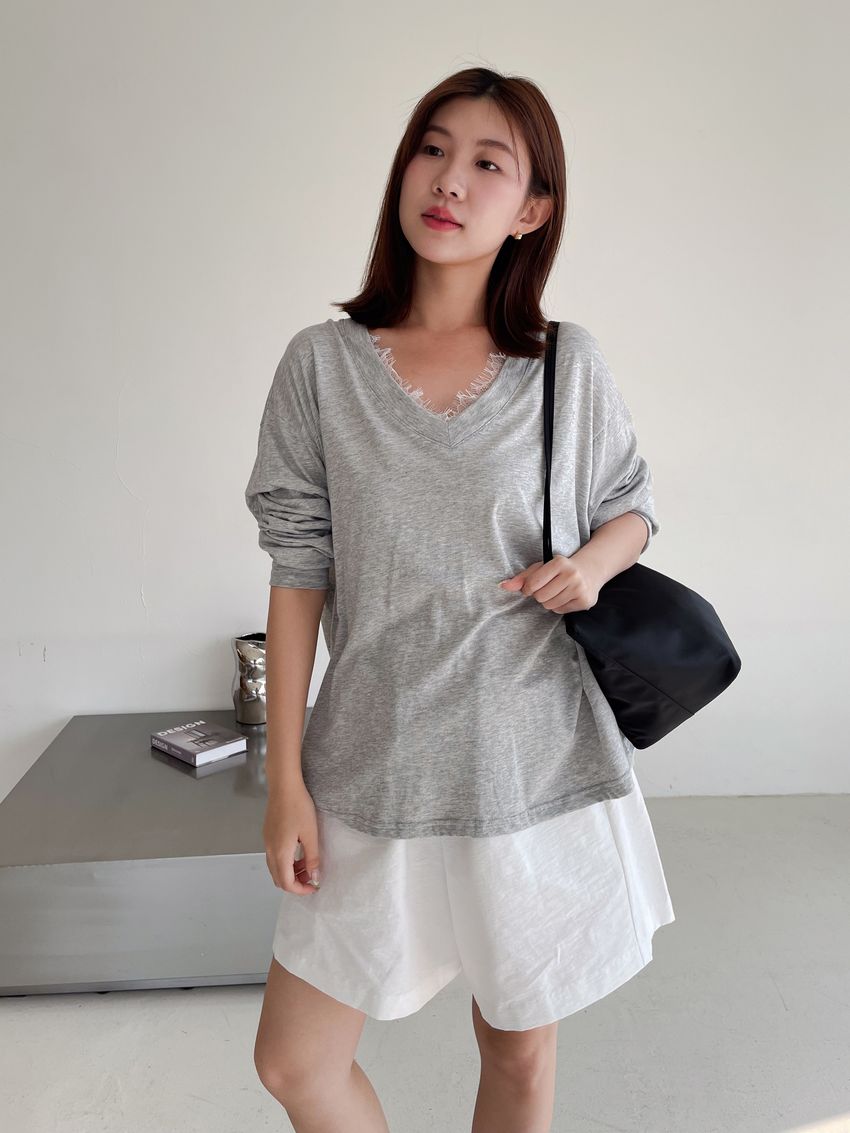 Connie推薦款!蕾絲V領輕薄長T(直播款)